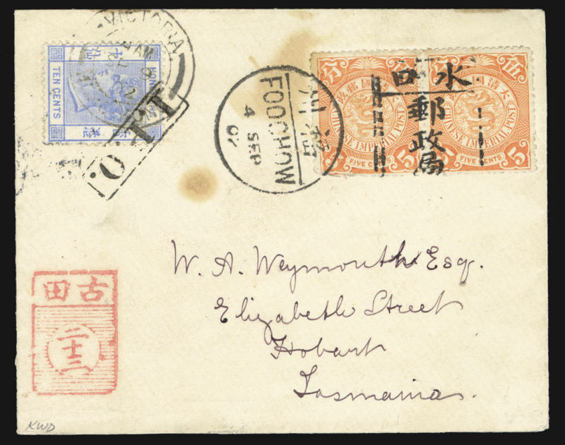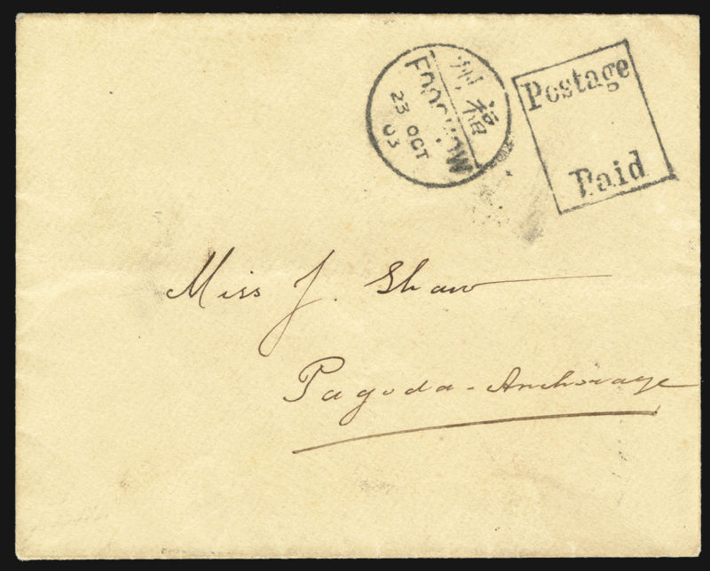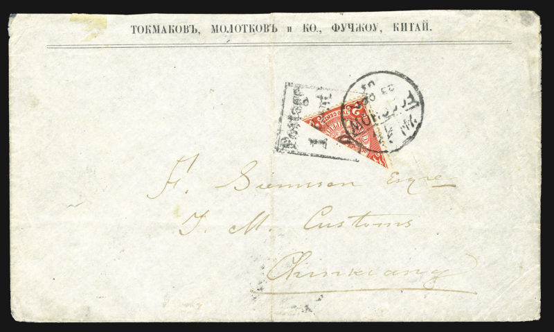 (123) 1903 cover with preprinted "Tokmakov, Molotkov and Co., Foochow, China" in Cyrillic letters, franked with the diagonal half of 2c, tied by framed "Postage 1cent Paid" and Foochow 23 October 03 cancel, addressed to F. Simpson, J.M. Customs