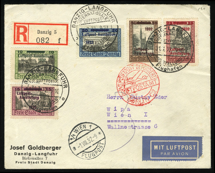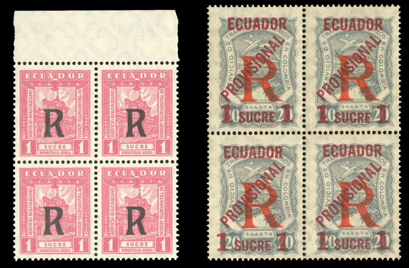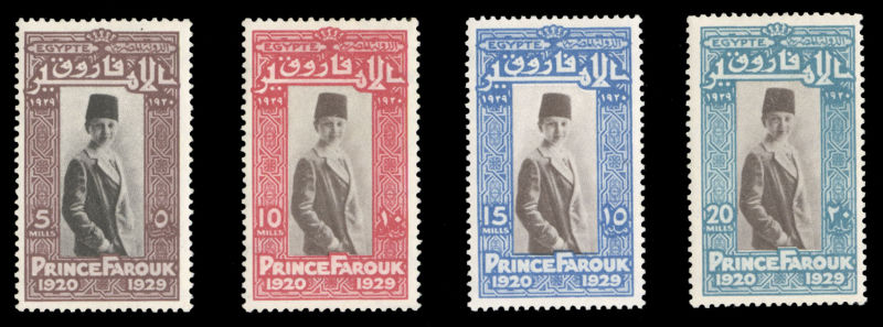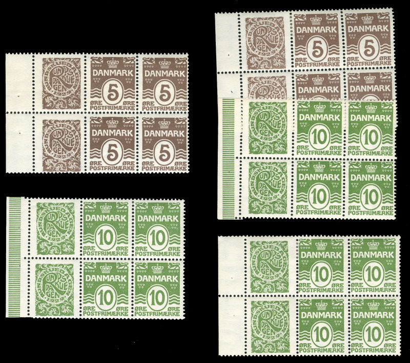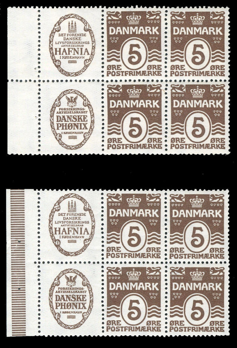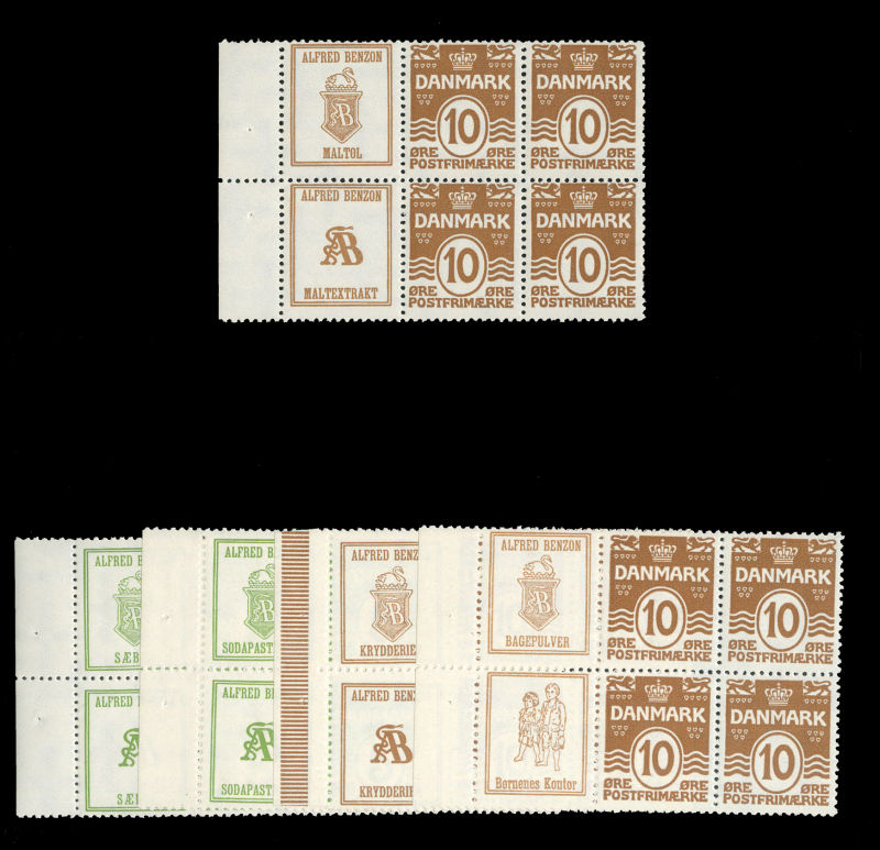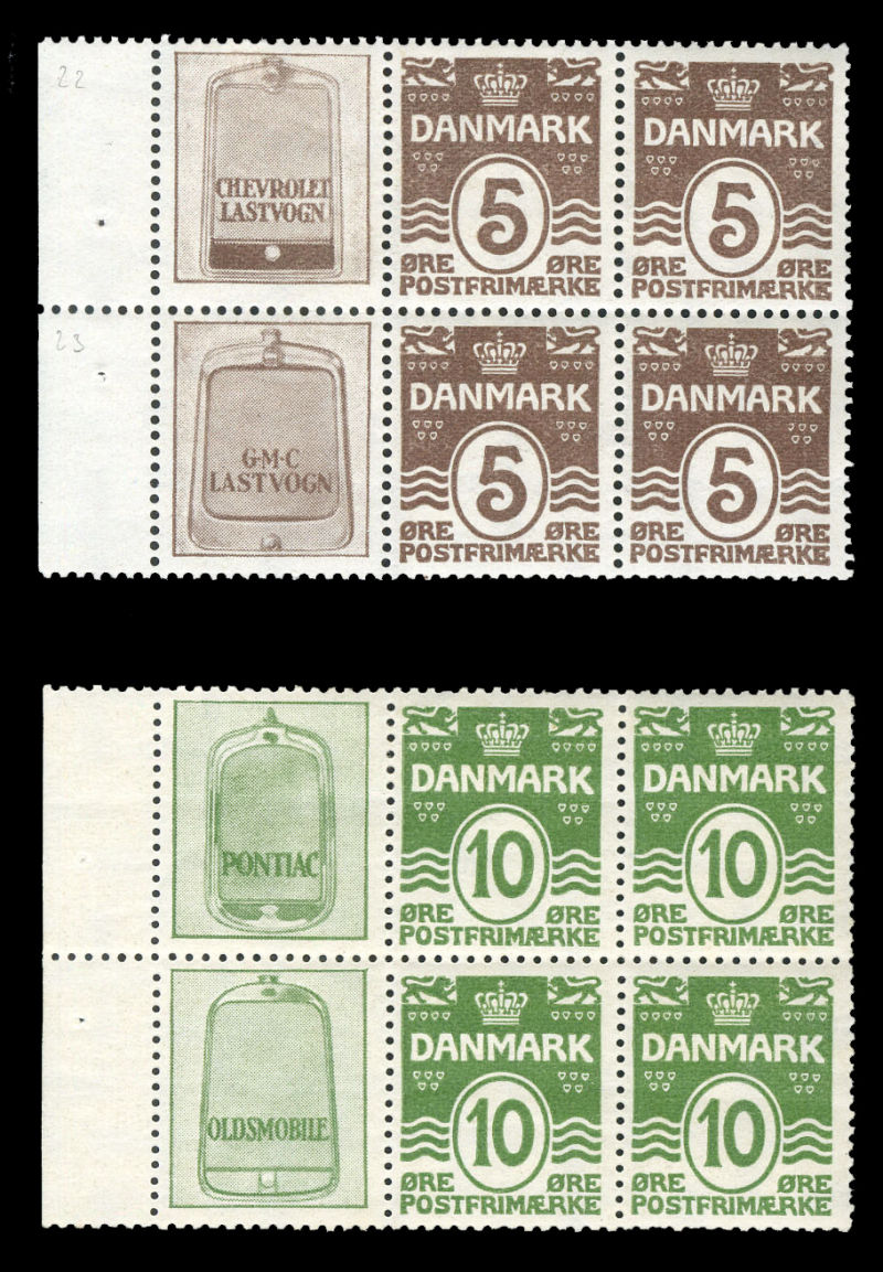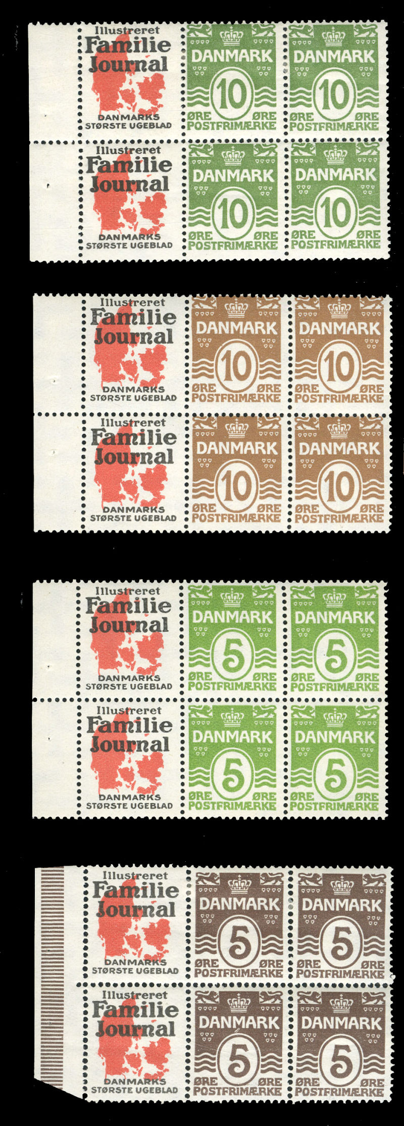 1930 5o brown, 5o green, 10k green, 10o brown, four different booklet panes of four, each with "Familie Journal" advertising labels, two l.h., others n.h., fine-v.f. (Facit HRE35-38, SEK 61,000) (Image)