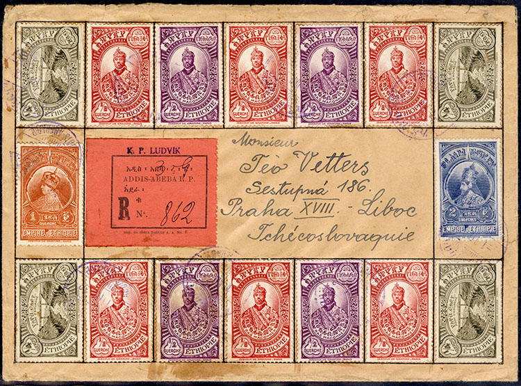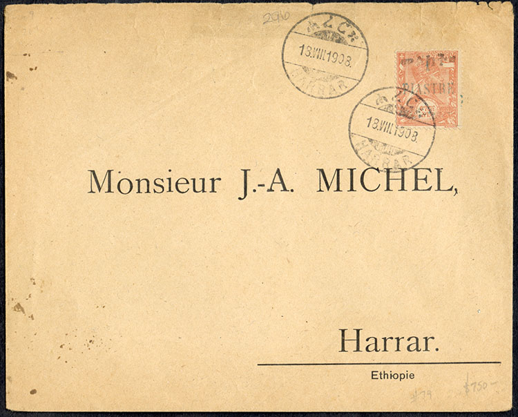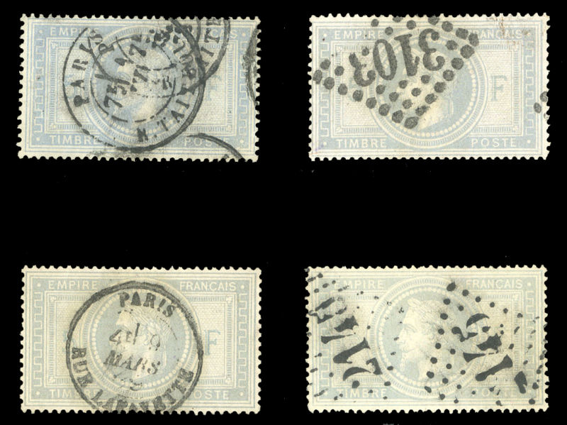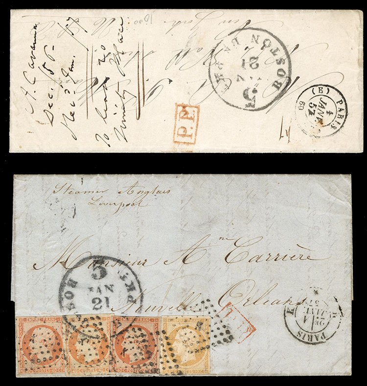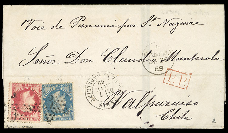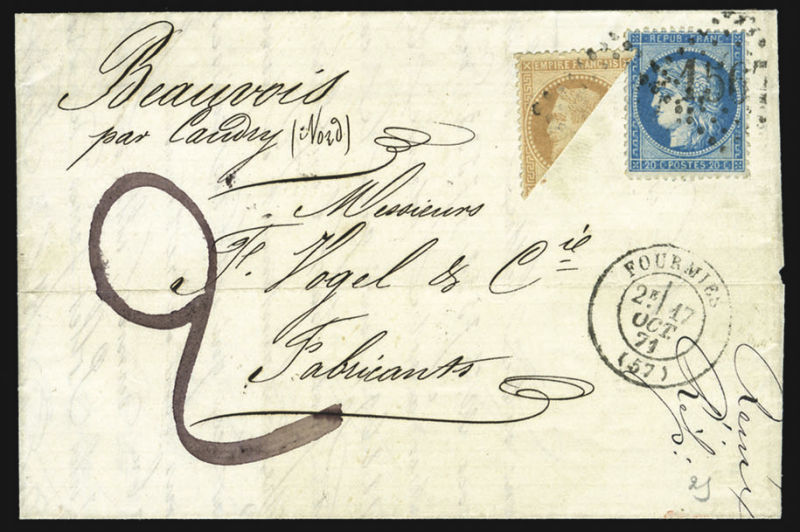 (37) 1863 5fr gray lilac, lavender, horizontal pair, used in combination with 40c orange and vertical pair and strip of three of 80c Ceres (1872-75 issue) on "Charge" cover from Paris (backflap missing, with wax seals cut away from reverse), stamps