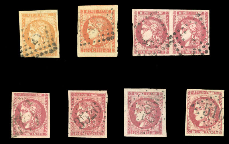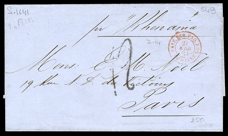 1875 (27 May) late Transatlantic stampless outer FL from New York, with "unpaid" hs, blue "Etats Unis 2 Cherbourg" exchange office mark, "75" (centimes) due in red, also 1872 small cover from Hyers to New York, franked with pair of 30c Empire, tied