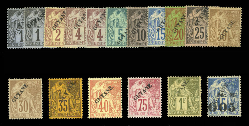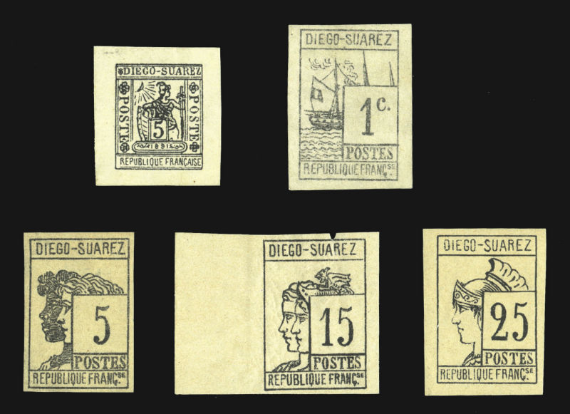 COLONIES Diego Suarez (6-10) 1890-91 1c-25c black, also Sword & Shield 5c black, unused, first and last without gum, others h.r., 15c with a small nick at top margin, otherwise fine-v.f., signed Bernichon, Calves, Brun, etc., with 2016 Calves &