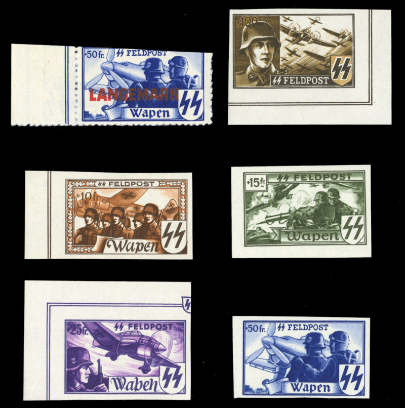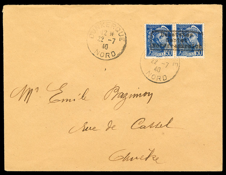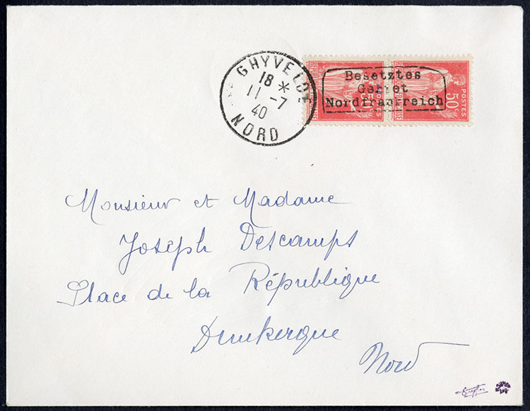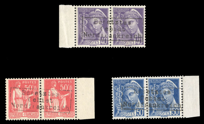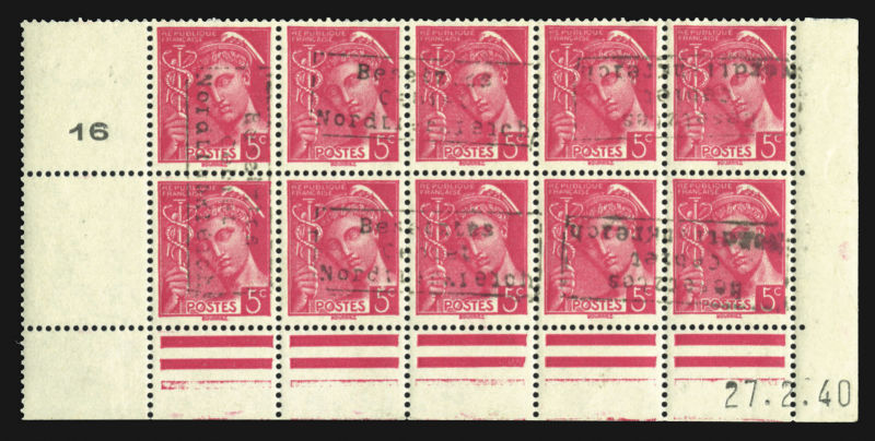 WORLD WAR II OCCUPATION ISSUES Dunkirk (Mi.6 II) 1940 5c rose carmine, overprinted type II, bottom sheet margin block of 10, dated 27.2.40, with numeral "16" at left, configuration of the overprint yields four horizontal and one vertical pair, n.h.,