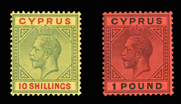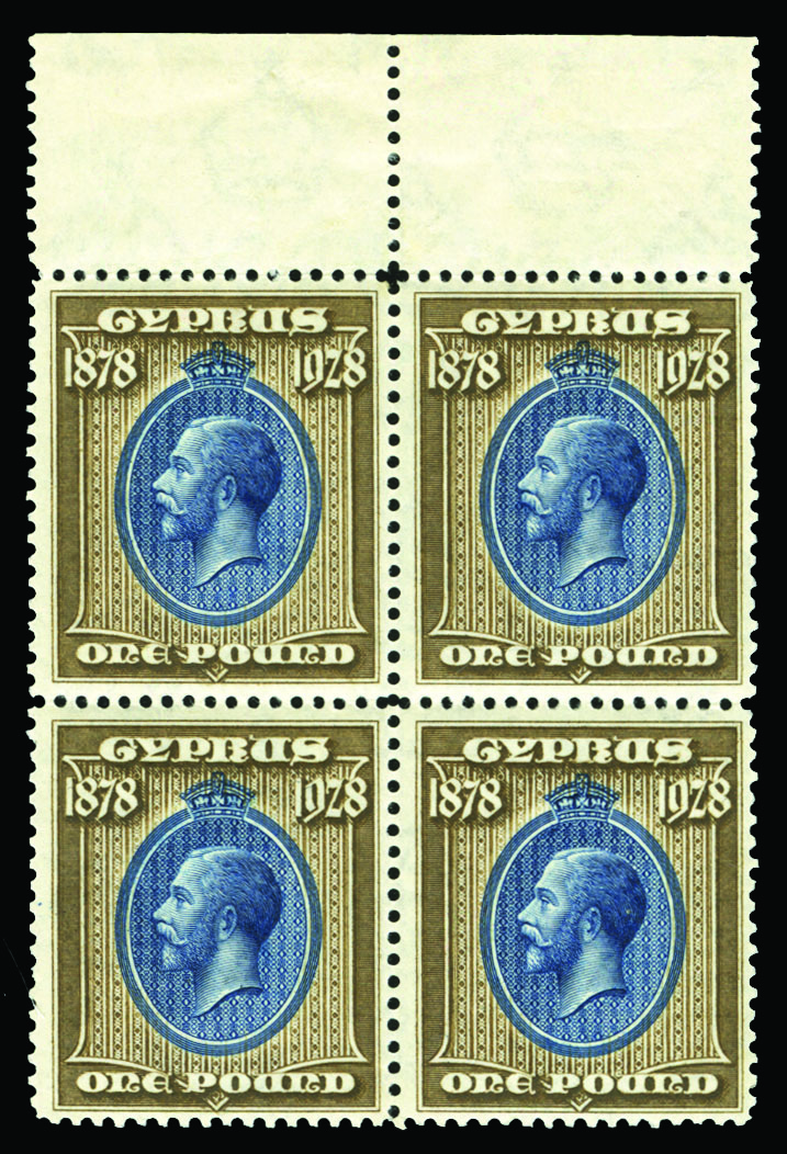 COMMONWEALTH CYPRUS (114-123) 1928 50th Year as a British Colony, complete set in sheet margin blocks of four, most with plate numbers, n.h., fine-v.f. (SG 123-132, ?1,200+ as hinged singles) (Image)