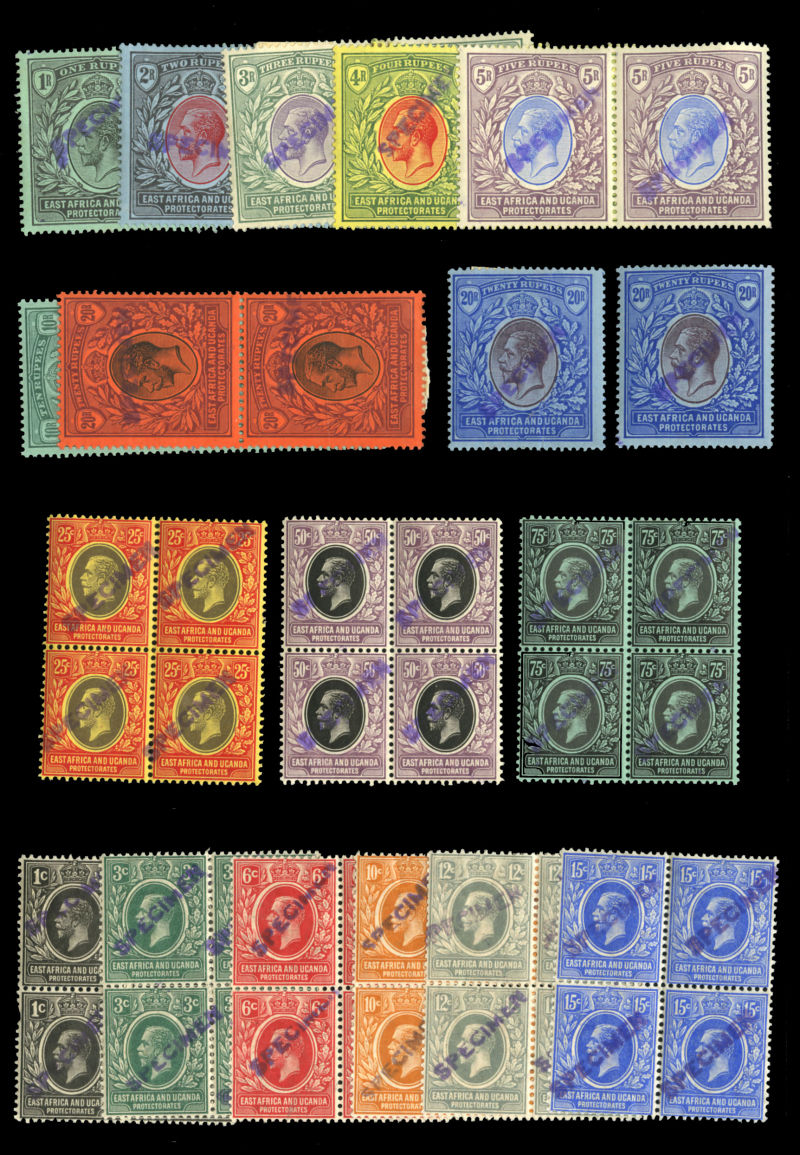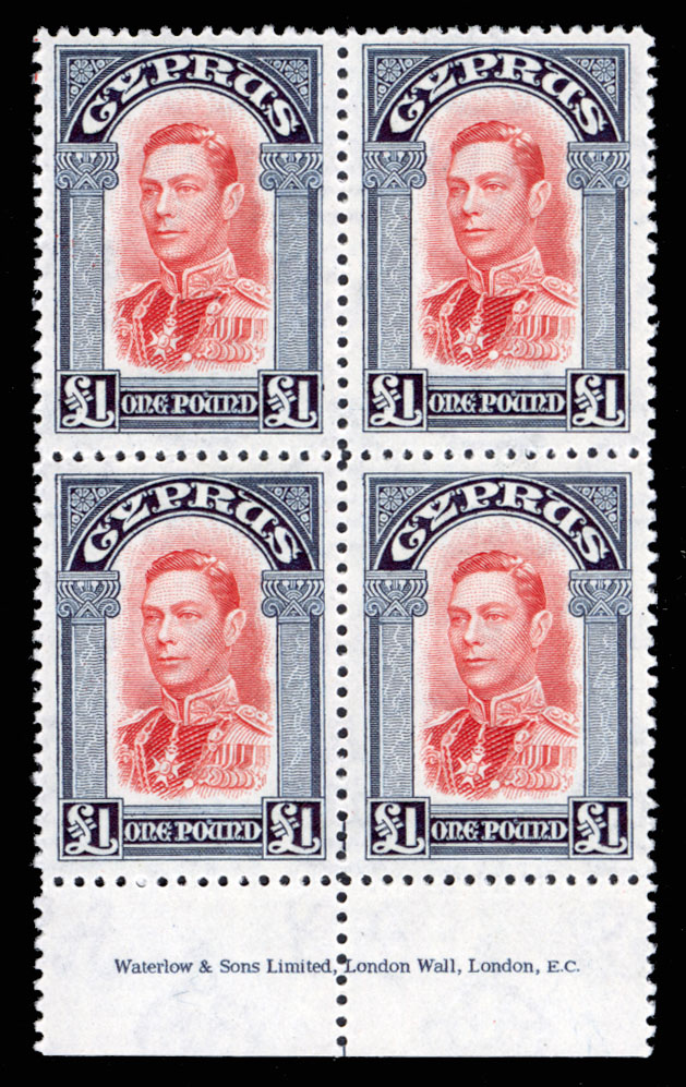 COMMONWEALTH CYPRUS (143/155) 1938-51 George VI definitives, 1/4pi-?1 blocks of four, 13 different, mostly sheet margin (missing 3/4pi, 1 1/2pi carmine rose and 2 1/2pi ultramarine, No.145,147,148), n.h., fine-v.f. (SG 150-52,154-155a,b,156a,157-63,
