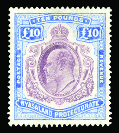 COMMONWEALTH NYASSALAND (11) 1908 KEVII, ?10 ultramarine and lilac, l.h., nicely centered, v.f. example of this rare high value, signed Diena, with 2006 Sorani certificate (SG 82, ?13,000) (Image)