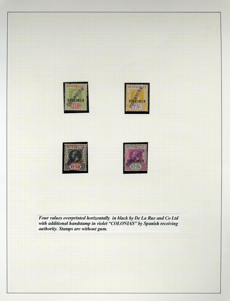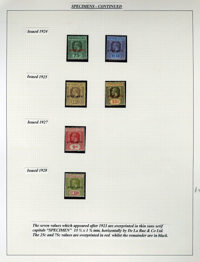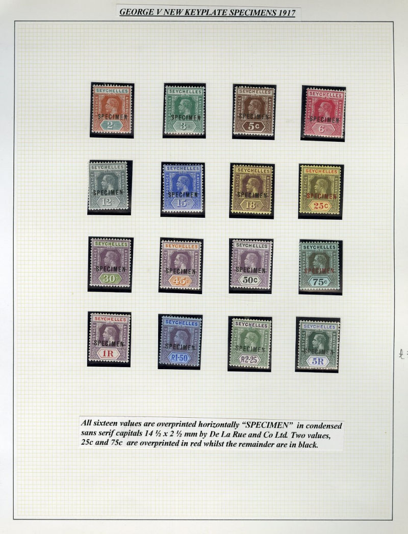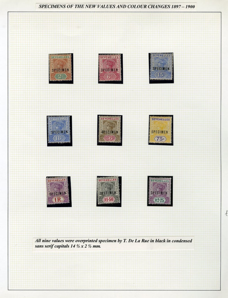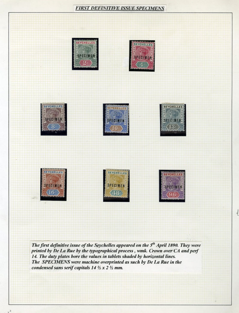 COMMONWEALTH SEYCHELLES 1890-1928 Queen Victoria-George V Specimen overprints, collection of 109 different, with 1890 2c-96c set of eight, 1893 3c, 12c and 45c and 1897-1900 new values and colors set of nine to 2r25, 1893-1902 surcharges, overprinted