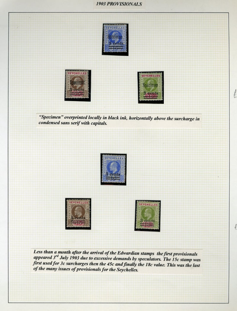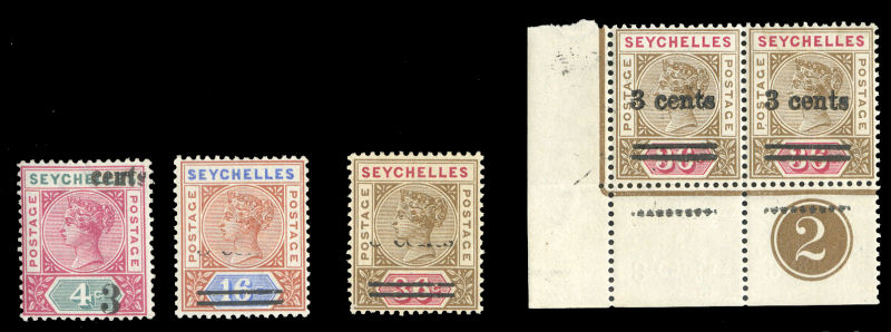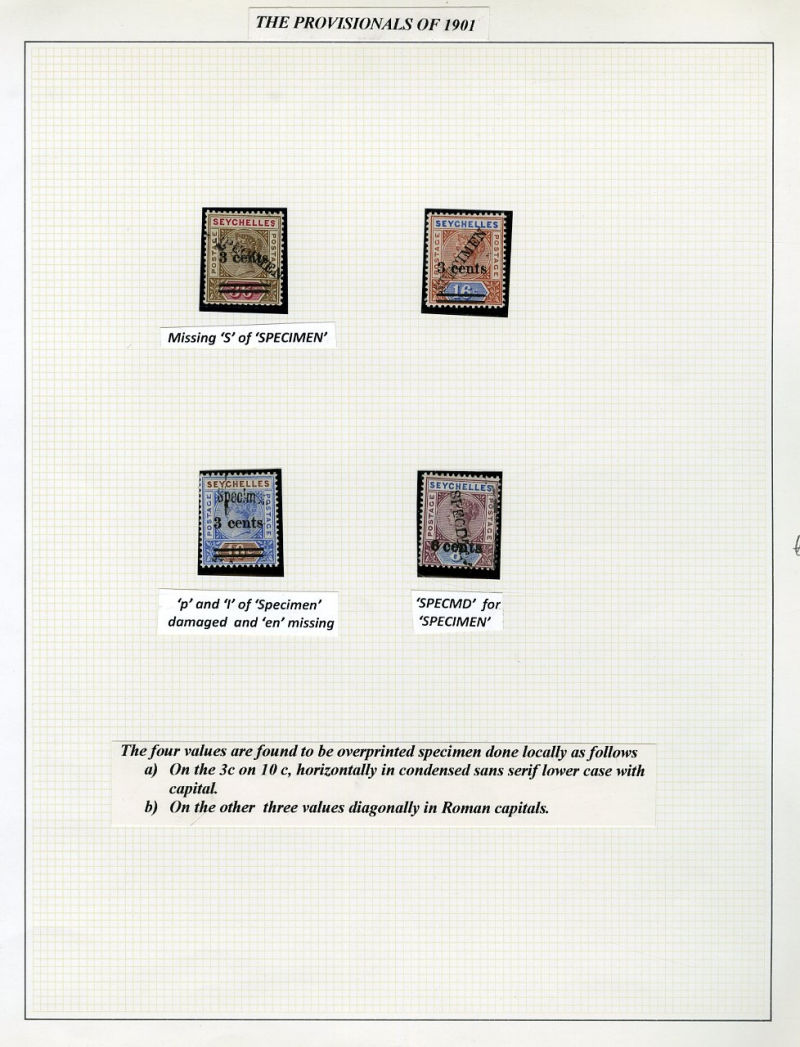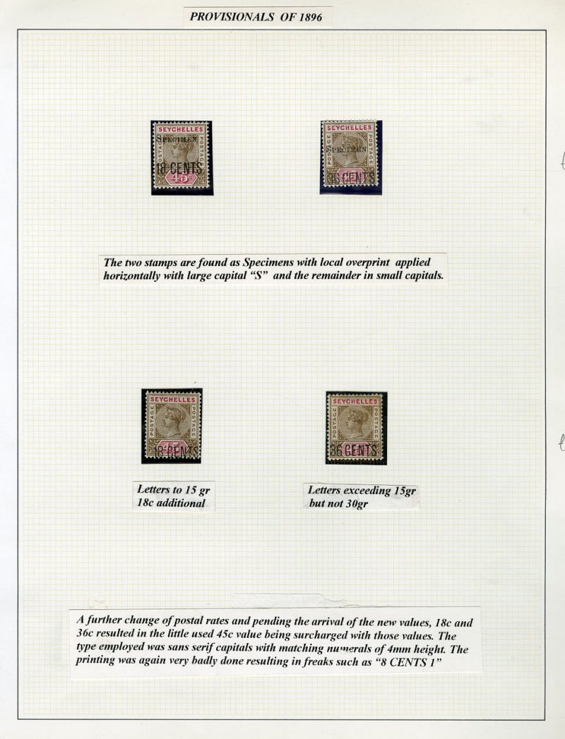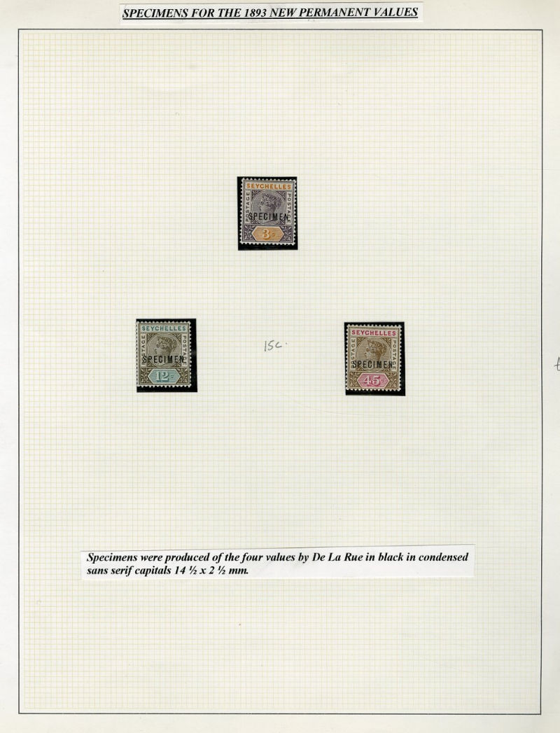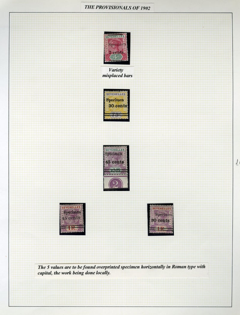 COMMONWEALTH SEYCHELLES 1890-1928 Queen Victoria-George V Specimen overprints, collection of 109 different, with 1890 2c-96c set of eight, 1893 3c, 12c and 45c and 1897-1900 new values and colors set of nine to 2r25, 1893-1902 surcharges, overprinted