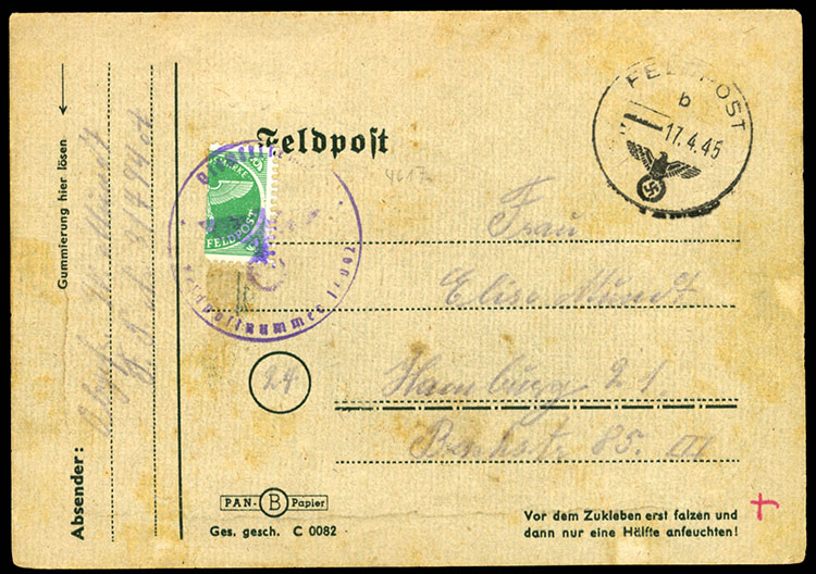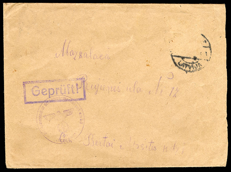 German Occupation during World War II 1942 cover from Concentration Camp Salaspils, addressed to Mazsalaca, showing part of departure pmk, stamp was removed, as censors looked for messages hidden under the stamps, handstamped "Gepruft", with military