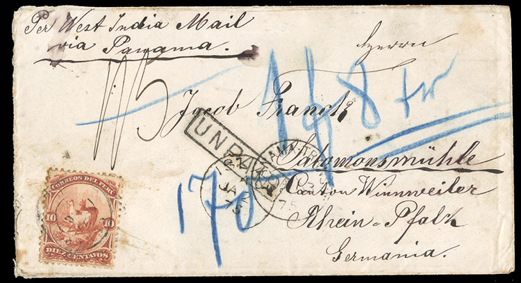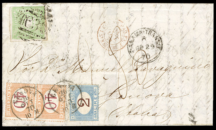 1870 FL from Lima, franked with 1d green, tied by "C3" duplex, with "Panama Transit" and French Packet St. Nazaire entry in red, charged 2.80 Lire on arrival in Genova, with Italian 2x40c and 2L postage dues, octagonal "Panama PA. Fr. No.1", Callao,