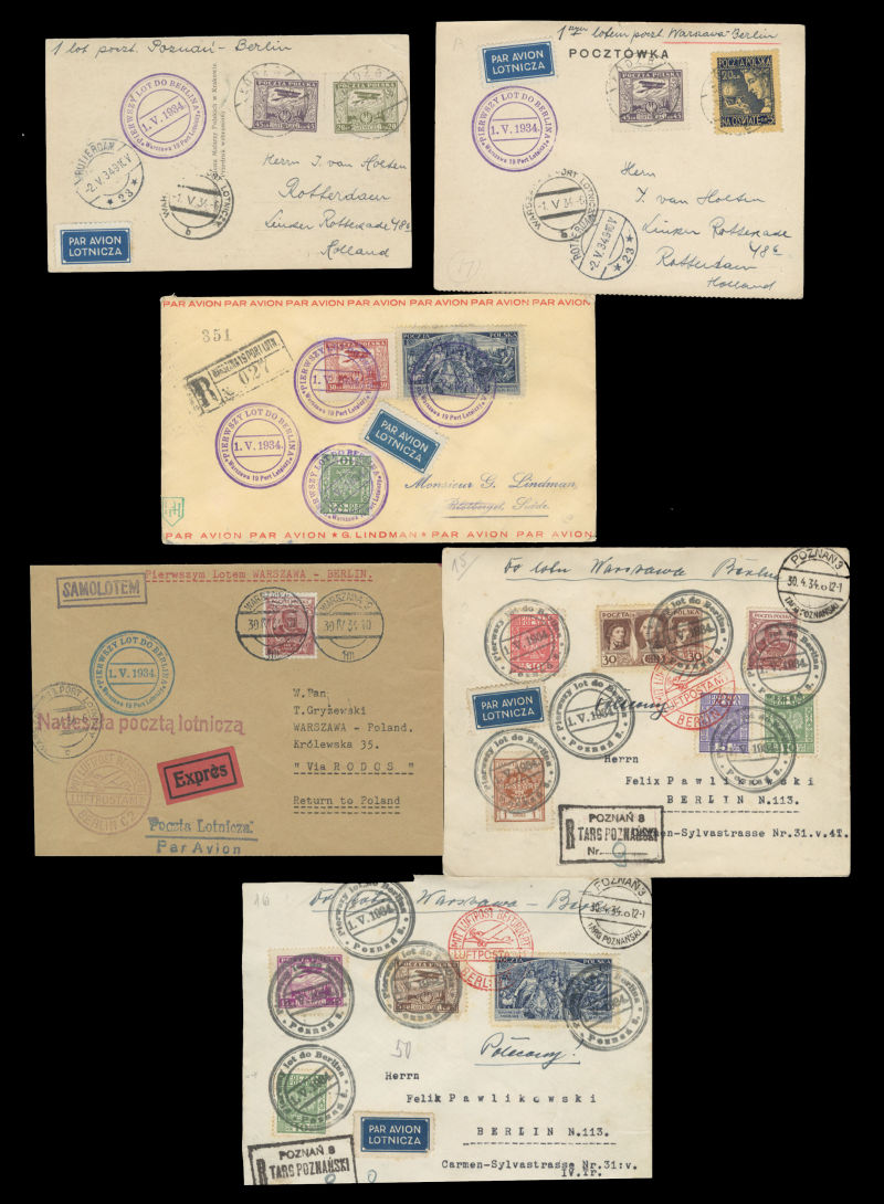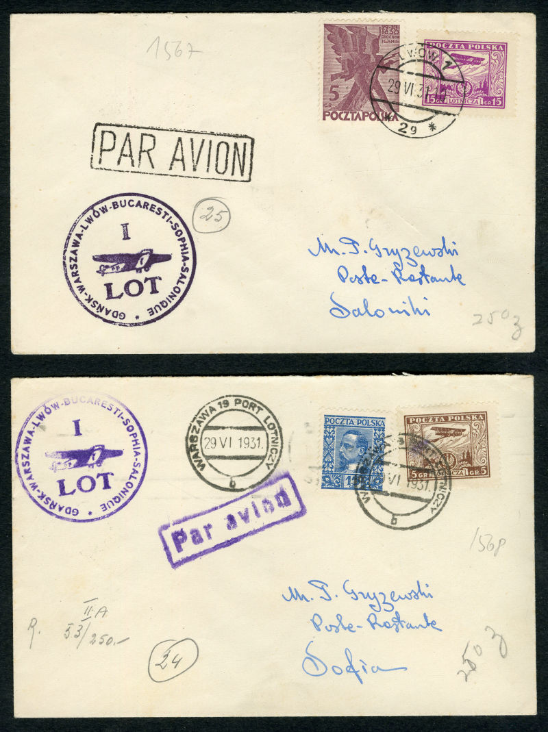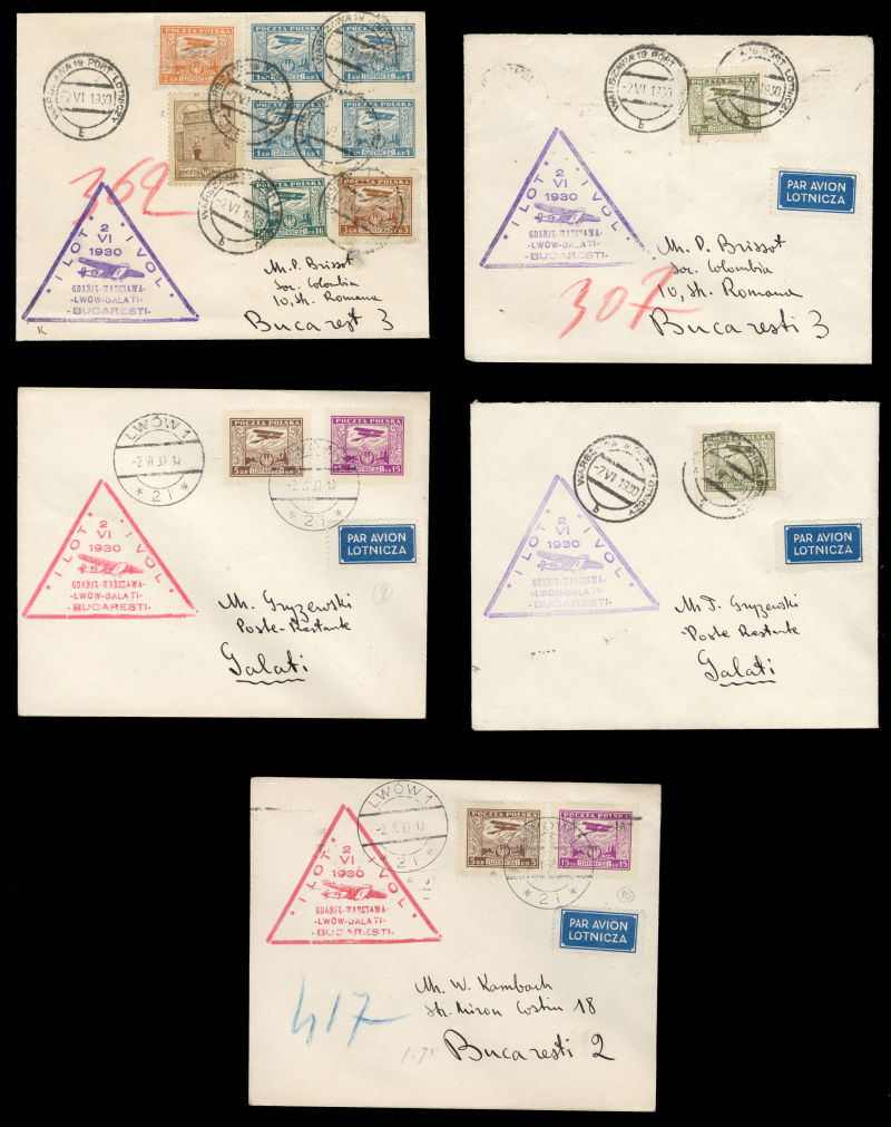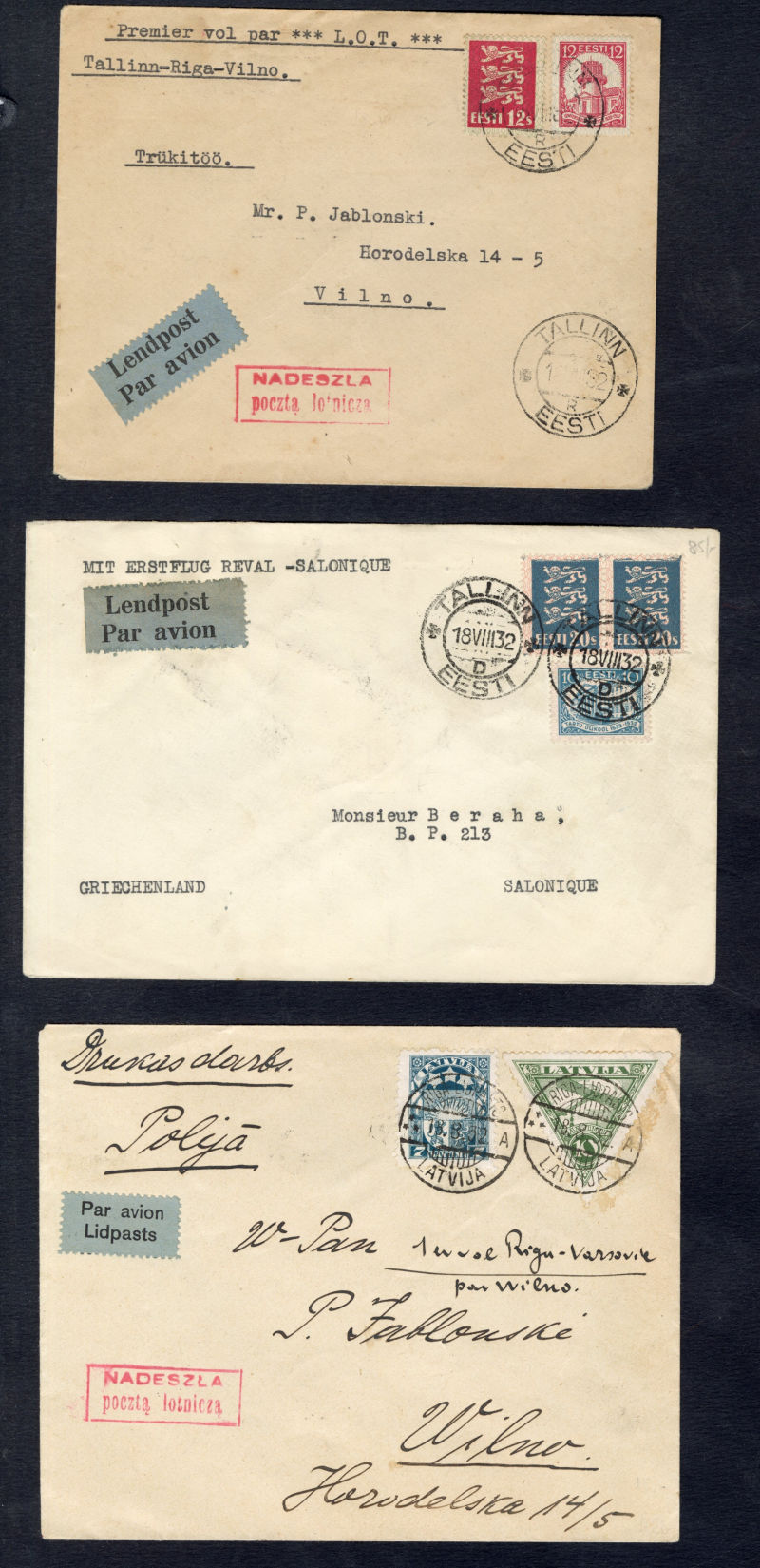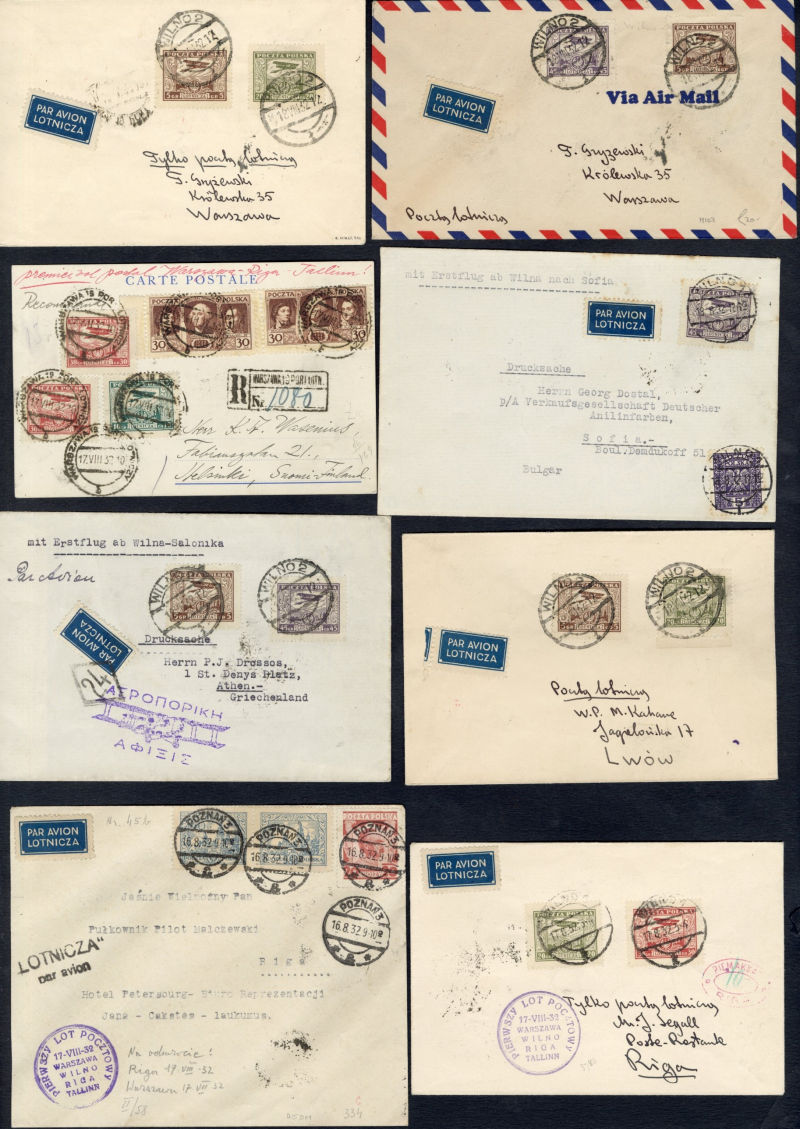 Flight Covers 1932 (16 Aug) Warszawa-Vilnius-Riga-Tallinn, group of 11 covers or cards, Wilno-Warszawa, Wilno-Lwow, Tallinn-Riga-Wilno, Riga-Wilno, Tallinn-Salonika, Wilno-Athens, Wilno-Riga, Wilno-Sofia, Warszawa-Helsinki, Poznan-Riga, minor