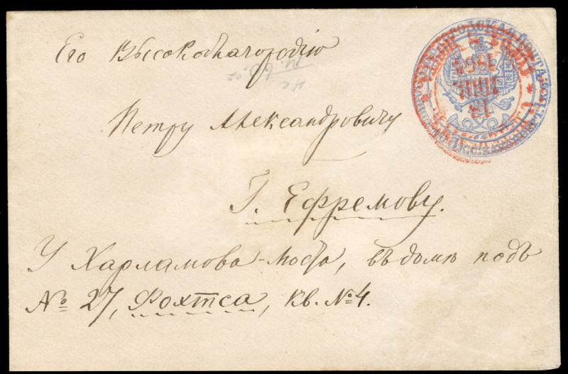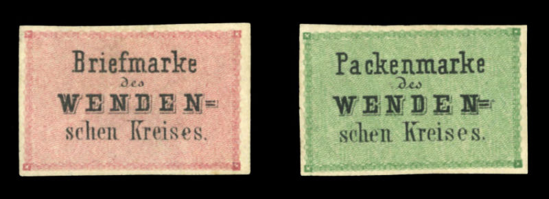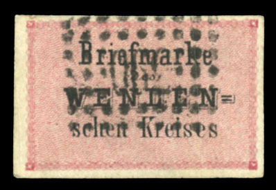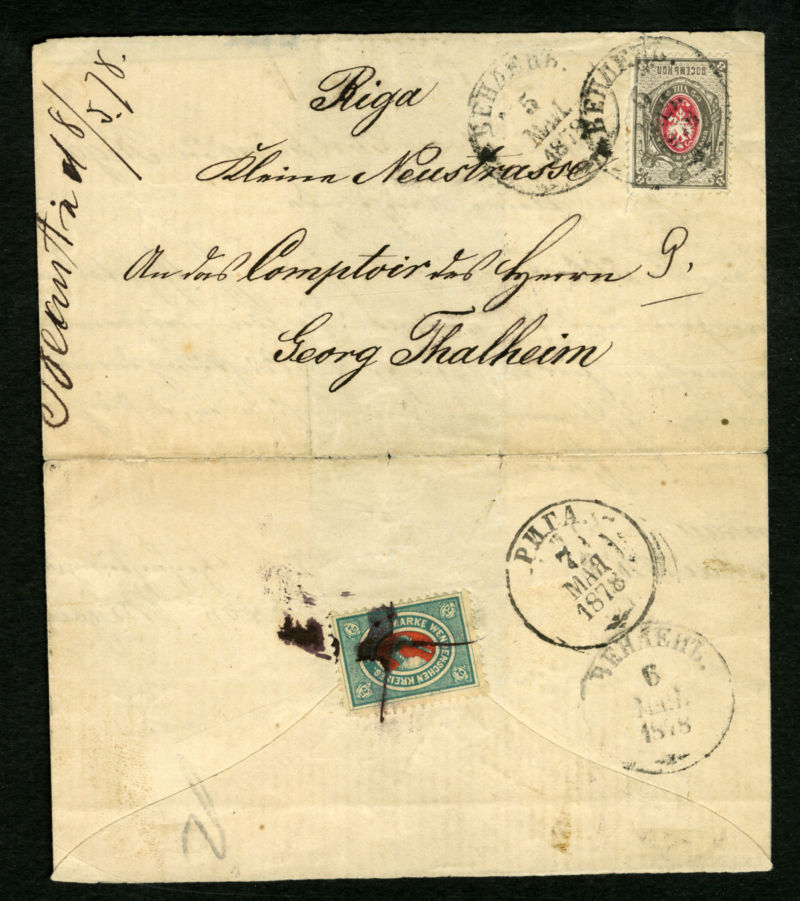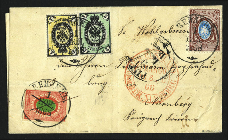Riga (3 June) to Nurnberg, red "Aus Russland Franco" foreign mail pmk, plus additional departure and arrival (13 June - Julian calendar) pmks on back, v.f. and spectacular cover, one of only a few known mixed Wenden+ Russia mixed frankings sent