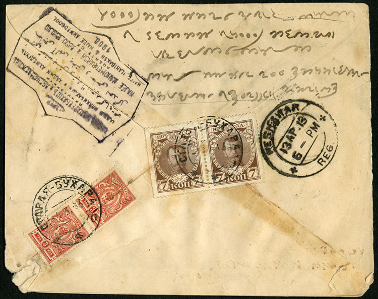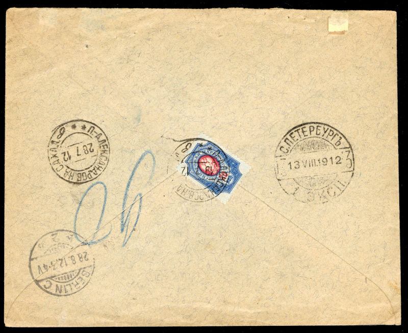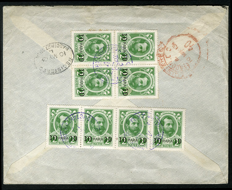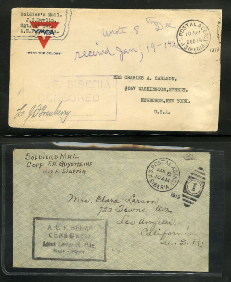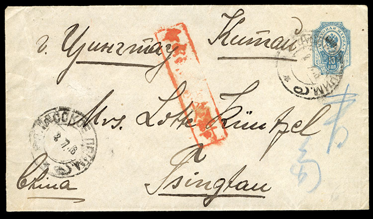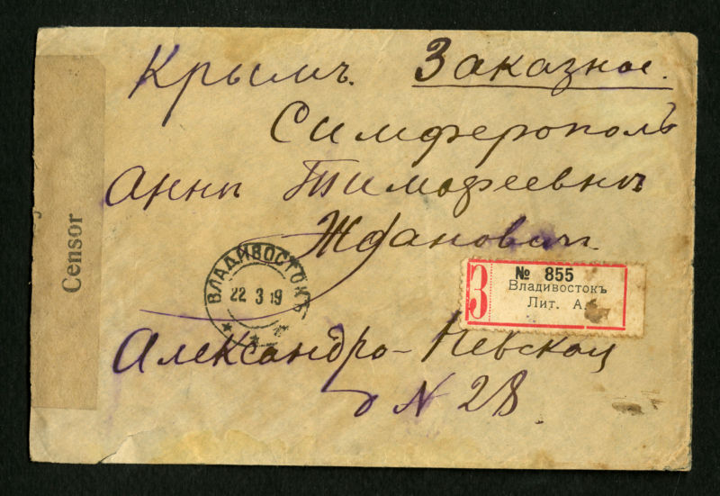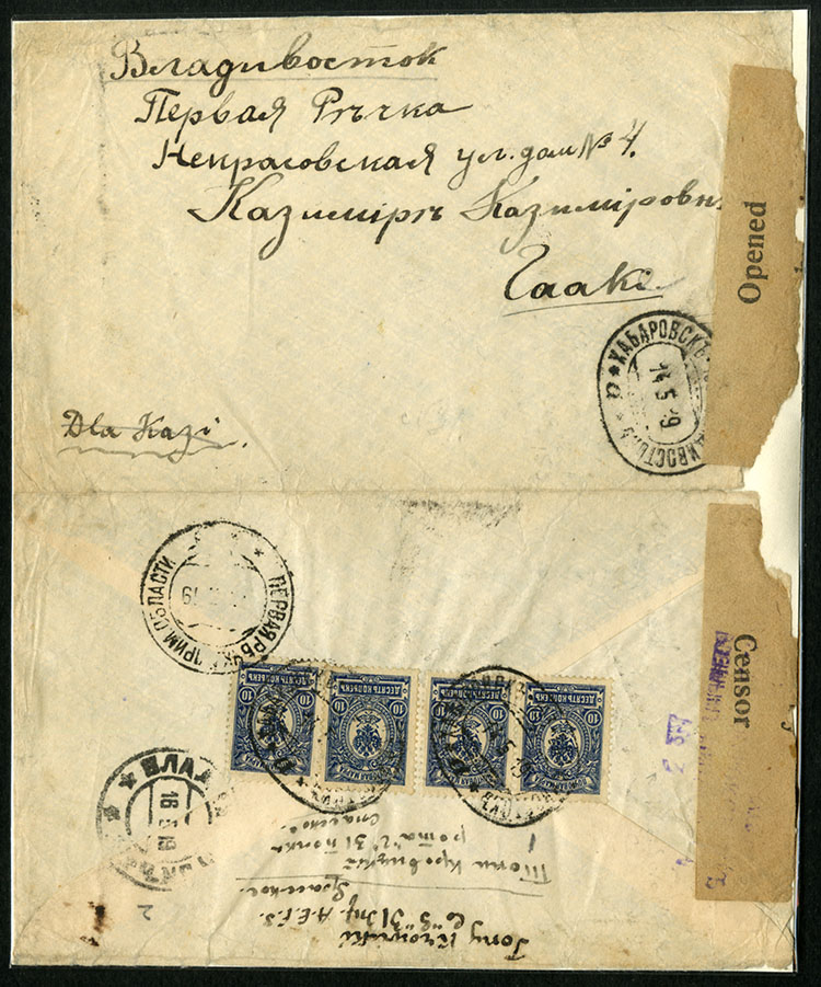 British "Opened by Censor" label and four-line Vladivostok military censor 21 cachet, plus Manila arrival pmks on back, filing folds, interesting usage from member of the U.S. Red Cross, via British and Russian censors to Manila (Image)
