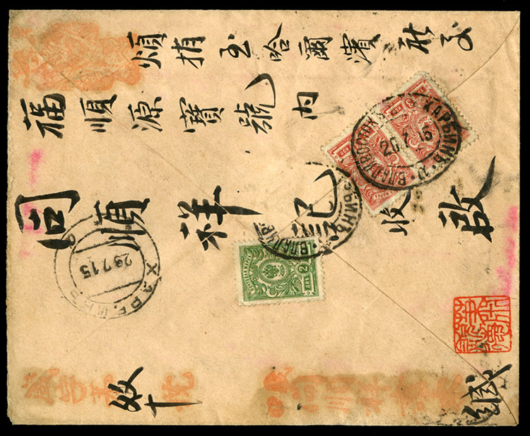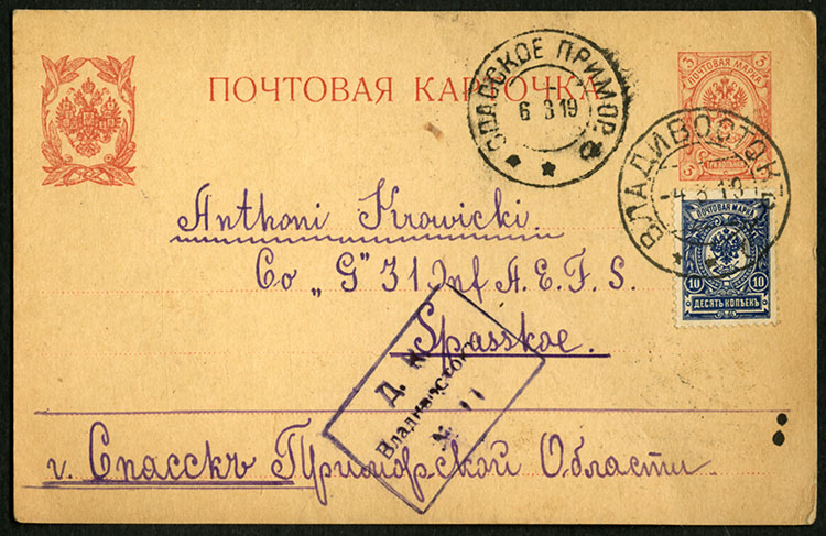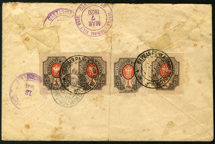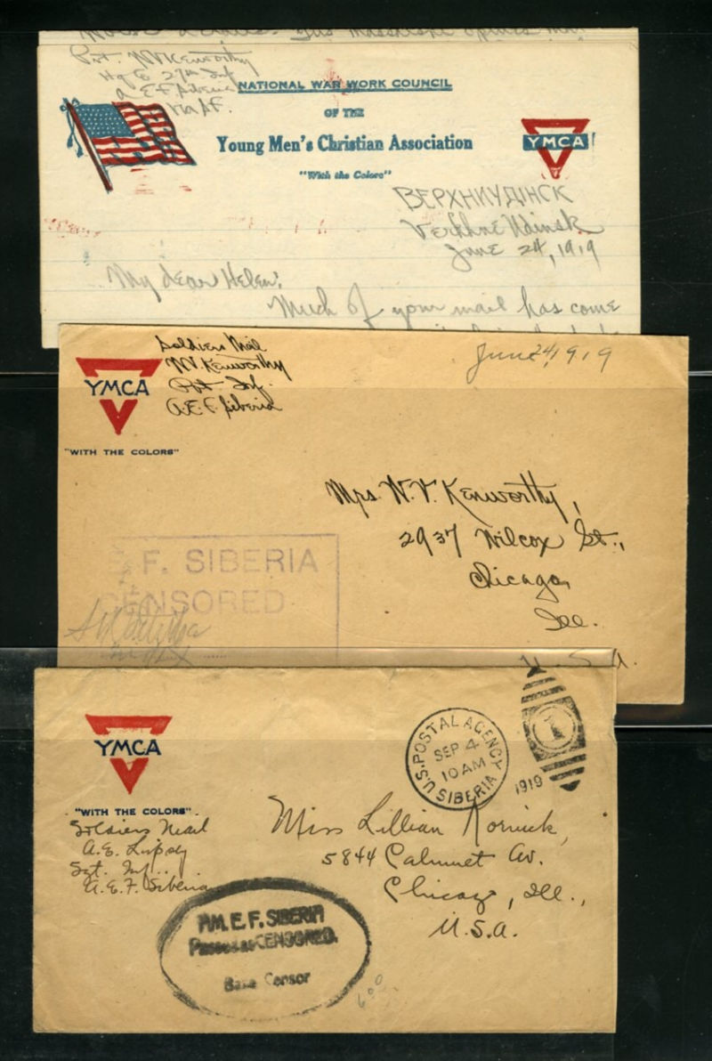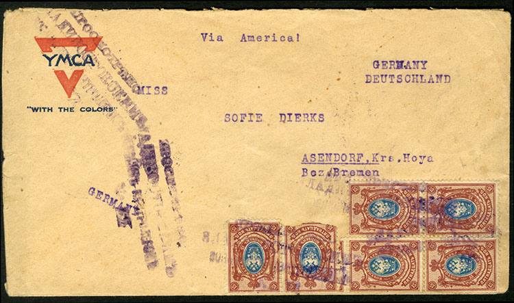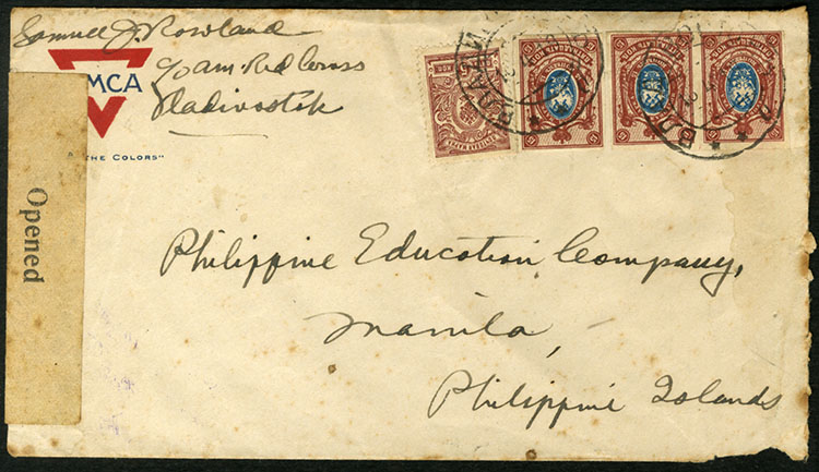 RUSSIA Russia - Russian Far East (Asia Pacific Region) 1919 (16 Apr) YMCA corner cachet cover, care of American Red Cross, franked with 5k and 3x15k (imperf.), tied by Vladivostok departure pmks, addressed to Manila, Philippine Islands,