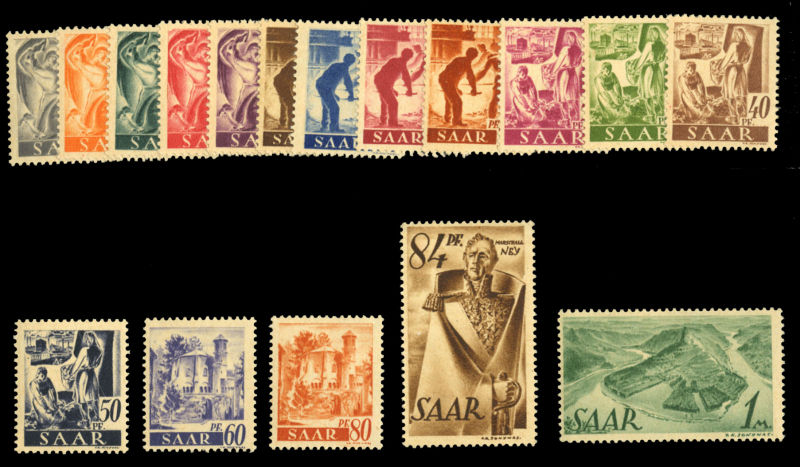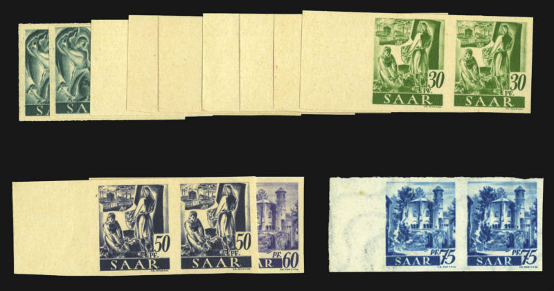 (157/168,174var) 1947 Definitives, 6pf (2), 8pf, 10pf, 15pf, 16pf, 20pf, 25pf, 30pf, 50pf, 60pf, 75pf, twelve imperforate horizontal pairs, n.h., last one watermarked, v.f. (Mi.208Z/222YU, Euro 7,320) (Image)
