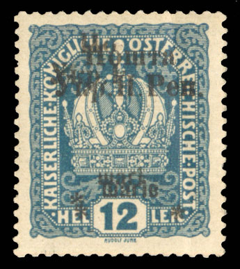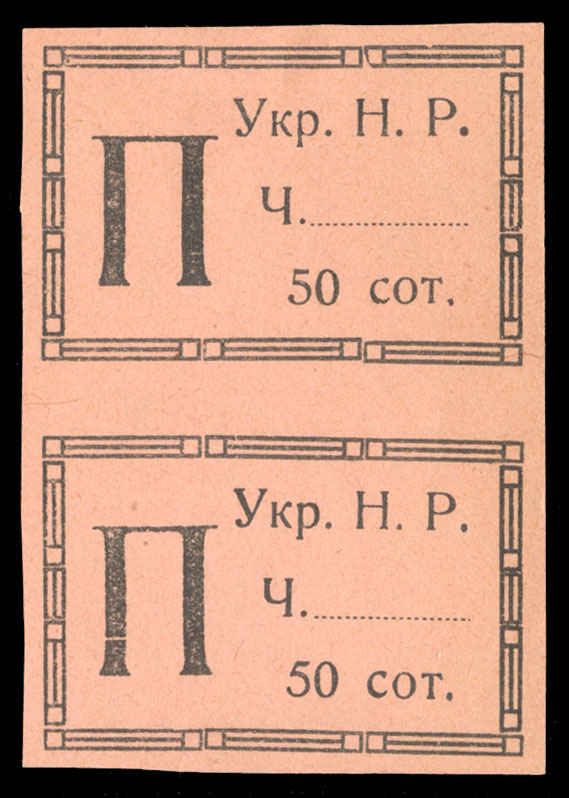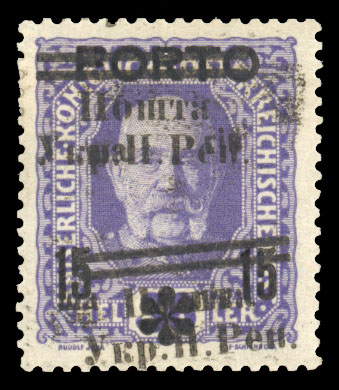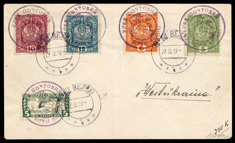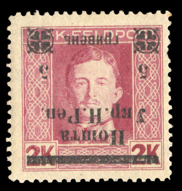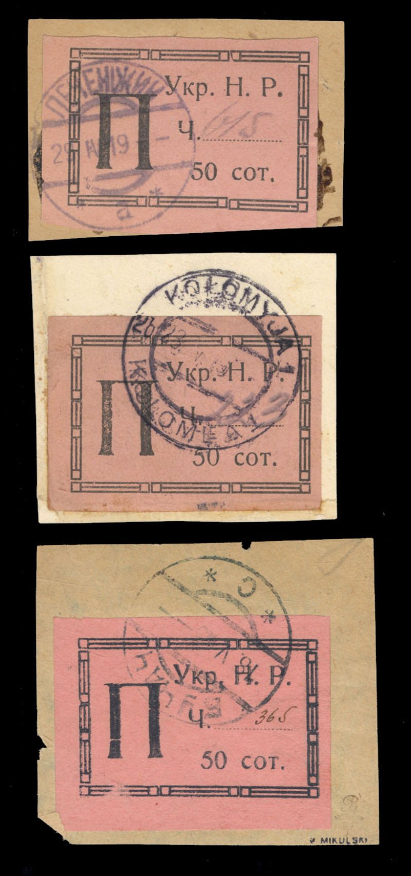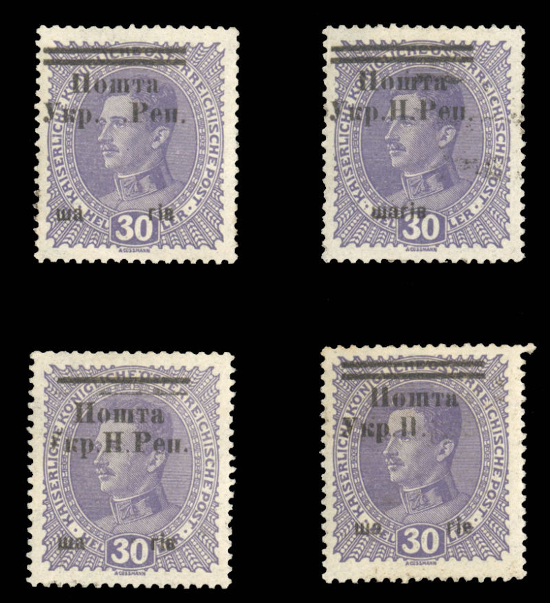 WESTERN UKRAINE (73var) 1919 30sh on 30h violet, four different varieties, position 1, deformed "Y" in "Ykp", position 5, missing "H", position 8, "Shahiv" not separated, position 17, missing "Pen", l.h. or h.r., signed Karl Korner,