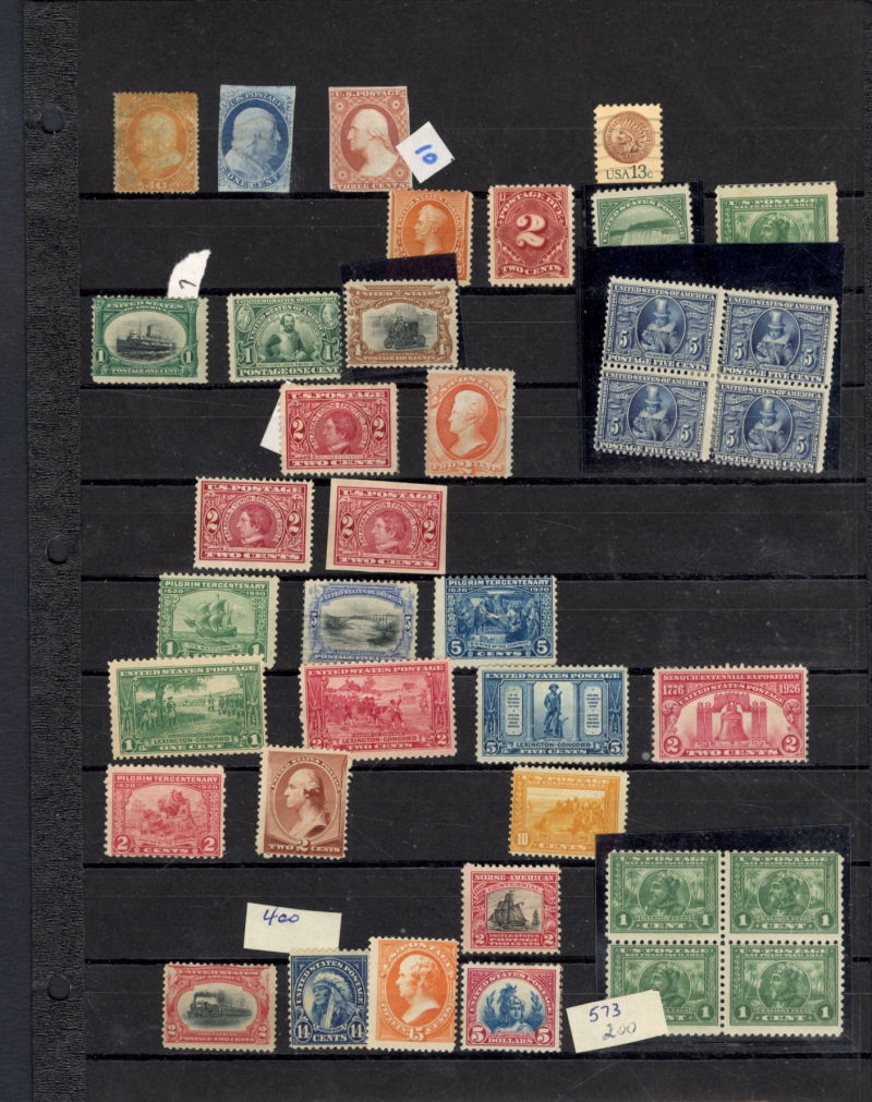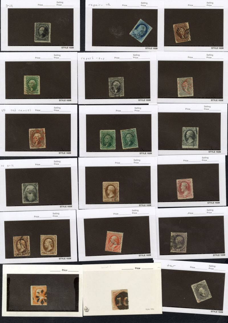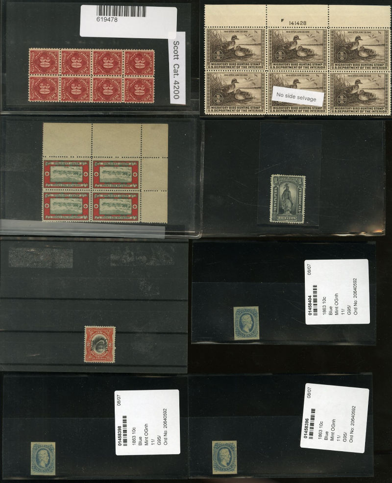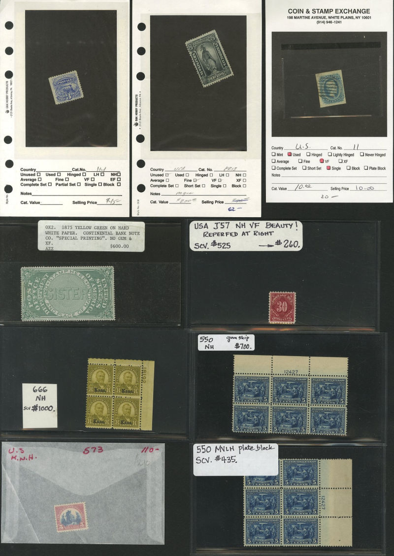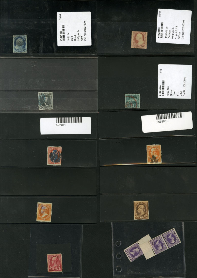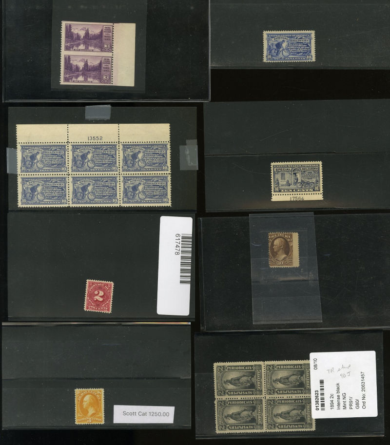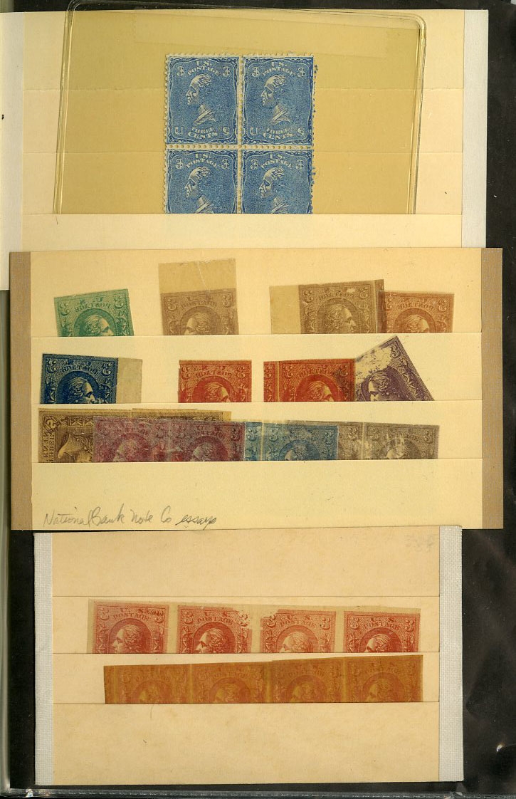 LOTS AND COLLECTIONS UNITED STATES 1847-1930 balance of a consignment, with No.1 (coverfront), 1857 5c red brown, dark brown, 24c, Bank Note Issues, proofs, Essays, Columbians, with 15c (12), 50c-$3, $5, 10c Plate No. Block, Regular Issues with $2