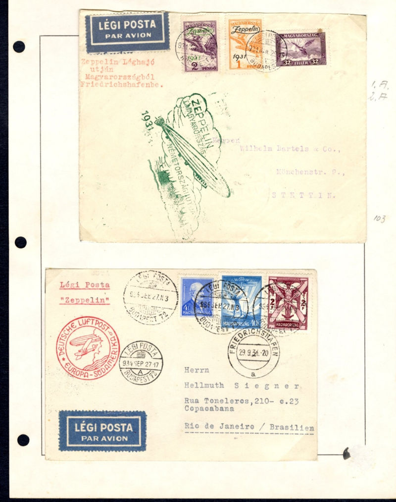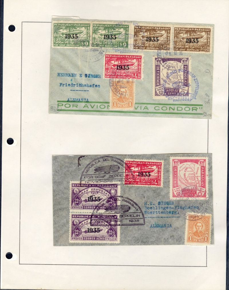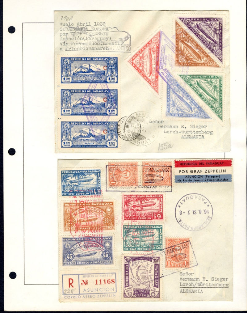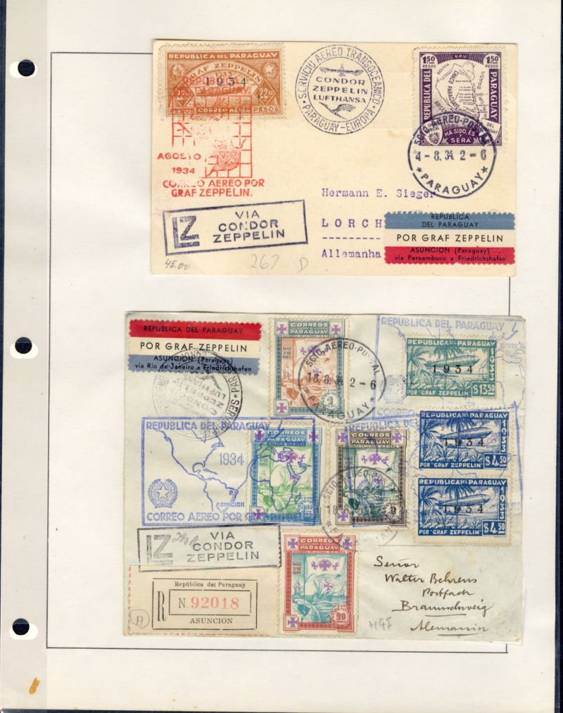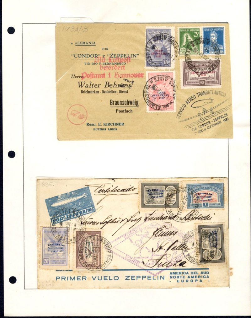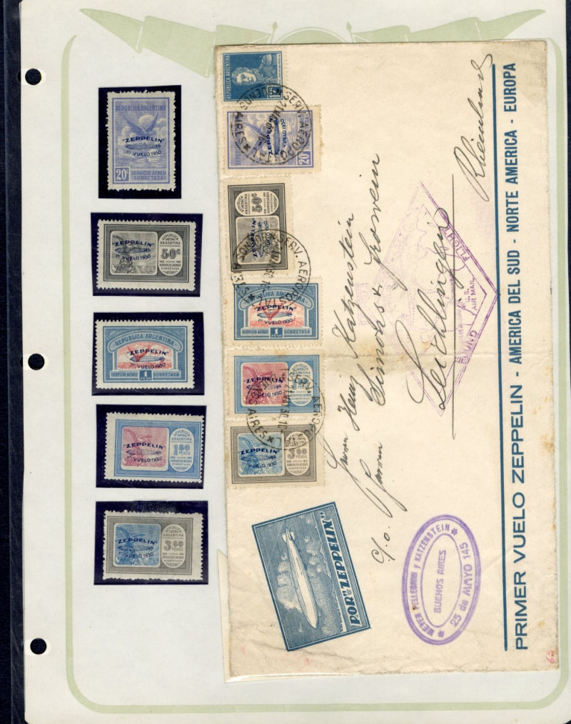 Hungary (3); Spain (3); Greece; Germany (10+, including C43, C43-44); Great Britain; Paraguay (11); Argentina with blue & green overprints, complete sets, each on flown cover to Europe; Bolivia; Uruguay (2), plus others, with unused sets of Zeppelin