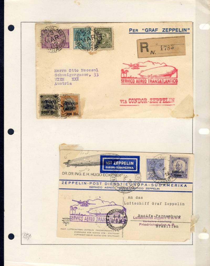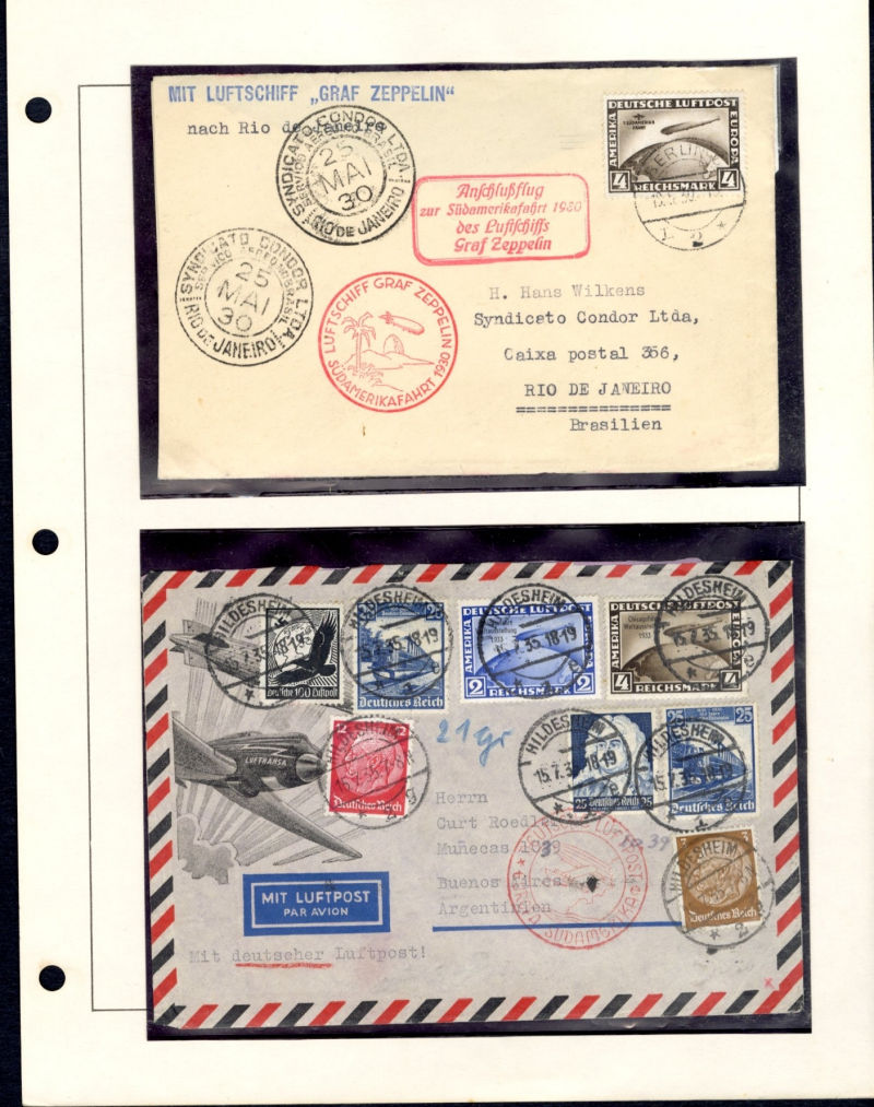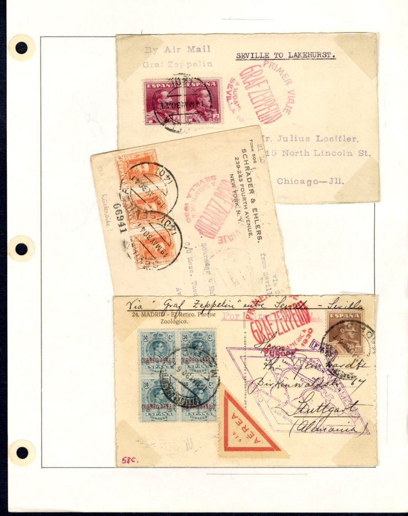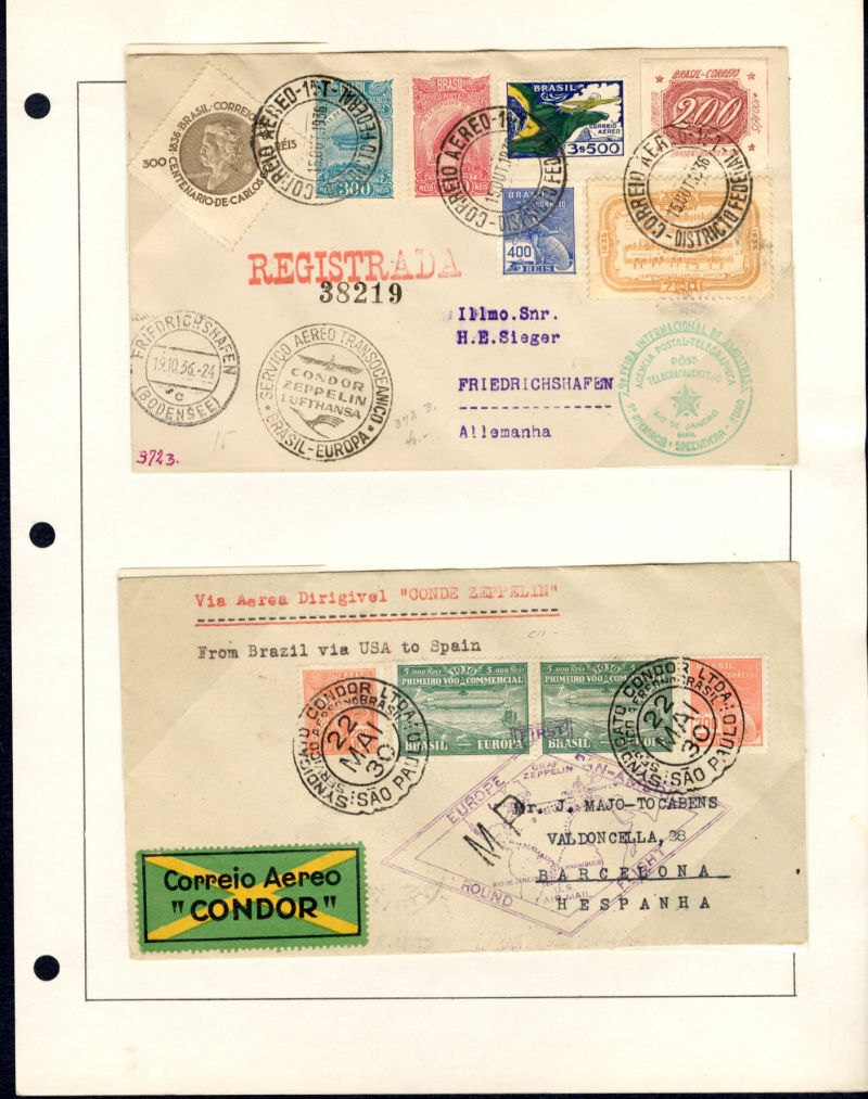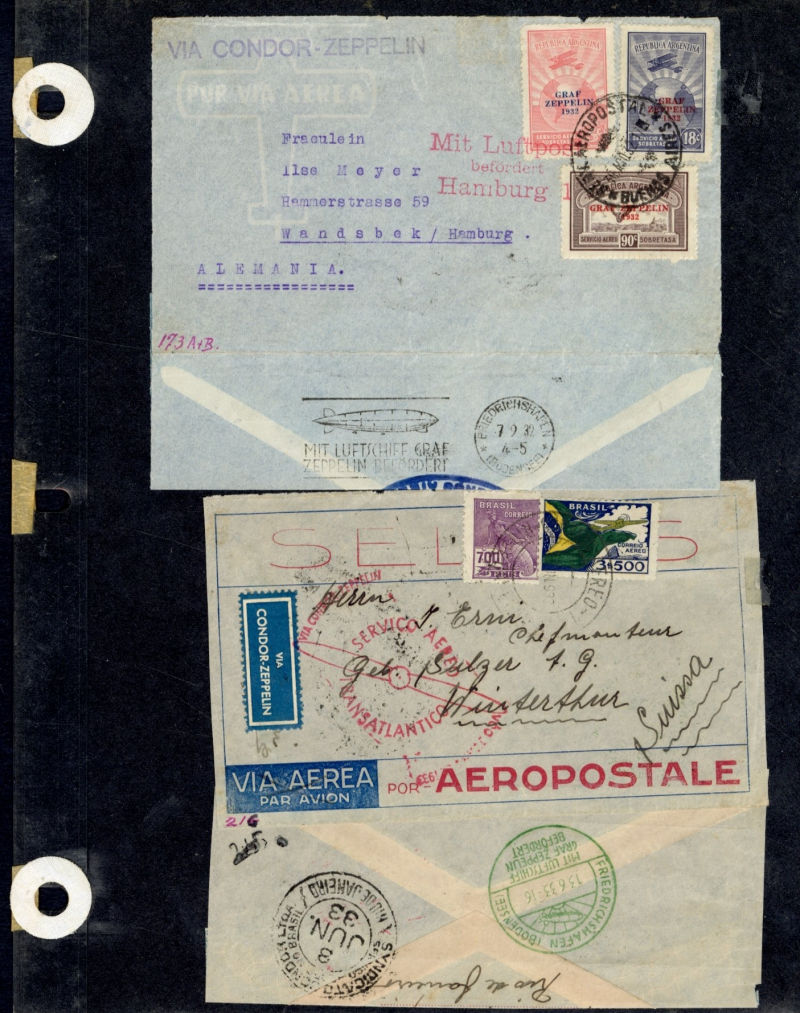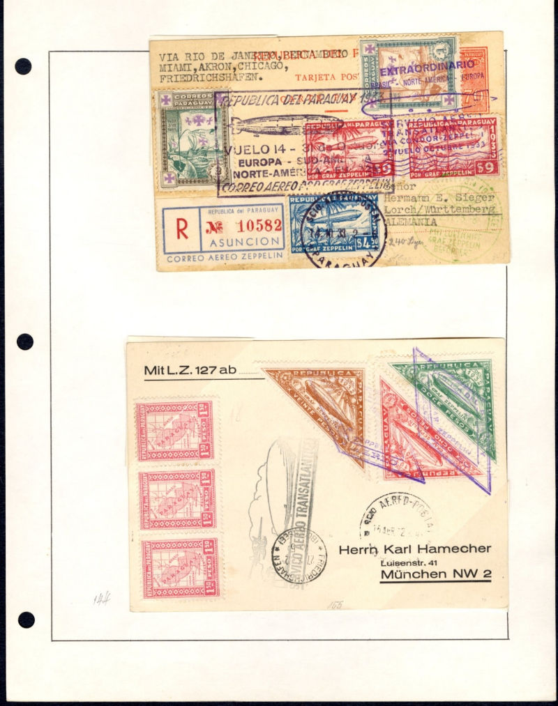 Hungary (3); Spain (3); Greece; Germany (10+, including C43, C43-44); Great Britain; Paraguay (11); Argentina with blue & green overprints, complete sets, each on flown cover to Europe; Bolivia; Uruguay (2), plus others, with unused sets of Zeppelin