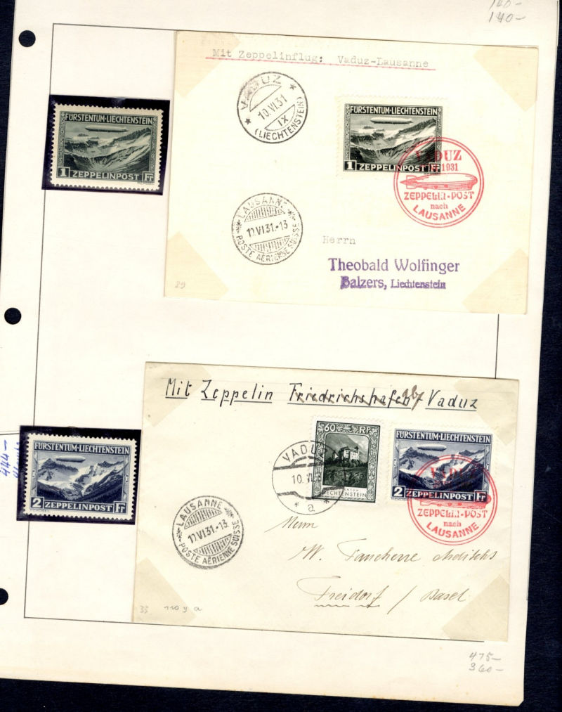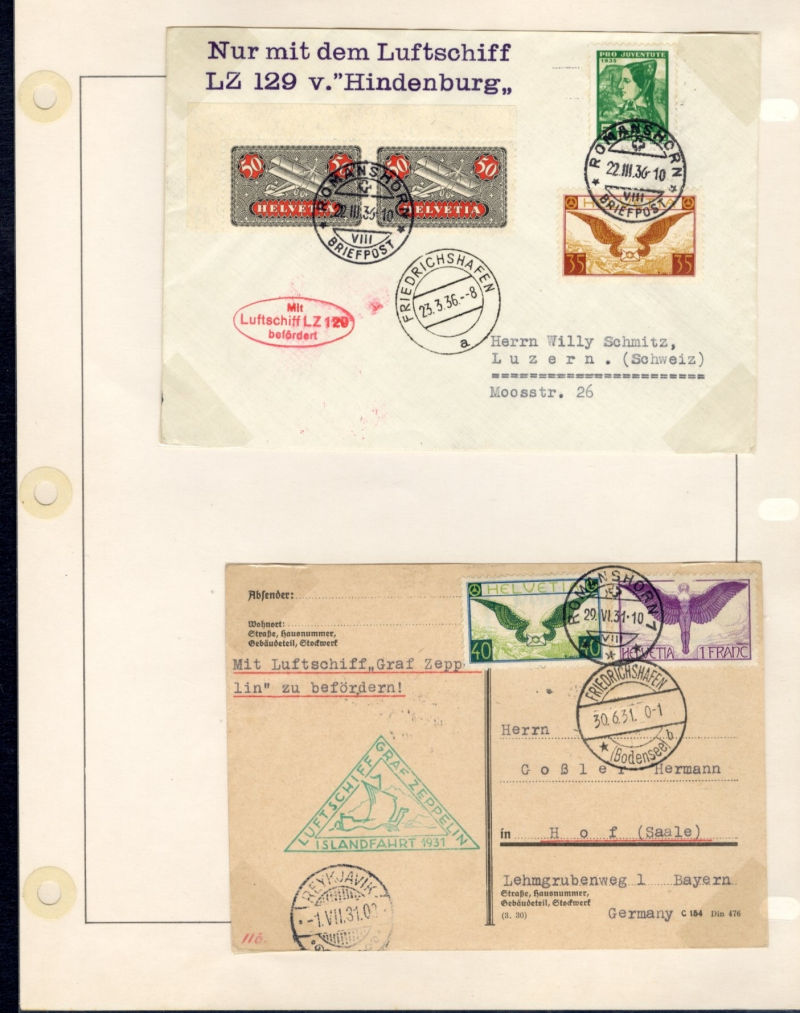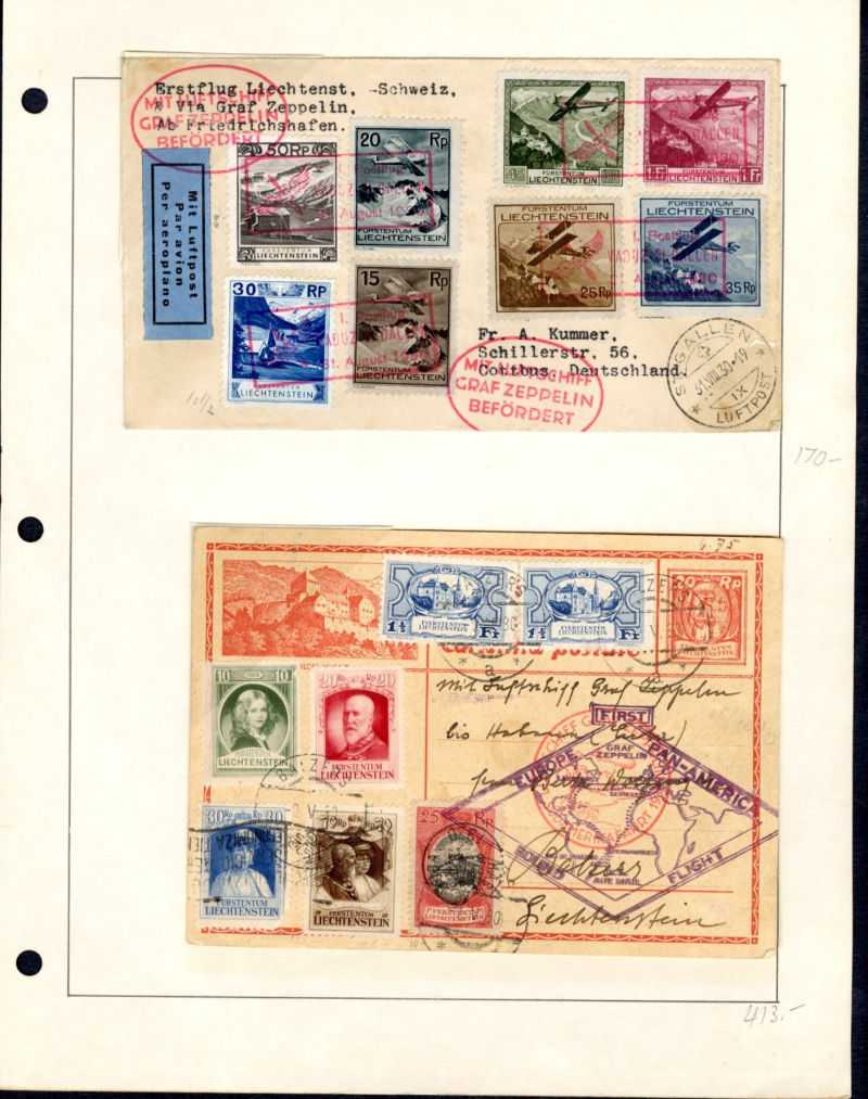 Switzerland (8) covers or cards, with 1929 Round the World Flights, 1931 Iceland Flight, also 3rd SAF to Brazil, 1932 LUPOSTA, 1933 Saarbrucken-Friedrichshafen and 1936 Hindenburg, Liechtenstein (12), including Europe-Pan-America Round Flight,