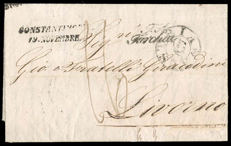 1845 (16 Nov) FL from Varna to Livorno, with 19 November Constantinople transit pmk, "J.A. Turchia" alongside and "Austria No.7", ms forwarding and black disinfection handstamp (with slits) of San Rocco, Livorno, red disinfection slip applied by