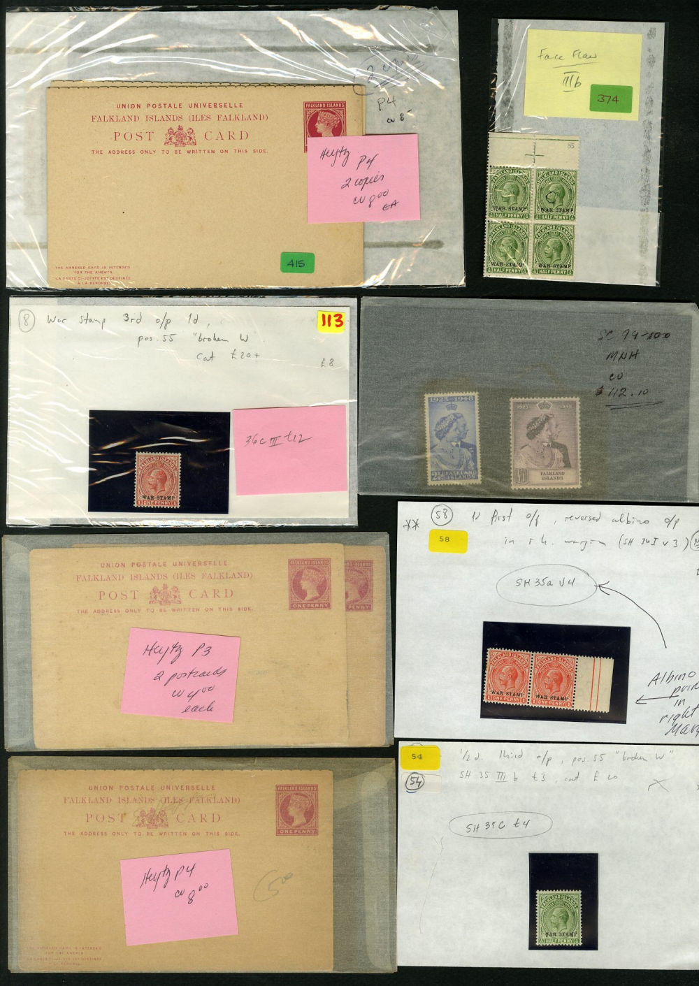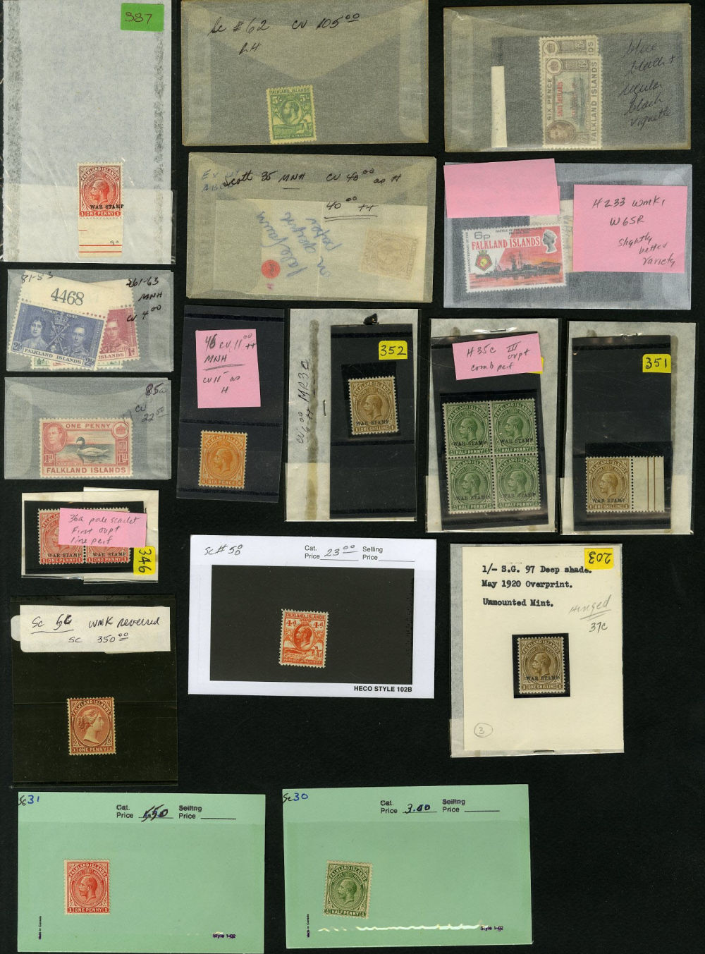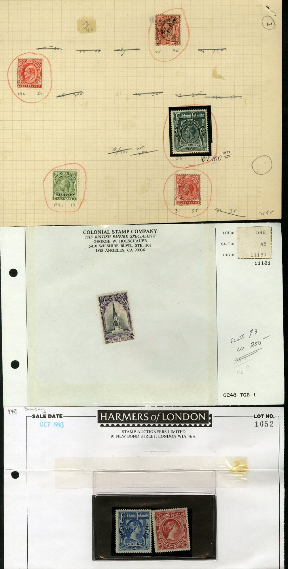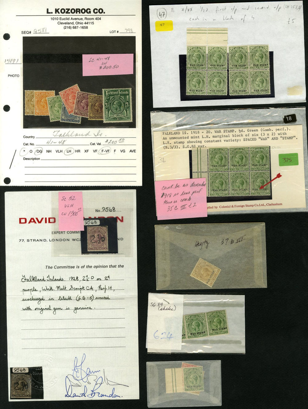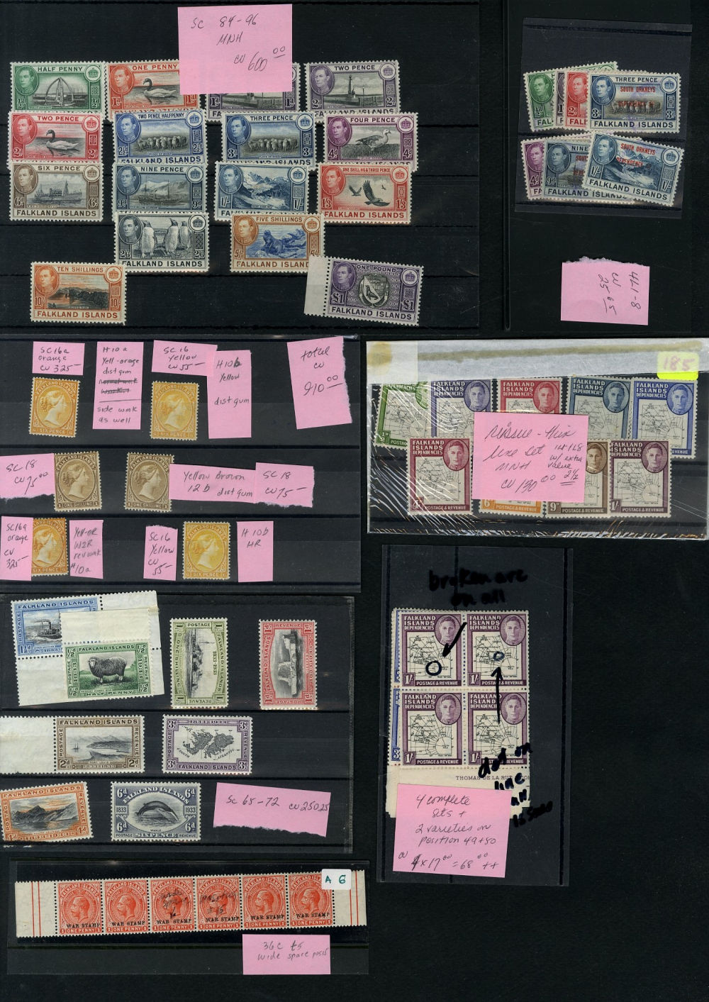 1361 og   imageFALKLAND ISLANDS 1891-1940s balance of a consignment, singles and sets, Queen Victoria-George VI, better items include 2sh6p and 6sh (Scott 20-21, $550), 2 1/2d on 2d purple (52, $1,300), with 1984 Brandon certificate, George VI complete to £1, n.h. (84-96, $600), variety of "War Tax" overprints, shades, etc., mostly fine-v.f., useful group, cat. $4,027 (Image) (Image 2) (Image 3) (Image 4) (Image 5) (Image 6) (Image 7) (All Images)