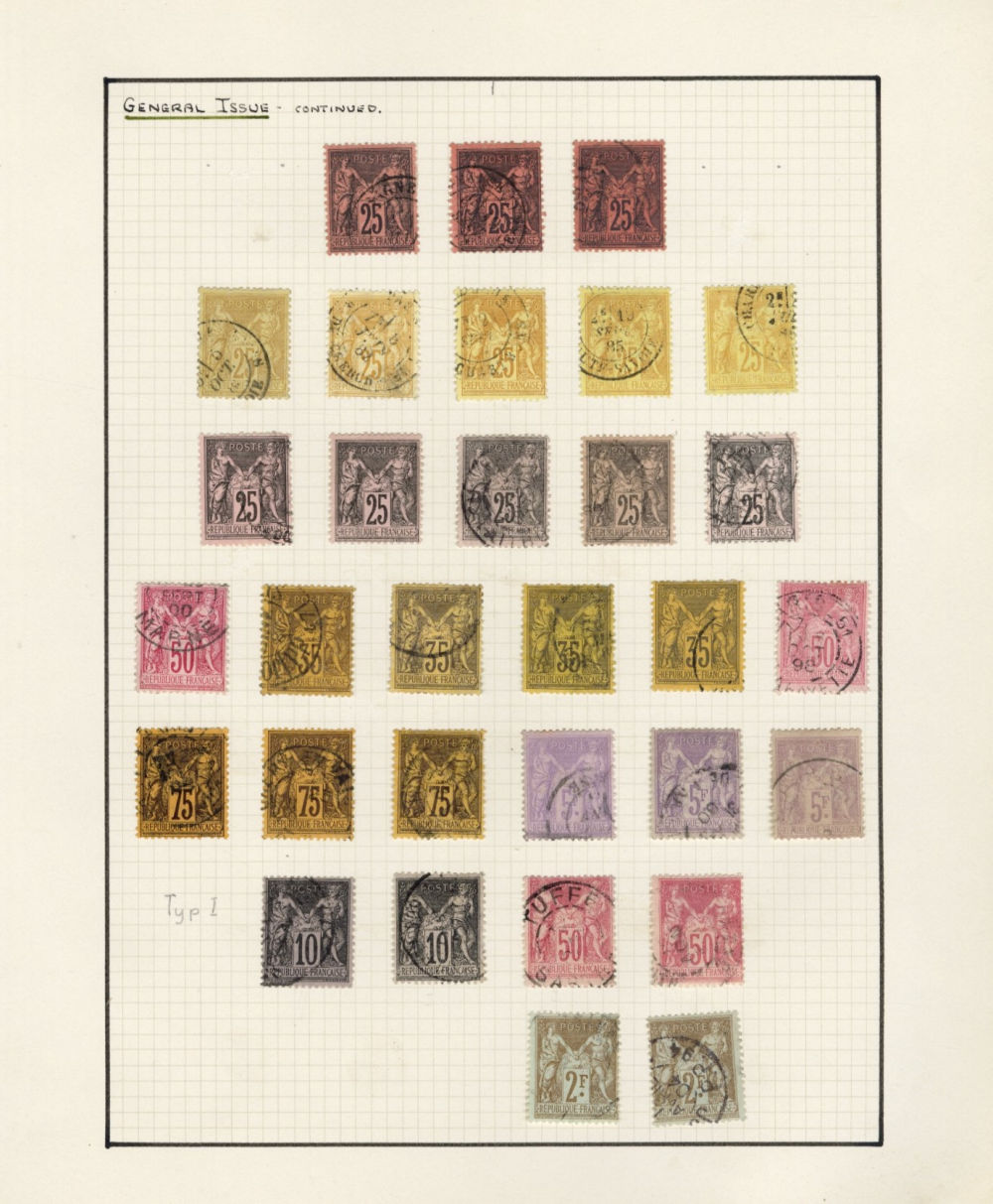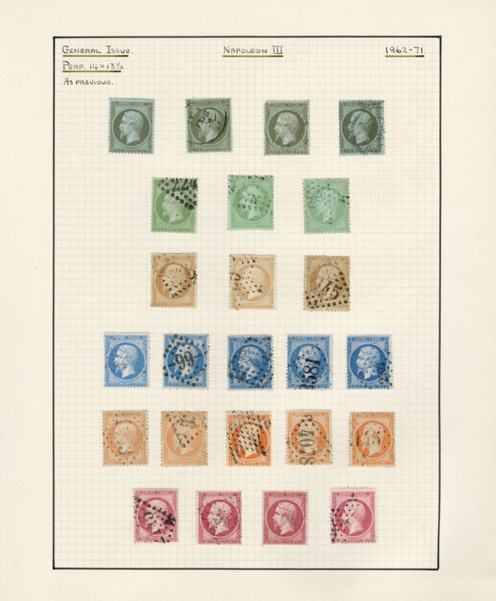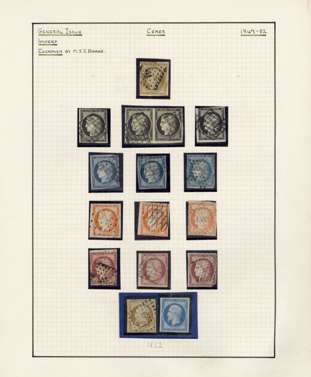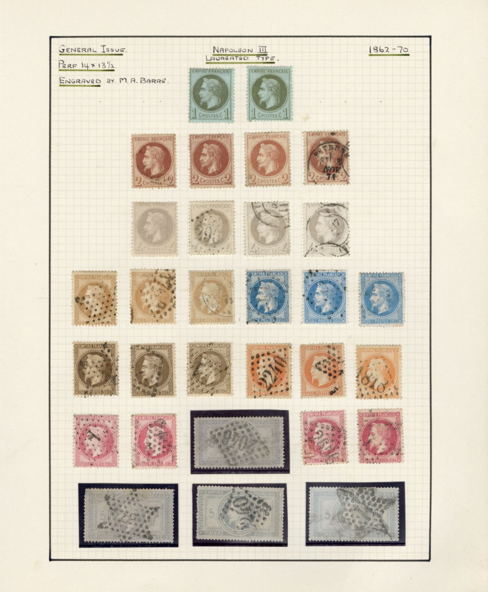 1362 O, og   imageFRANCE 1849-1927 collection on home-made pages, used and unused, with several early values including 1849 40c, 1fr (3), a very attractive unused 1852 25c blue with original gum (thin spot), 1862 fine unused 4c, 1869 5fr, four examples, two with numbered Star cancels, a good range of the imperf. 1870 issue to 80c, Type Sage and Peace and Commerce issues, etc., mixed condition, some usual faults noted, high catalogue (Image) (Image 2) (Image 3) (Image 4) (Image 5) (Image 6) (Image 7) (Image 8) (Image 9) (Image 10) (Image 11) (Image 12) (Image 13) (Image 14) (Image 15) (Image 16) (Image 17) (Image 18) (Image 19) (Image 20) (Image 21) (Image 22) (All Images)