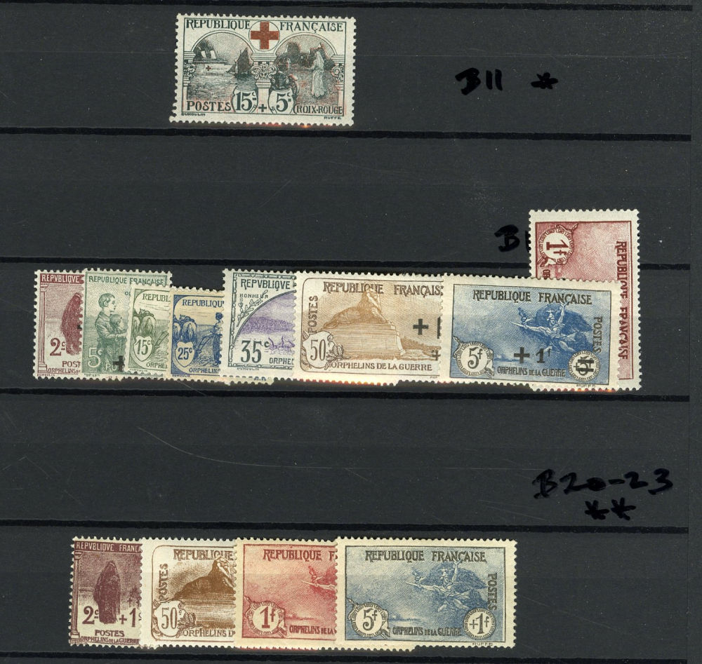 1363 og, nh   imageFRANCE 1900-1950 balance of a consignment in a small stock book, with Merson 5fr-20fr, 5fr carmine from the 1925 souvenir sheet, Semi-Postals with B11-23, B28-33, B38, Samothrace set of two, Air Post with C1-2, Plane Over Paris to 50fr, South Atlantic set of two, three other sets to 100fr, l.h. or n.h., fine-v.f. (Image) (Image 2) (Image 3) (Image 4) (Image 5) (Image 6) (Image 7) (Image 8) (Image 9) (Image 10) (All Images)