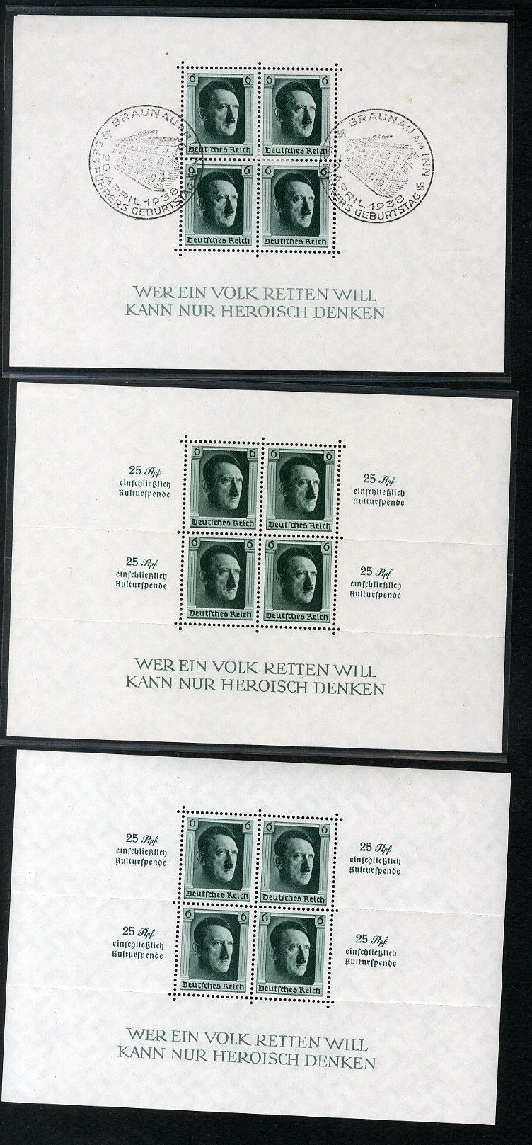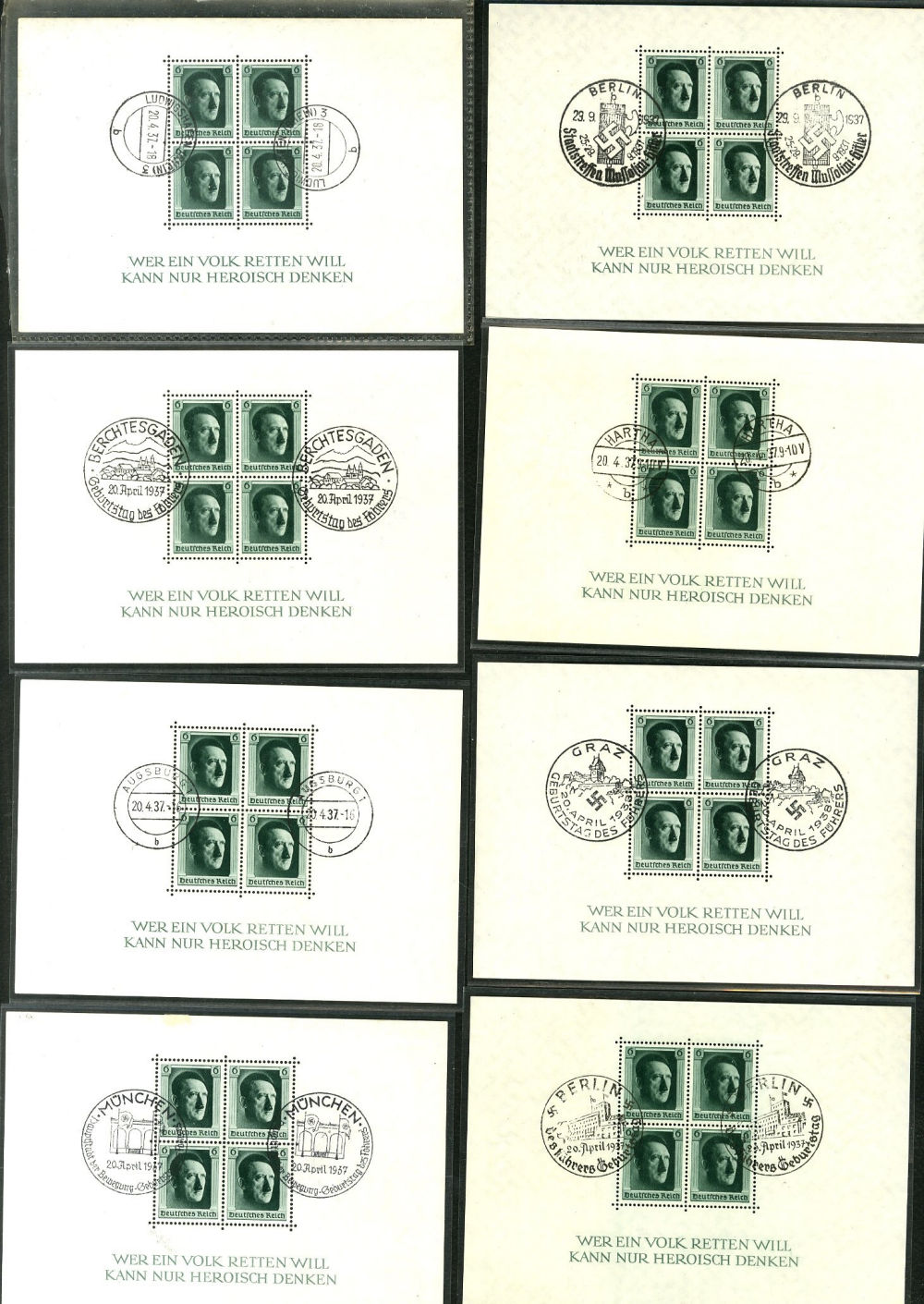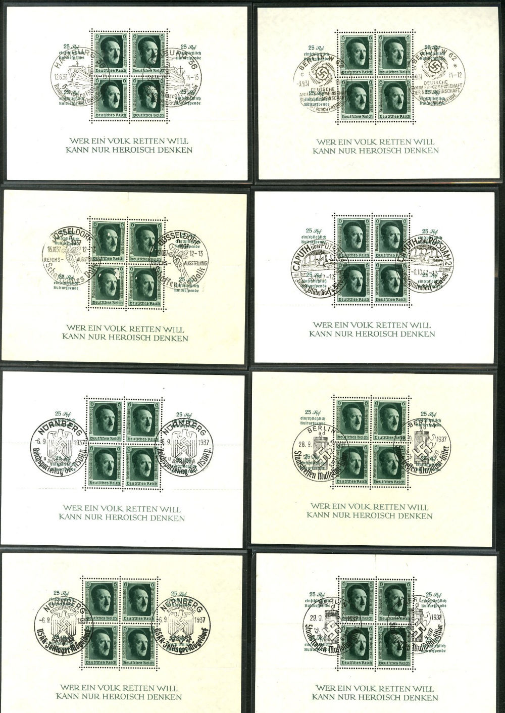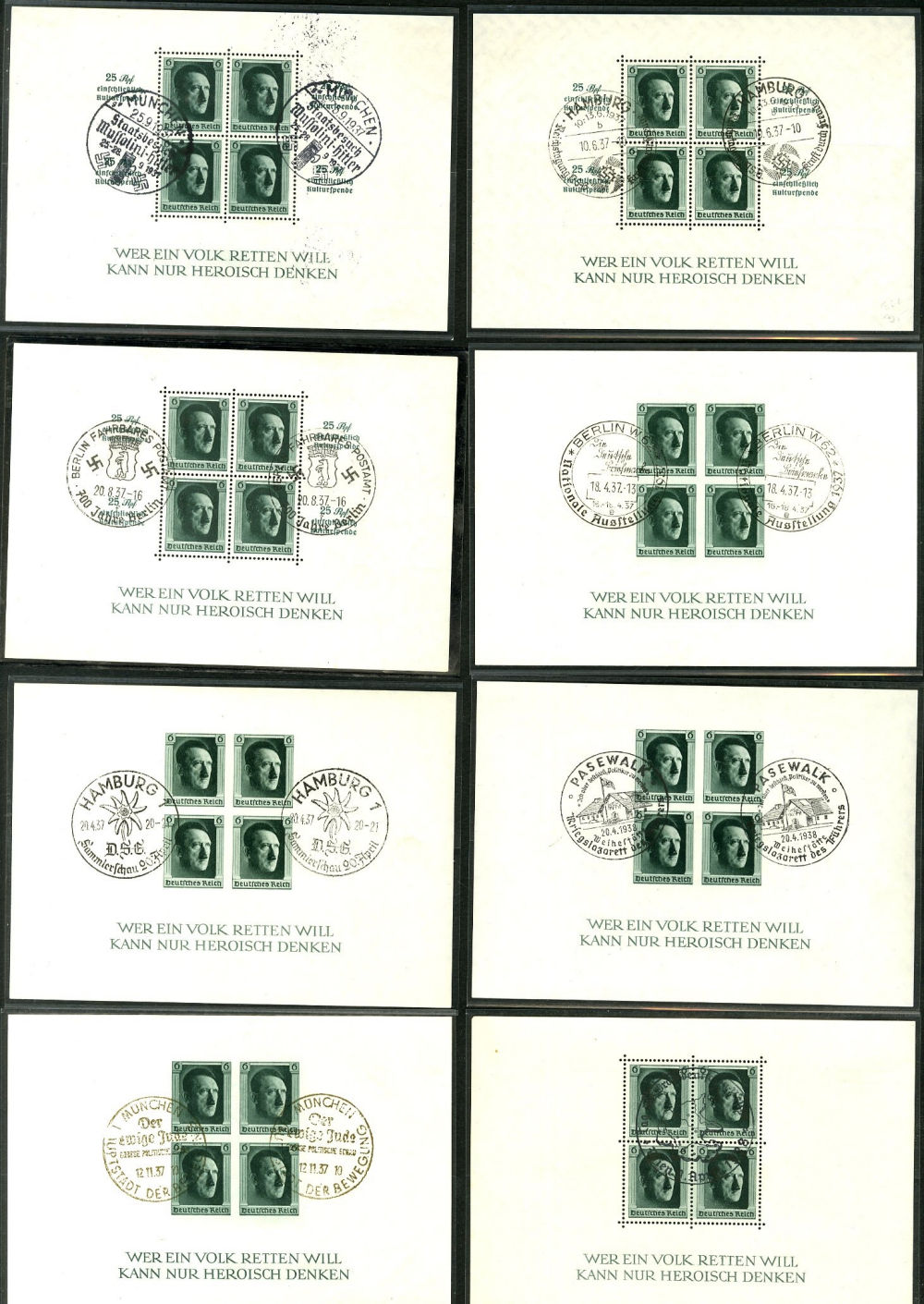 1373 O, nh   imageGERMANY (B102,103,104,106) 1937 Hitler souvenir sheets of four perf 14 (11) used and imperf (4) each with a different cancel, the sheet with marginal inscriptions (2) unused, one n.h, and (3) used, and the overprinted sheet, (8) used examples with different cancels, v.f., cat. value $1,099 (Image) (Image 2) (Image 3) (Image 4) (All Images)