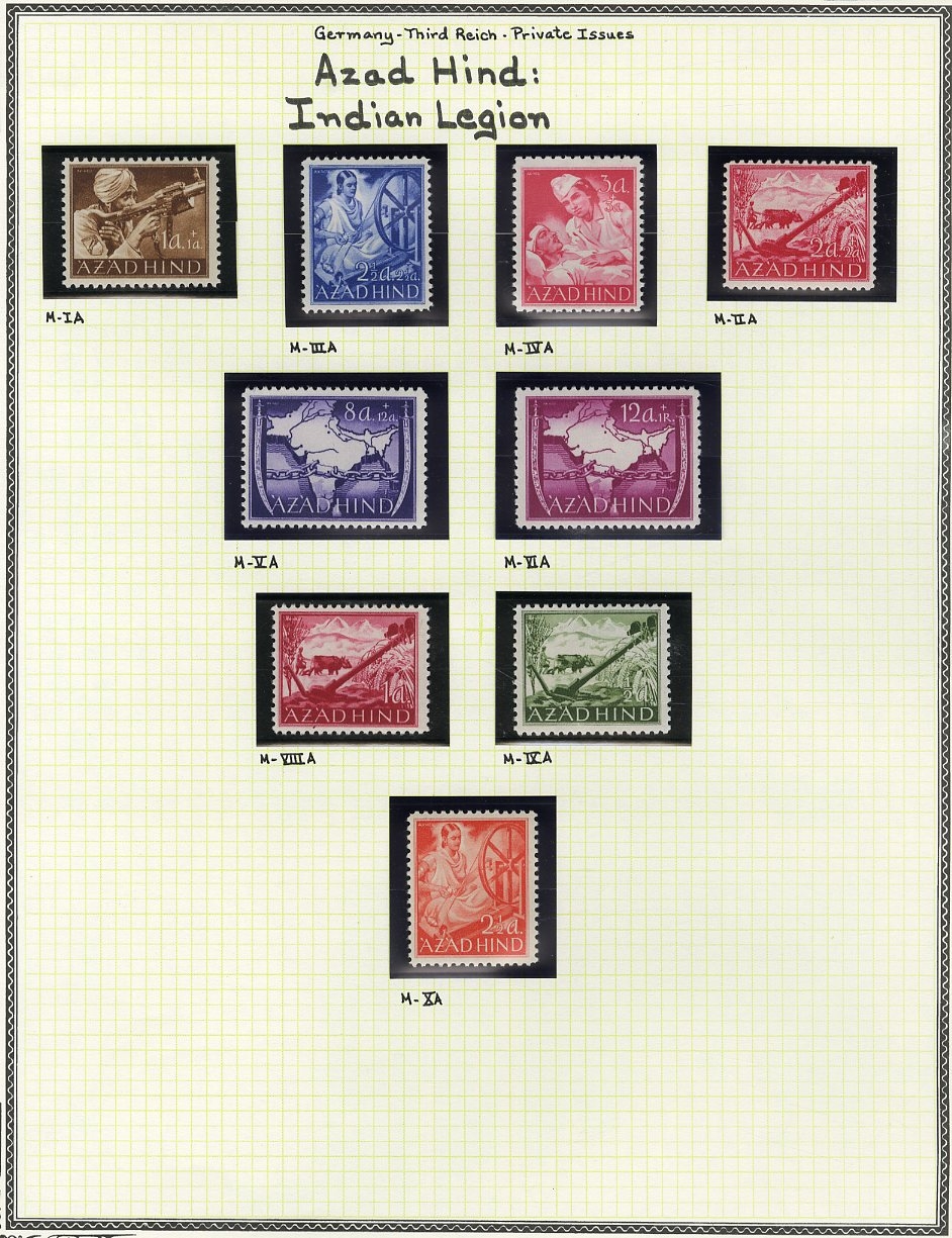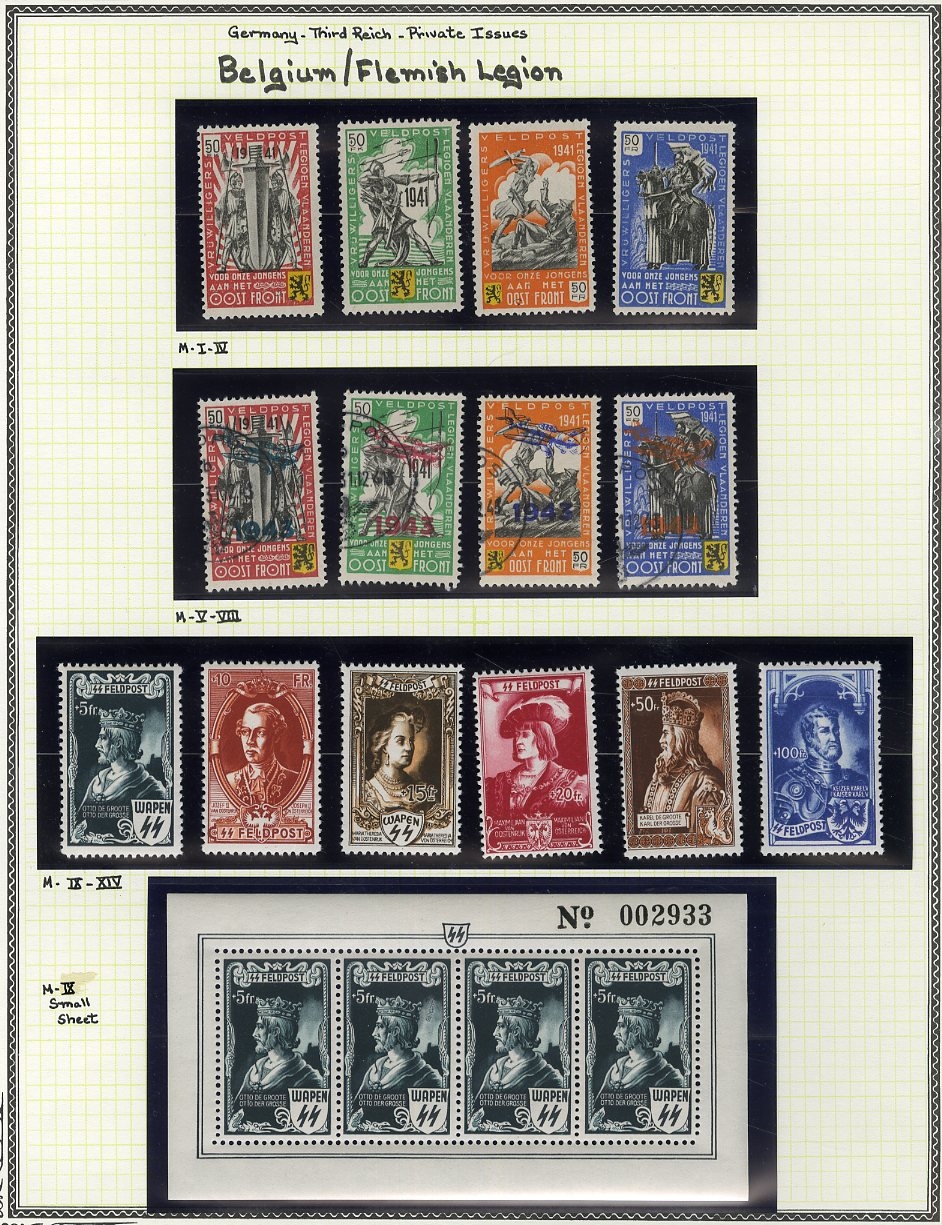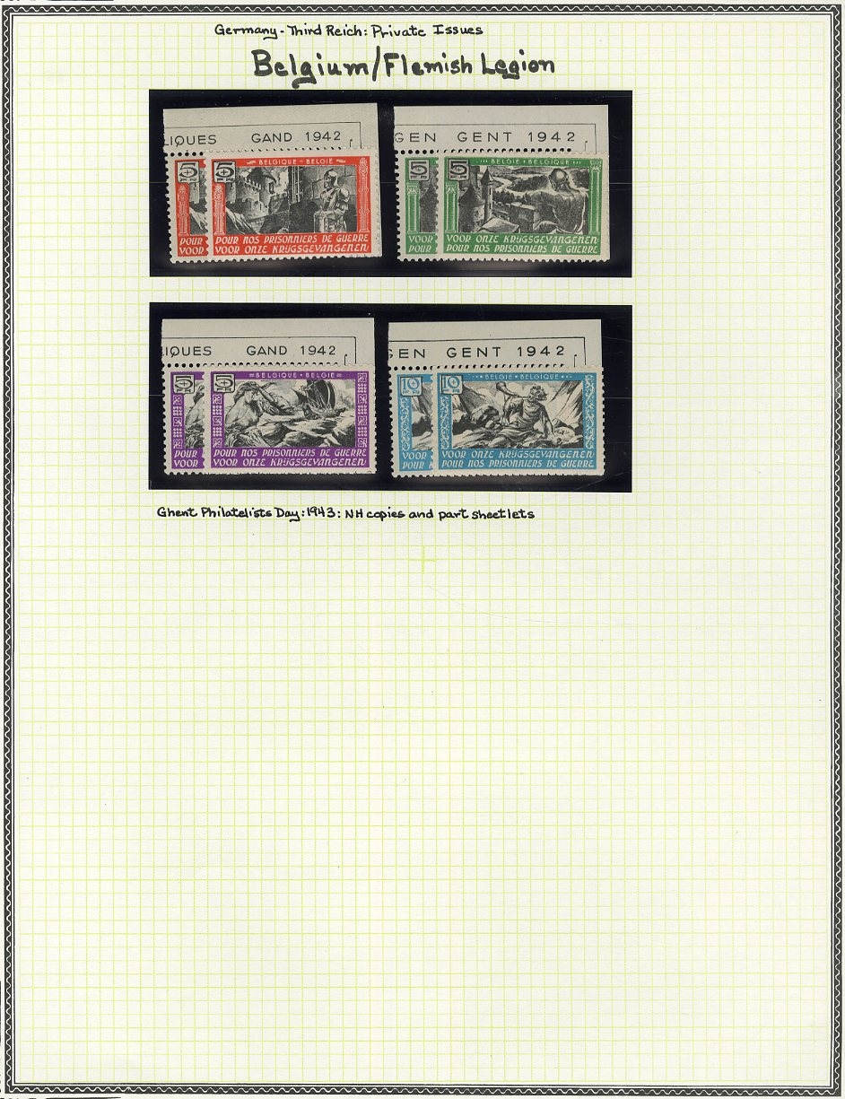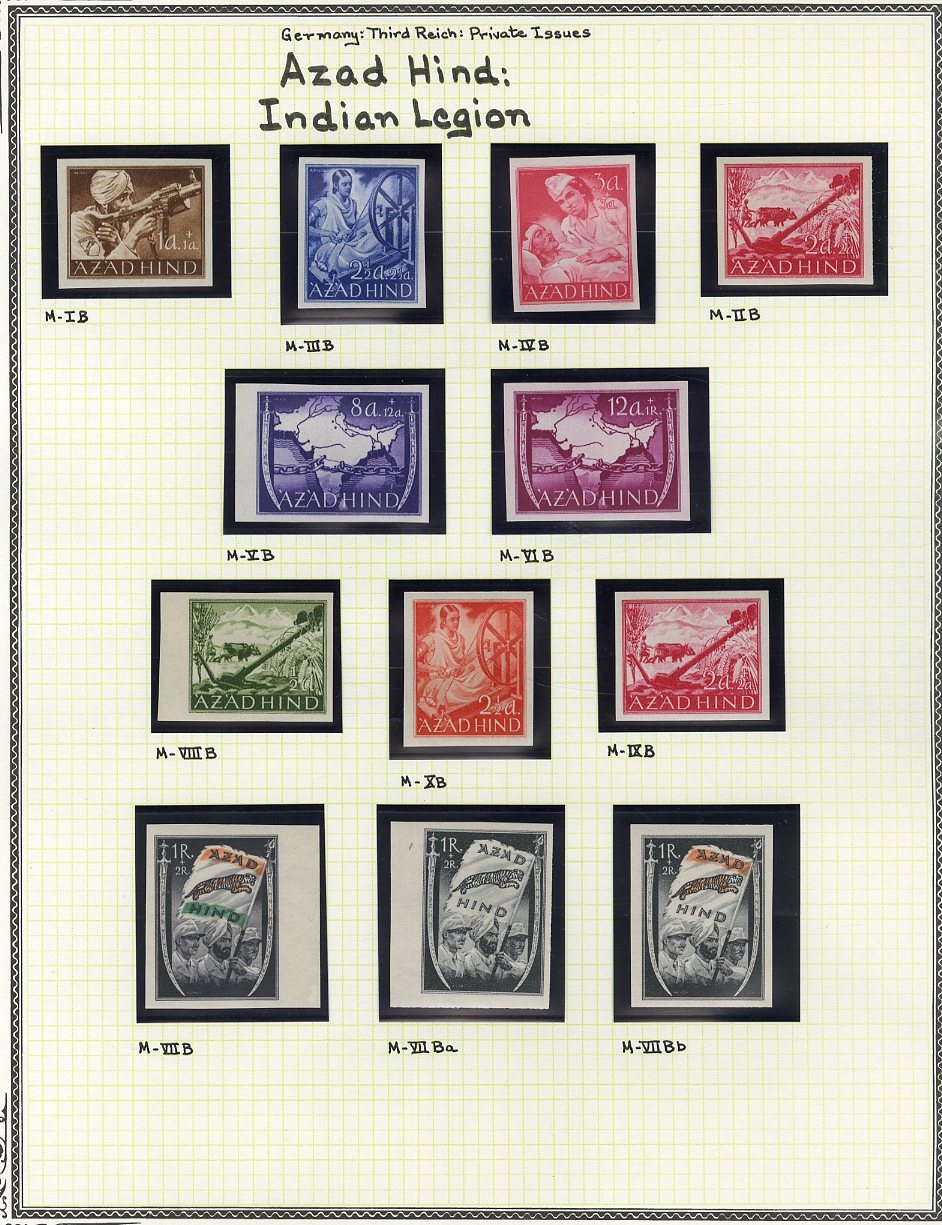 1379 O, og, COVER   imageGERMANY - WORLD WAR II Occupation Issues1941-44 selection on pages, with Flemish Legion, including Kings sheetlets of four (n.h.), Walloon Legion (two sets), French Legion, Netherlands Legion souvenir sheets of four and ten, India Azad-Hind complete set of 12 imperforate (Mi.Euro 960), also "V" label unused, plus one on cover, American Forgeries for Germany (three different), etc. (Image) (Image 2) (Image 3) (Image 4) (Image 5) (Image 6) (Image 7) (Image 8) (Image 9) (Image 10) (Image 11) (Image 12) (Image 13) (Image 14) (All Images)