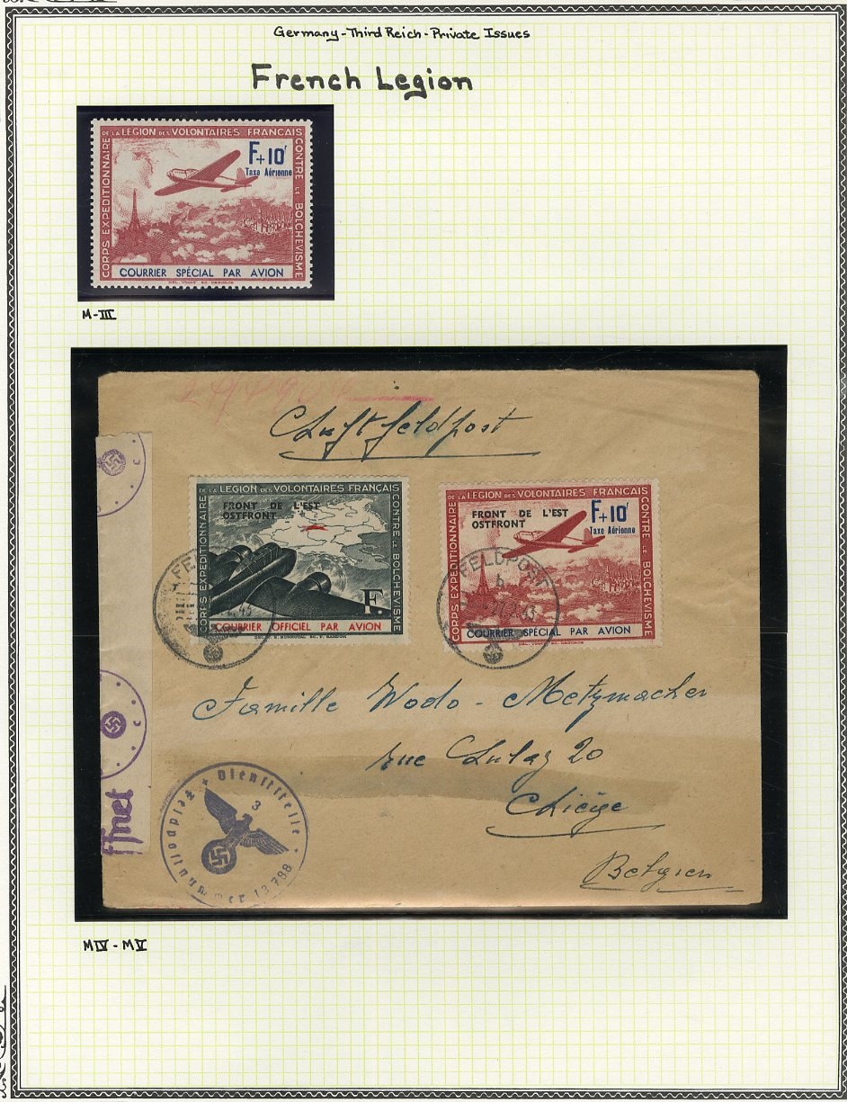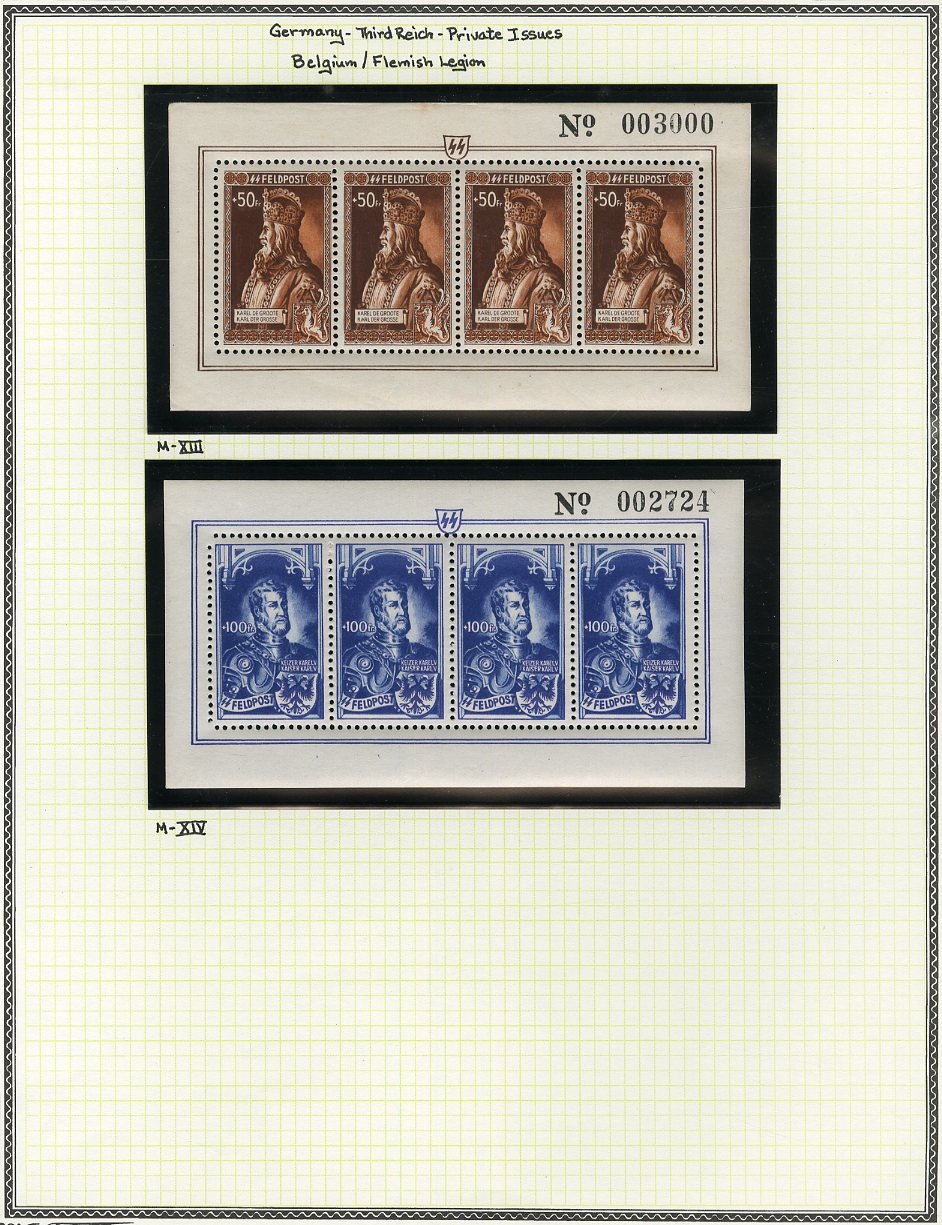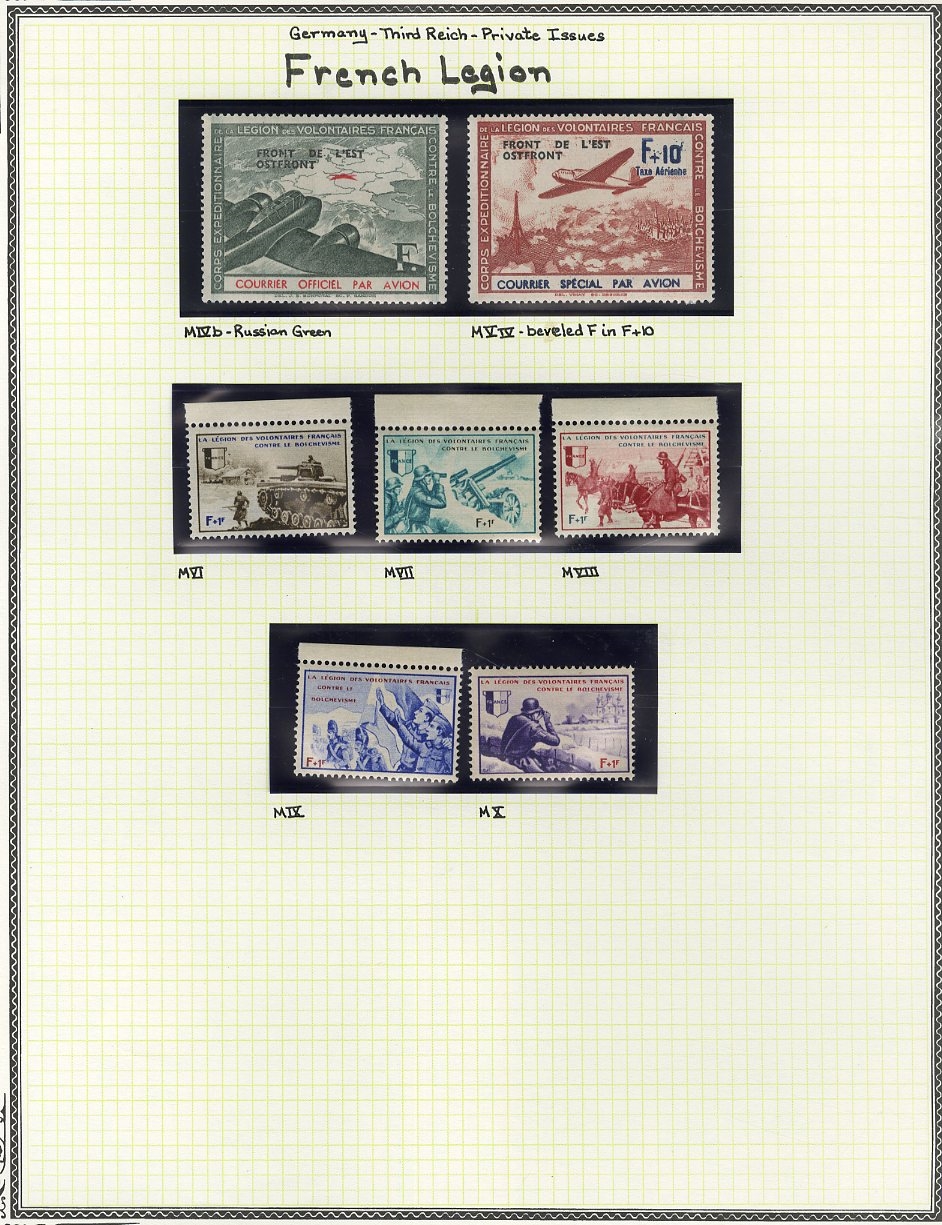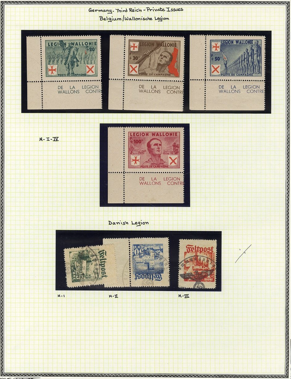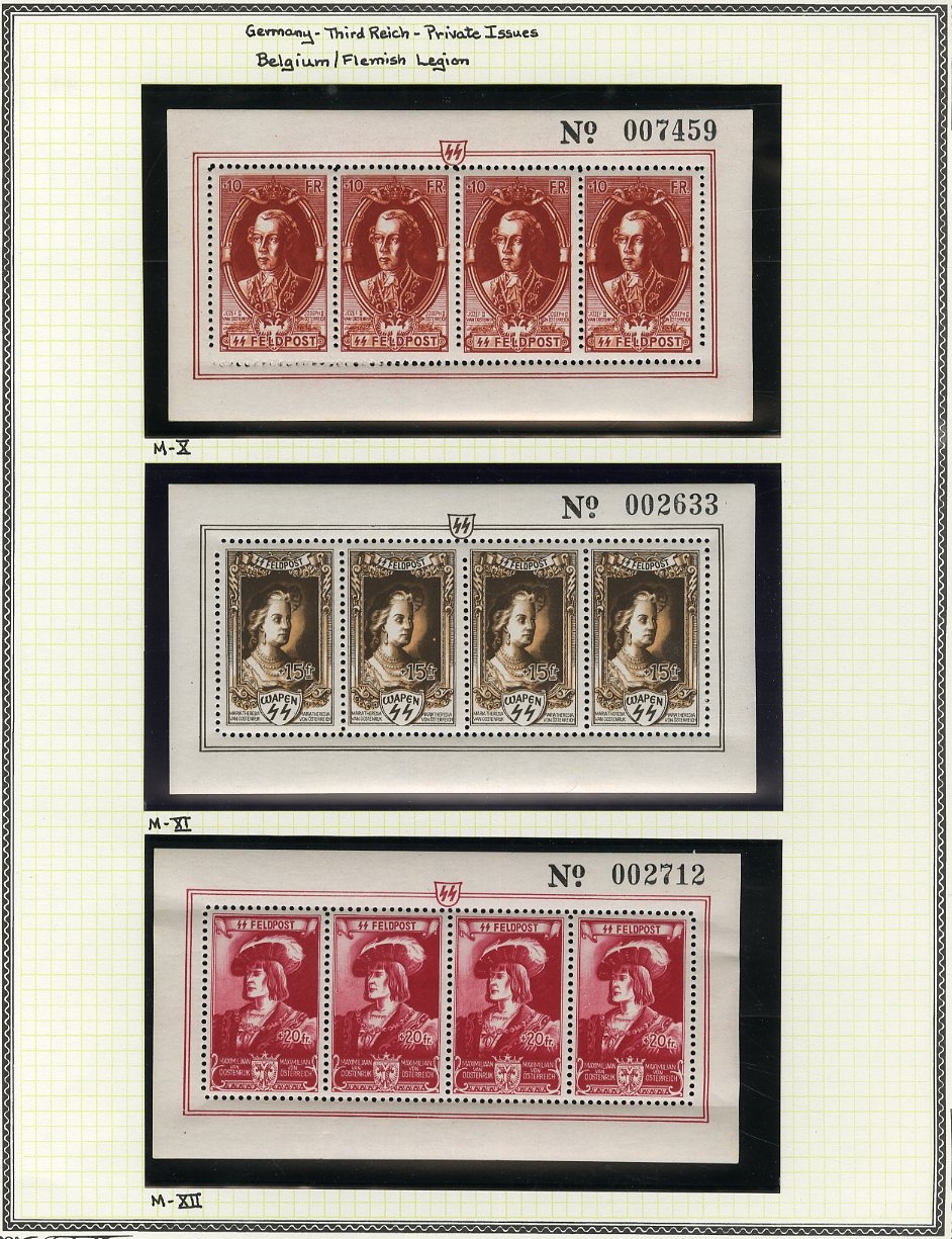 1379 O, og, COVER   imageGERMANY - WORLD WAR II Occupation Issues1941-44 selection on pages, with Flemish Legion, including Kings sheetlets of four (n.h.), Walloon Legion (two sets), French Legion, Netherlands Legion souvenir sheets of four and ten, India Azad-Hind complete set of 12 imperforate (Mi.Euro 960), also "V" label unused, plus one on cover, American Forgeries for Germany (three different), etc. (Image) (Image 2) (Image 3) (Image 4) (Image 5) (Image 6) (Image 7) (Image 8) (Image 9) (Image 10) (Image 11) (Image 12) (Image 13) (Image 14) (All Images)