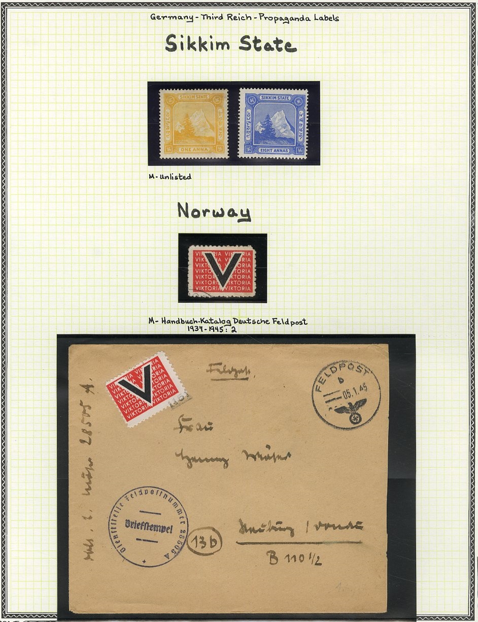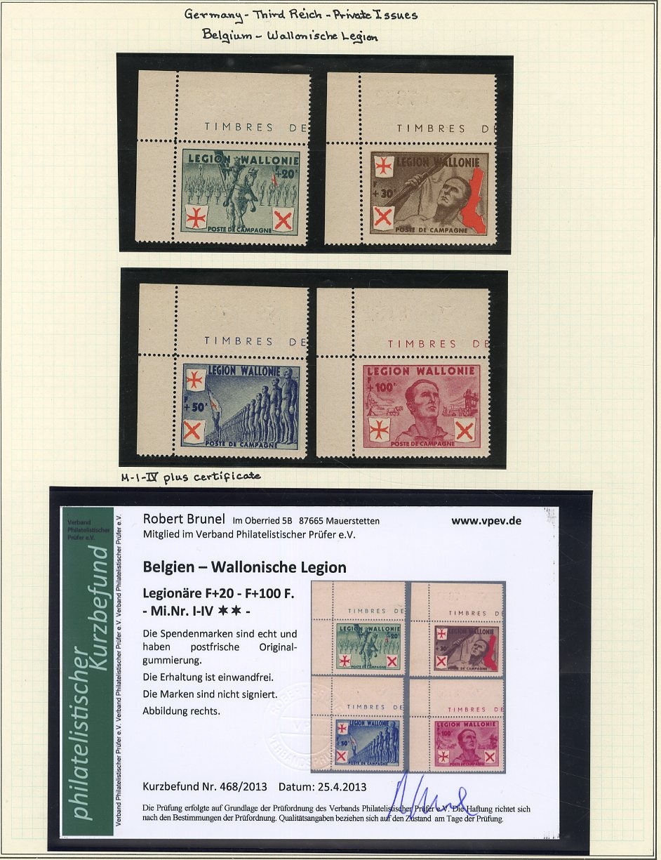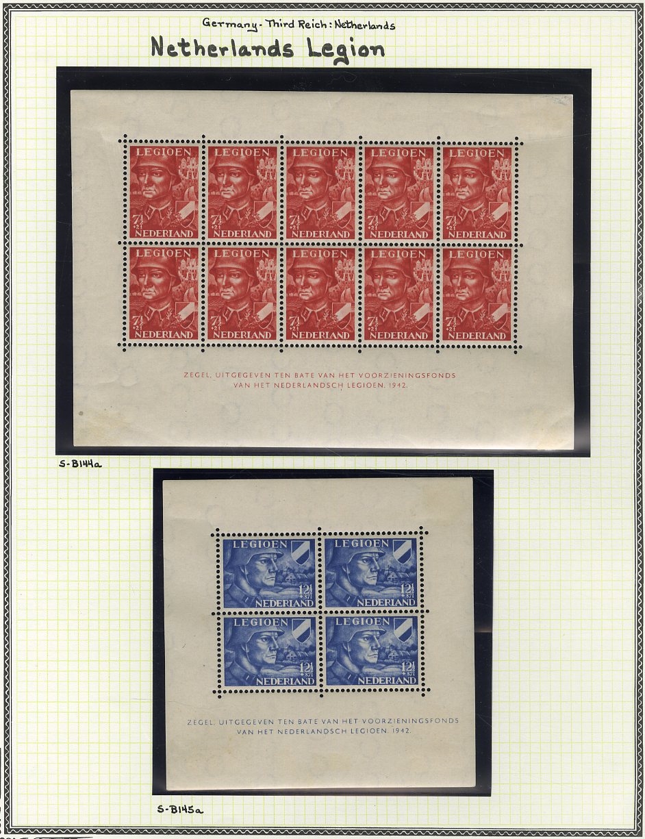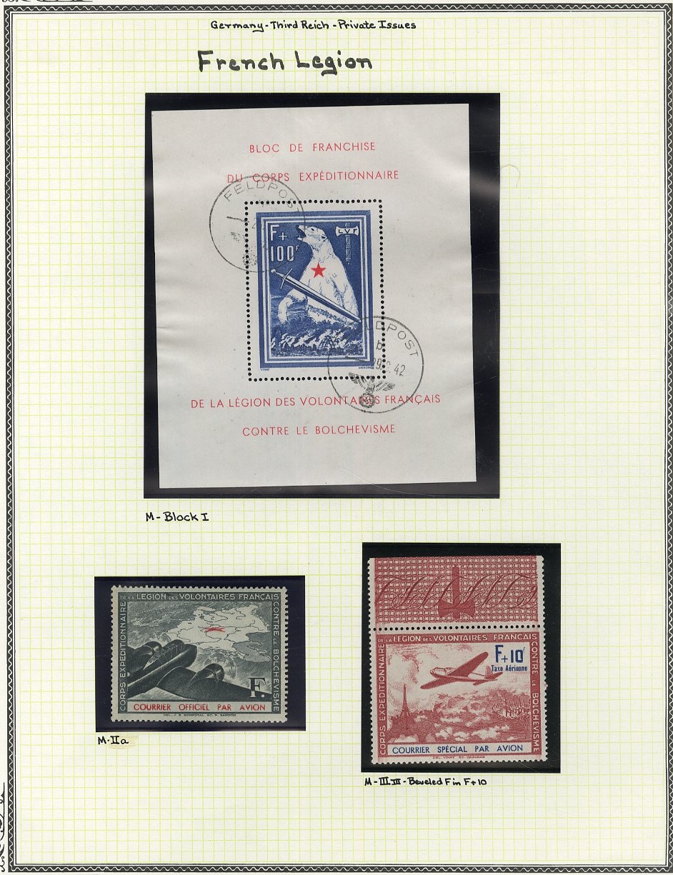 1379 O, og, COVER   imageGERMANY - WORLD WAR II Occupation Issues1941-44 selection on pages, with Flemish Legion, including Kings sheetlets of four (n.h.), Walloon Legion (two sets), French Legion, Netherlands Legion souvenir sheets of four and ten, India Azad-Hind complete set of 12 imperforate (Mi.Euro 960), also "V" label unused, plus one on cover, American Forgeries for Germany (three different), etc. (Image) (Image 2) (Image 3) (Image 4) (Image 5) (Image 6) (Image 7) (Image 8) (Image 9) (Image 10) (Image 11) (Image 12) (Image 13) (Image 14) (All Images)