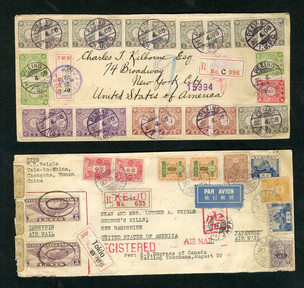 1401 COVER   imageJAPAN 1908-31 two large covers to the United States, one with Japanese Offices in China franking, sent from Peking I.J.P.O. via Kobe, with two different Registry labels; the other cover is with Japanese and U.S. franking, tied by "Keijo Chosen" (20.8.31) departure pmks, sailing on "S.S.Empress of Canada" via Tokyo, with Japanese "Officially Sealed" labels and 2x5c Winged Globe stamps, tied by registry ovals, some cover faults, otherwise fine (Image) (All Images)