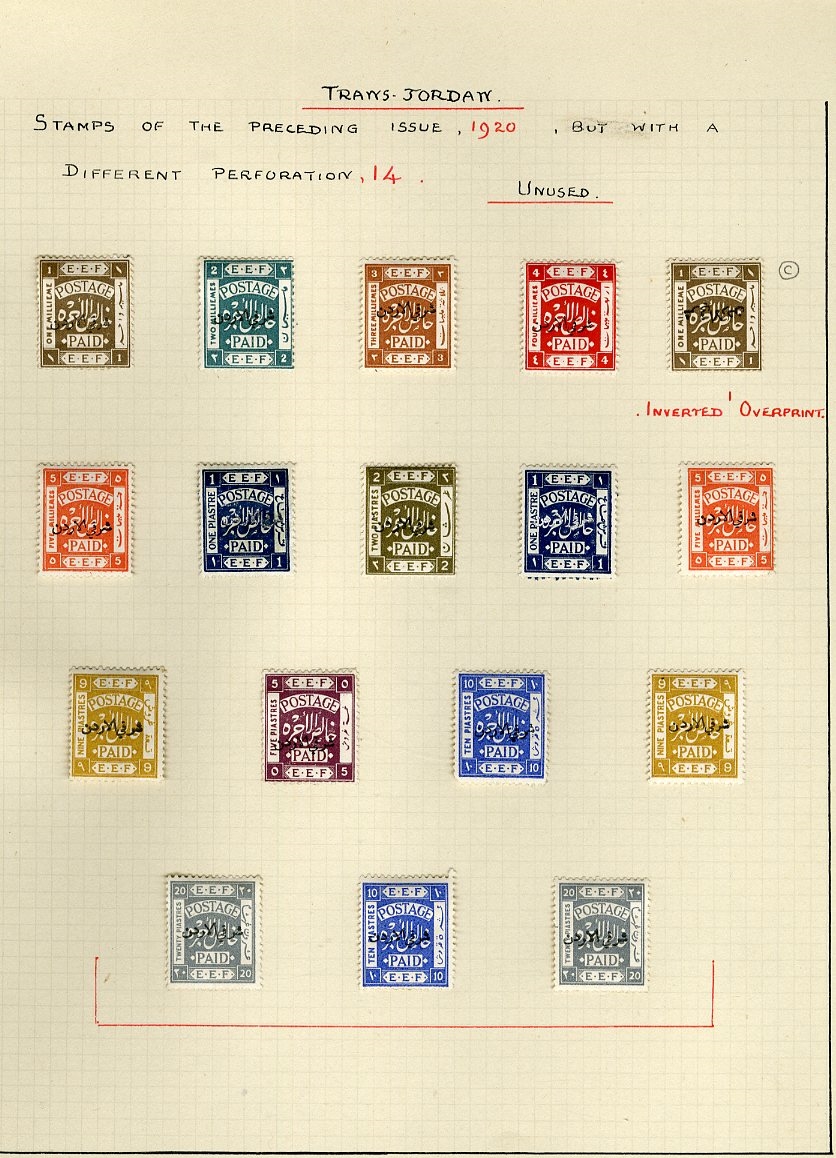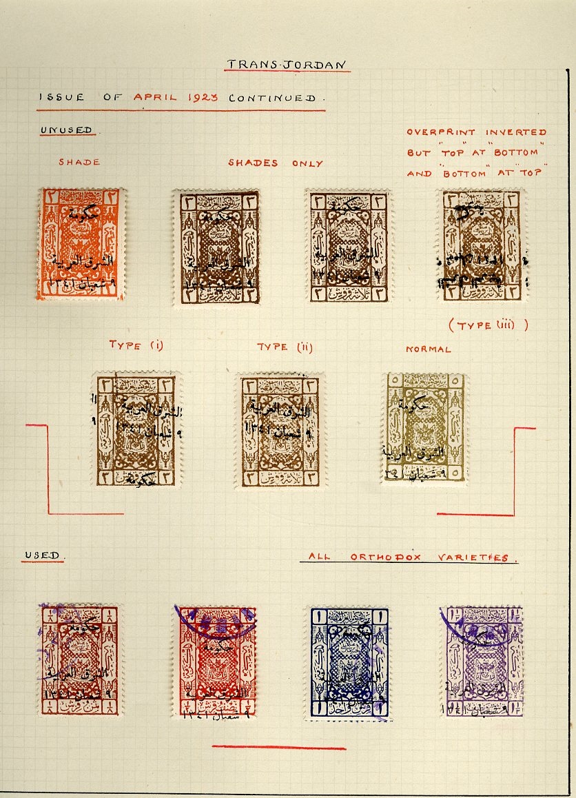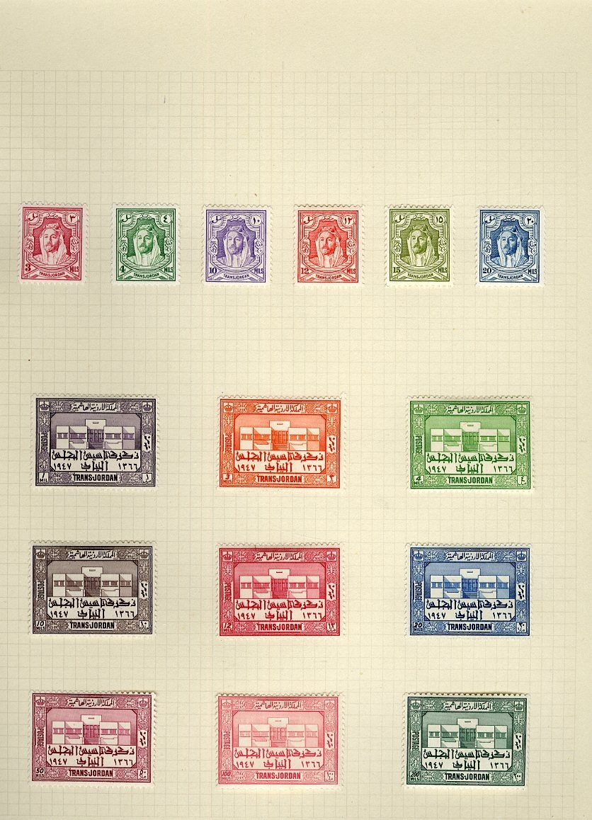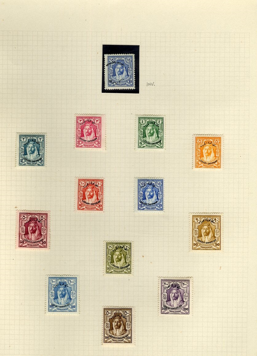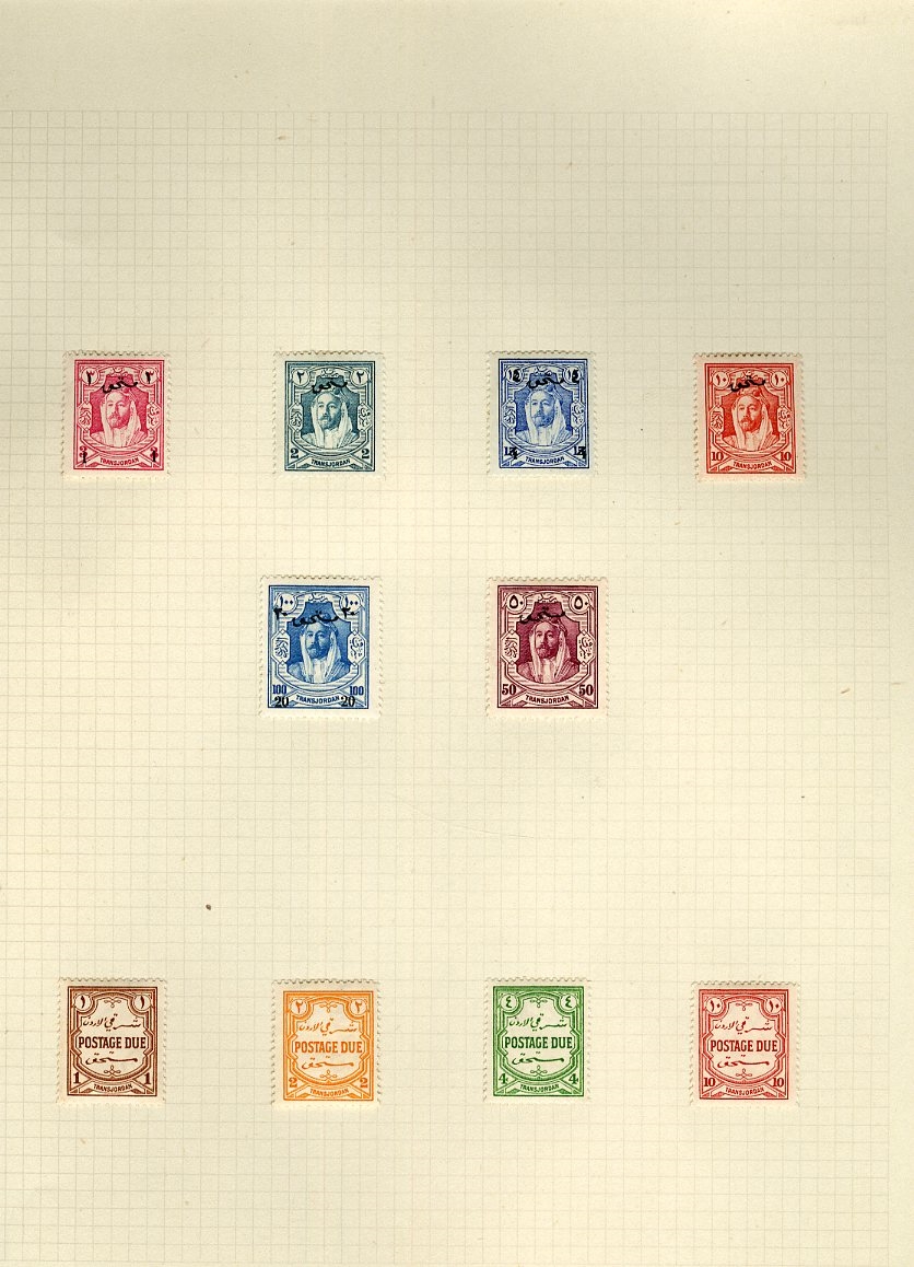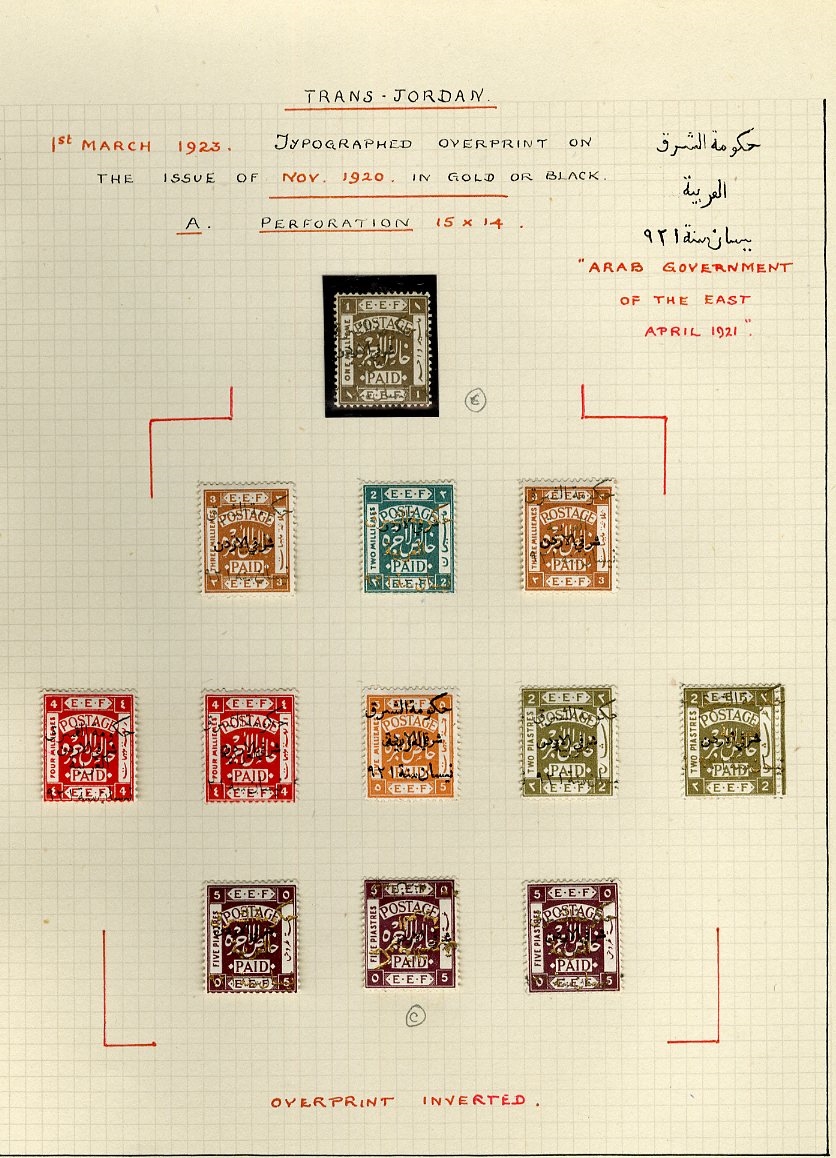 1402 og   imageJORDAN 1920-1950 predominantly unused old-time collection written up on album leaves, wealth of better items commencing with 1920 (Nov.) issue perf. 15x14 to 5p and perf. 14 to 20p (2) including 1m inverted overprint, both perfs, 1922 (Nov) surcharges perf. 15 x14 to 9p, with the scarce 5/10p on 5m (2), 2p on 2p red and black and 9p on 9p "intense black" surcharges, perf. 14 1p surcharge in red (2), 5/10p on 5m and the rare 20p on 20p, 1922 (Dec) "Govt. of Eastern Arabia" perf. 15 x14 to 9p (2) and perf. 14 to 5p, 1923 (Mar) overprints perf. 15 x14 to 5p (incl. the rare 1m with "short "k" variety (of which only one example can exist), the 5p value with inverted overprint, perf. 14 to 20p (2 one with variety), 2m with double surcharge, 20p (2) one with inverted and the other with the triple, one inverted overprint (one of only six probably known to exist), 1923 (Apr-Oct) a good range of surcharges with values to 2p on 20p, Hejaz overprints with varieties including 10p on 5p with top line of overprint omitted, 1923 (May) Independence on Palestine to 20p including two "933" for "923" date errors, 1924 (Sep-Nov) issues with blocks of four with date errors, 1925 to 20p, 1927 New Constitution, 1930 Locust set incl. 15m with inverted overprint, 1930 to £1, 1933 Tourism set to £1, thereafter complete to 1950 with imperfs, Officials and Dues. A fine and seldom offered lot in this degree of completion and a good base for expansion with a substantial catalogue value, accompanied by 20 brand new Abed Najjar certificates (Image) (Image 2) (Image 3) (Image 4) (Image 5) (Image 6) (Image 7) (Image 8) (Image 9) (Image 10) (Image 11) (Image 12) (Image 13) (Image 14) (Image 15) (Image 16) (Image 17) (Image 18) (Image 19) (Image 20) (Image 21) (Image 22) (Image 23) (Image 24) (Image 25) (Image 26) (Image 27) (Image 28) (Image 29) (Image 30) (Image 31) (Image 32) (Image 33) (Image 34) (Image 35) (Image 36) (Image 37) (Image 38) (Image 39) (Image 40) (Image 41) (Image 42) (Image 43) (Image 44) (All Images)
