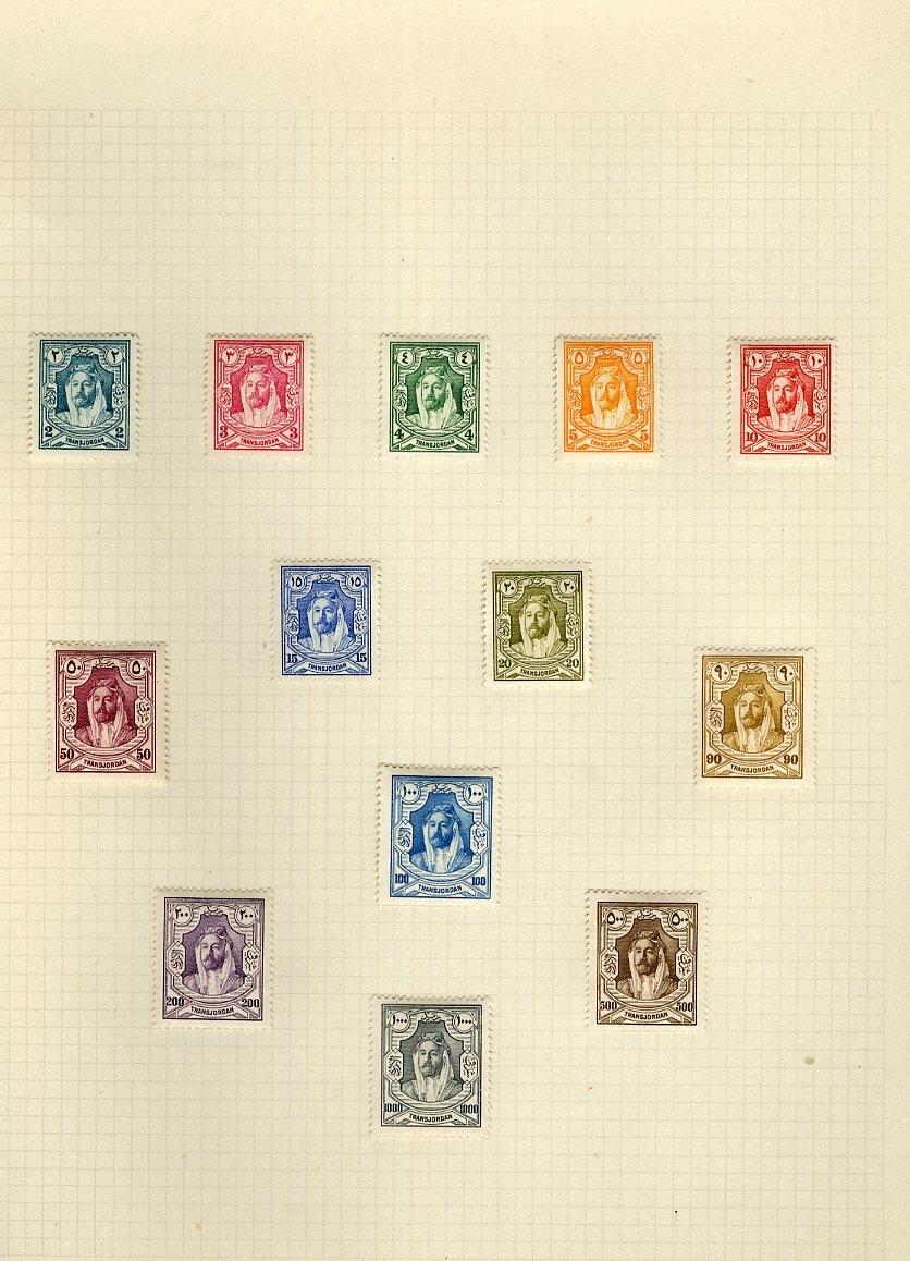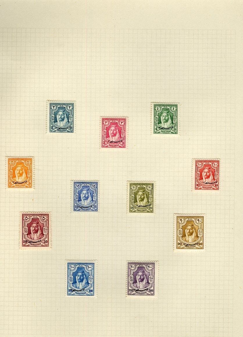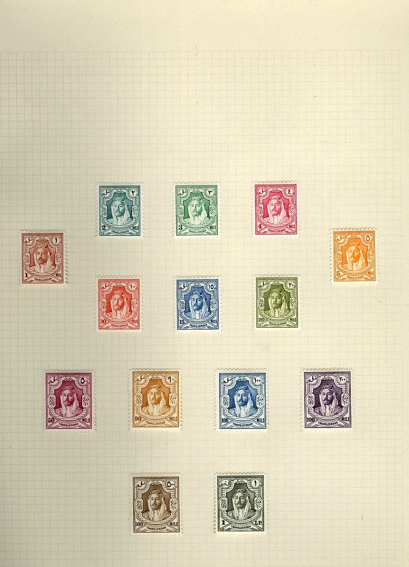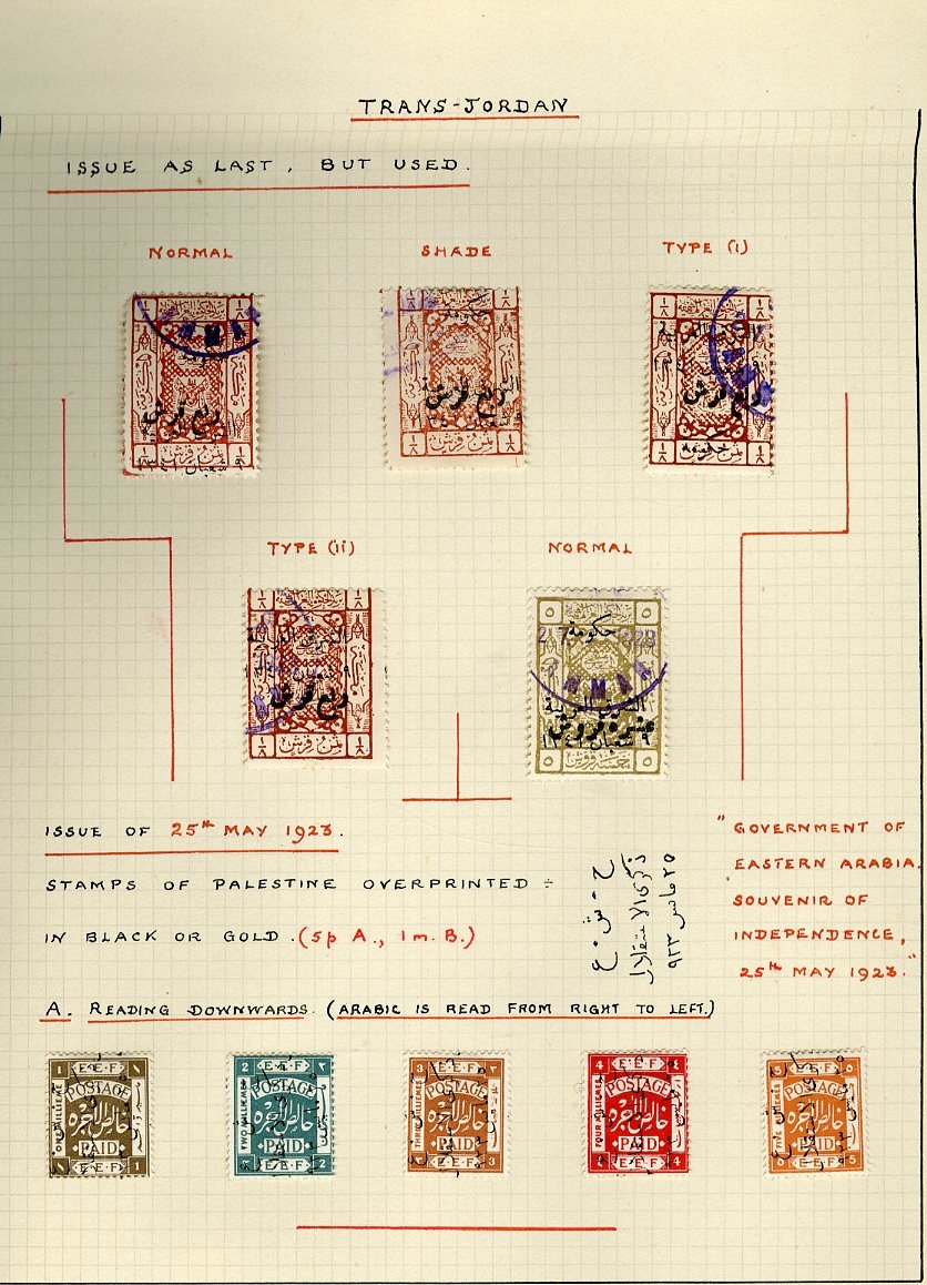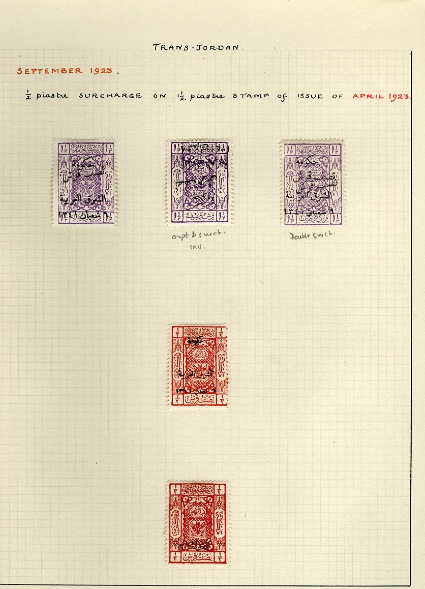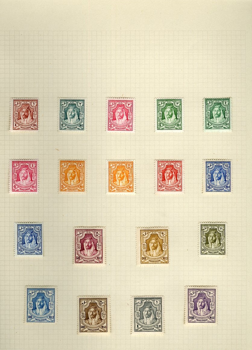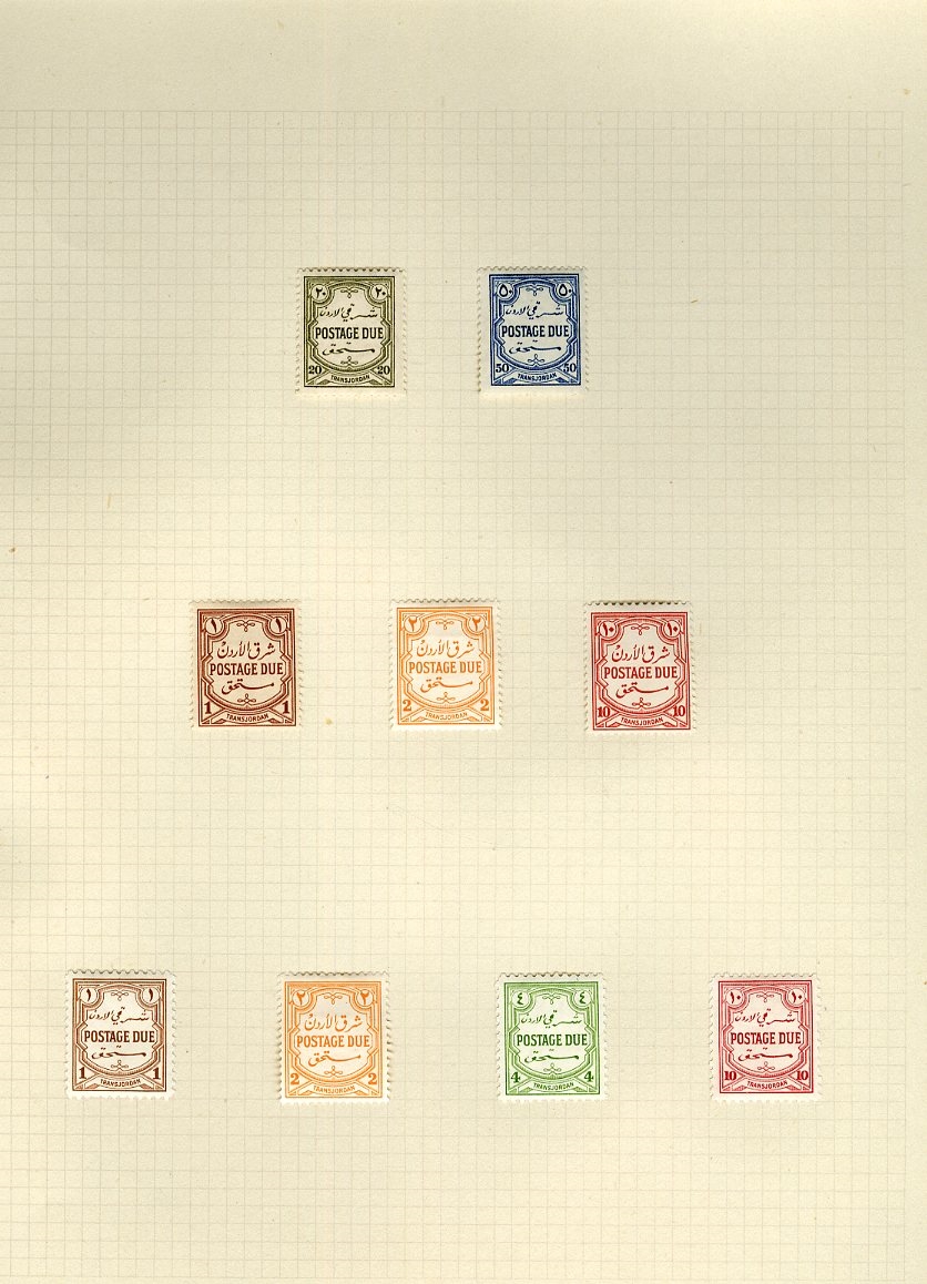 1402 og   imageJORDAN 1920-1950 predominantly unused old-time collection written up on album leaves, wealth of better items commencing with 1920 (Nov.) issue perf. 15x14 to 5p and perf. 14 to 20p (2) including 1m inverted overprint, both perfs, 1922 (Nov) surcharges perf. 15 x14 to 9p, with the scarce 5/10p on 5m (2), 2p on 2p red and black and 9p on 9p "intense black" surcharges, perf. 14 1p surcharge in red (2), 5/10p on 5m and the rare 20p on 20p, 1922 (Dec) "Govt. of Eastern Arabia" perf. 15 x14 to 9p (2) and perf. 14 to 5p, 1923 (Mar) overprints perf. 15 x14 to 5p (incl. the rare 1m with "short "k" variety (of which only one example can exist), the 5p value with inverted overprint, perf. 14 to 20p (2 one with variety), 2m with double surcharge, 20p (2) one with inverted and the other with the triple, one inverted overprint (one of only six probably known to exist), 1923 (Apr-Oct) a good range of surcharges with values to 2p on 20p, Hejaz overprints with varieties including 10p on 5p with top line of overprint omitted, 1923 (May) Independence on Palestine to 20p including two "933" for "923" date errors, 1924 (Sep-Nov) issues with blocks of four with date errors, 1925 to 20p, 1927 New Constitution, 1930 Locust set incl. 15m with inverted overprint, 1930 to £1, 1933 Tourism set to £1, thereafter complete to 1950 with imperfs, Officials and Dues. A fine and seldom offered lot in this degree of completion and a good base for expansion with a substantial catalogue value, accompanied by 20 brand new Abed Najjar certificates (Image) (Image 2) (Image 3) (Image 4) (Image 5) (Image 6) (Image 7) (Image 8) (Image 9) (Image 10) (Image 11) (Image 12) (Image 13) (Image 14) (Image 15) (Image 16) (Image 17) (Image 18) (Image 19) (Image 20) (Image 21) (Image 22) (Image 23) (Image 24) (Image 25) (Image 26) (Image 27) (Image 28) (Image 29) (Image 30) (Image 31) (Image 32) (Image 33) (Image 34) (Image 35) (Image 36) (Image 37) (Image 38) (Image 39) (Image 40) (Image 41) (Image 42) (Image 43) (Image 44) (All Images)