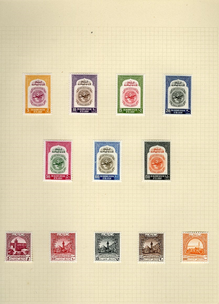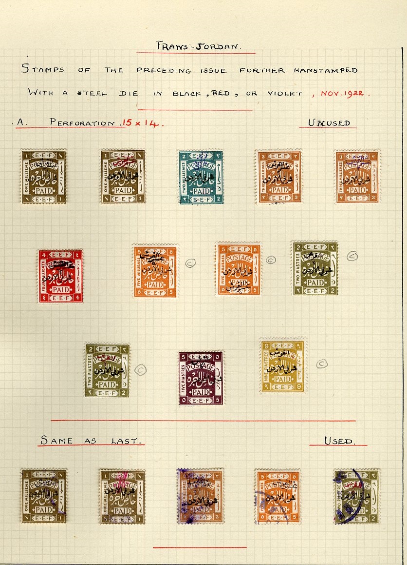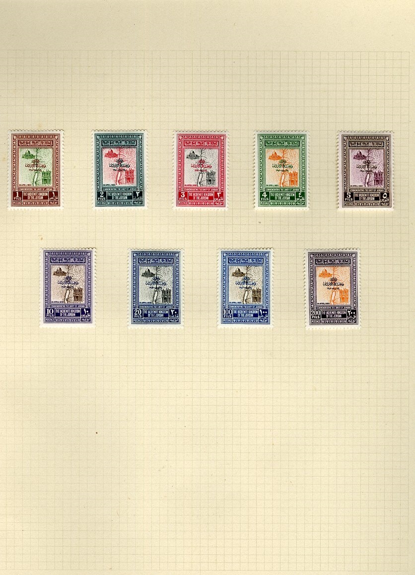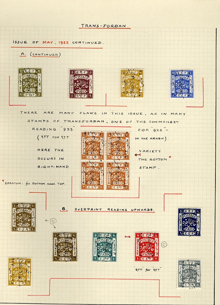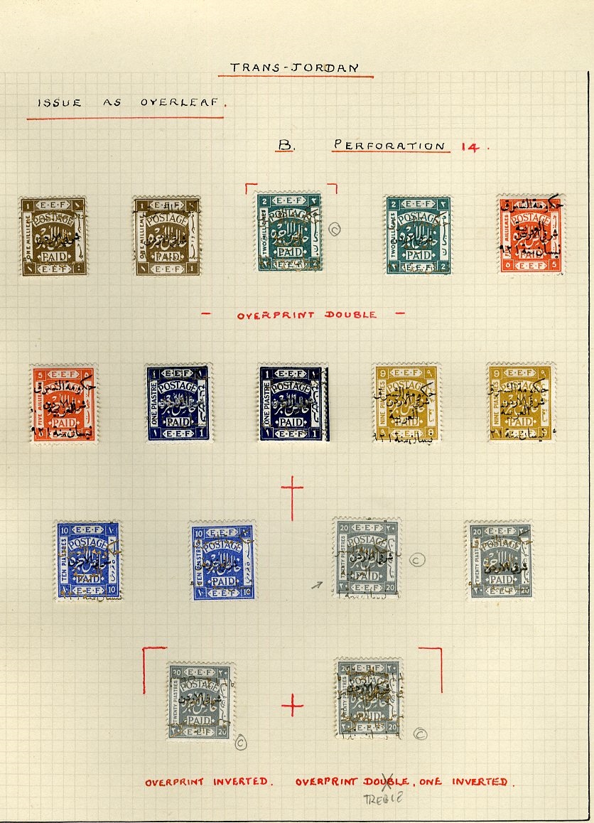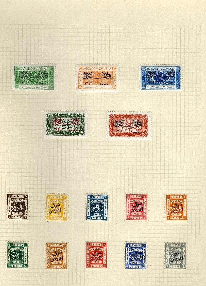 1402 og   imageJORDAN 1920-1950 predominantly unused old-time collection written up on album leaves, wealth of better items commencing with 1920 (Nov.) issue perf. 15x14 to 5p and perf. 14 to 20p (2) including 1m inverted overprint, both perfs, 1922 (Nov) surcharges perf. 15 x14 to 9p, with the scarce 5/10p on 5m (2), 2p on 2p red and black and 9p on 9p "intense black" surcharges, perf. 14 1p surcharge in red (2), 5/10p on 5m and the rare 20p on 20p, 1922 (Dec) "Govt. of Eastern Arabia" perf. 15 x14 to 9p (2) and perf. 14 to 5p, 1923 (Mar) overprints perf. 15 x14 to 5p (incl. the rare 1m with "short "k" variety (of which only one example can exist), the 5p value with inverted overprint, perf. 14 to 20p (2 one with variety), 2m with double surcharge, 20p (2) one with inverted and the other with the triple, one inverted overprint (one of only six probably known to exist), 1923 (Apr-Oct) a good range of surcharges with values to 2p on 20p, Hejaz overprints with varieties including 10p on 5p with top line of overprint omitted, 1923 (May) Independence on Palestine to 20p including two "933" for "923" date errors, 1924 (Sep-Nov) issues with blocks of four with date errors, 1925 to 20p, 1927 New Constitution, 1930 Locust set incl. 15m with inverted overprint, 1930 to £1, 1933 Tourism set to £1, thereafter complete to 1950 with imperfs, Officials and Dues. A fine and seldom offered lot in this degree of completion and a good base for expansion with a substantial catalogue value, accompanied by 20 brand new Abed Najjar certificates (Image) (Image 2) (Image 3) (Image 4) (Image 5) (Image 6) (Image 7) (Image 8) (Image 9) (Image 10) (Image 11) (Image 12) (Image 13) (Image 14) (Image 15) (Image 16) (Image 17) (Image 18) (Image 19) (Image 20) (Image 21) (Image 22) (Image 23) (Image 24) (Image 25) (Image 26) (Image 27) (Image 28) (Image 29) (Image 30) (Image 31) (Image 32) (Image 33) (Image 34) (Image 35) (Image 36) (Image 37) (Image 38) (Image 39) (Image 40) (Image 41) (Image 42) (Image 43) (Image 44) (All Images)