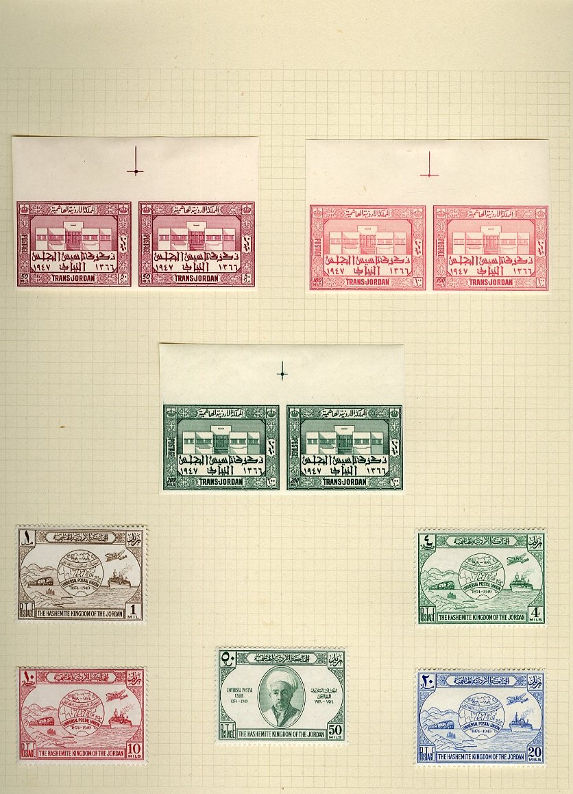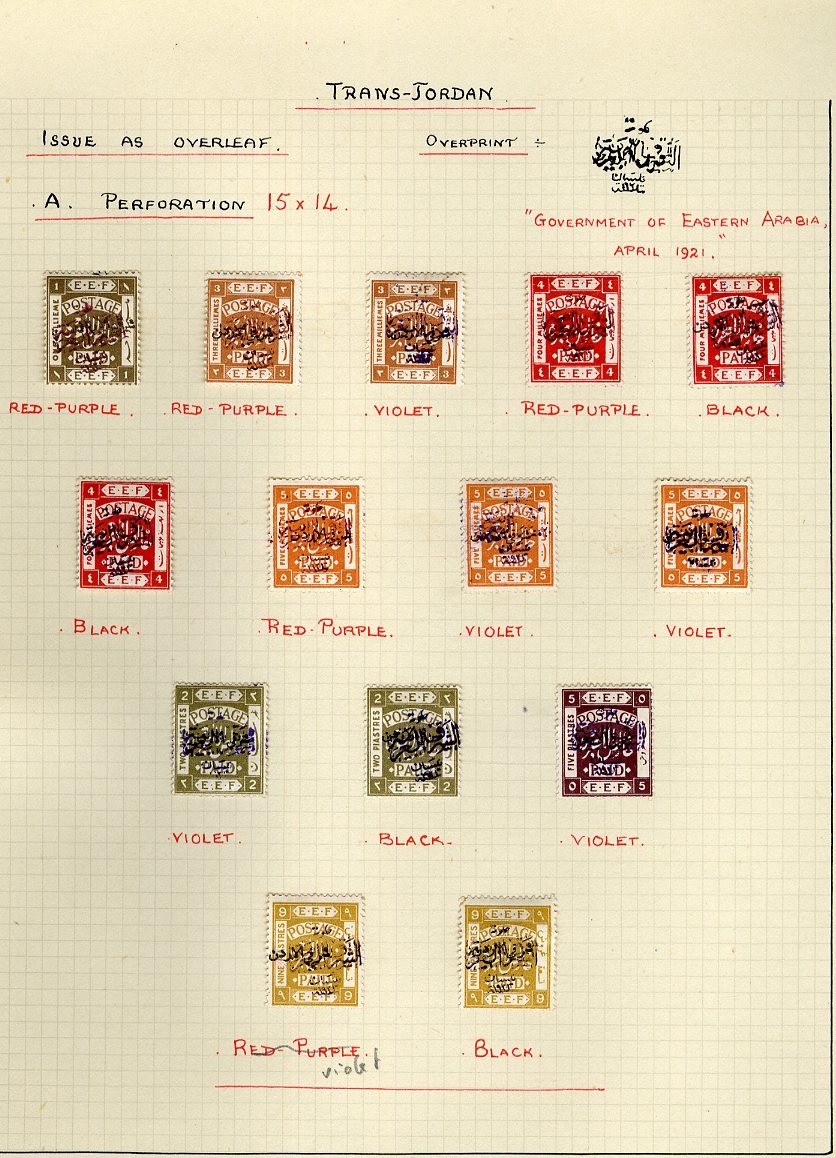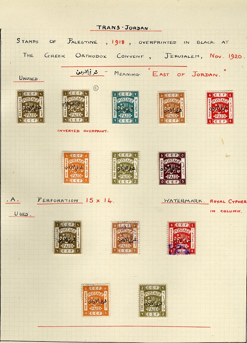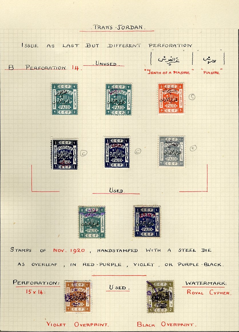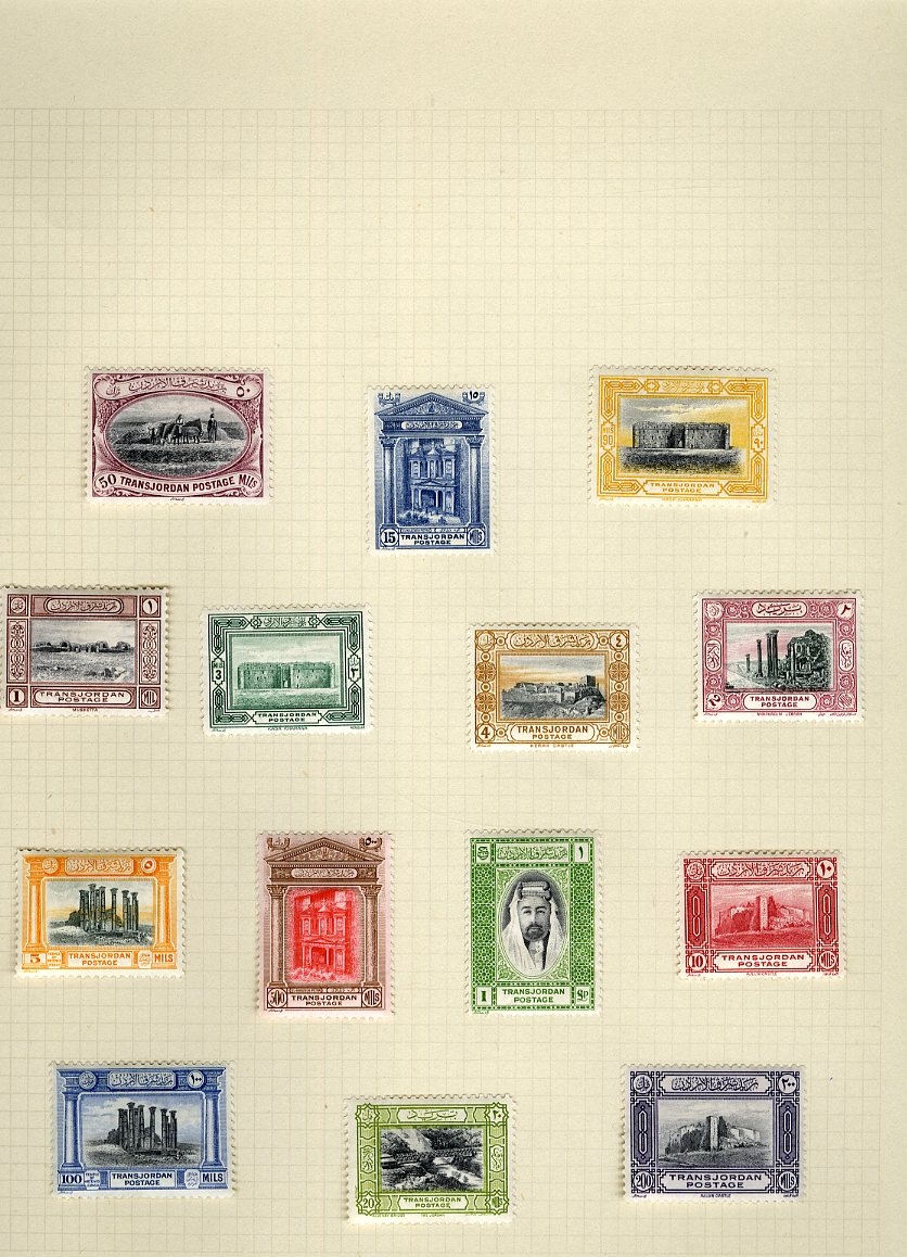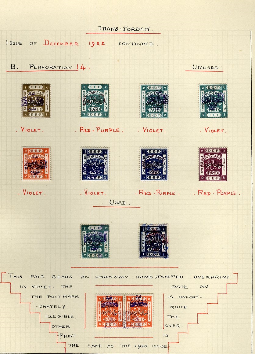 1402 og   imageJORDAN 1920-1950 predominantly unused old-time collection written up on album leaves, wealth of better items commencing with 1920 (Nov.) issue perf. 15x14 to 5p and perf. 14 to 20p (2) including 1m inverted overprint, both perfs, 1922 (Nov) surcharges perf. 15 x14 to 9p, with the scarce 5/10p on 5m (2), 2p on 2p red and black and 9p on 9p "intense black" surcharges, perf. 14 1p surcharge in red (2), 5/10p on 5m and the rare 20p on 20p, 1922 (Dec) "Govt. of Eastern Arabia" perf. 15 x14 to 9p (2) and perf. 14 to 5p, 1923 (Mar) overprints perf. 15 x14 to 5p (incl. the rare 1m with "short "k" variety (of which only one example can exist), the 5p value with inverted overprint, perf. 14 to 20p (2 one with variety), 2m with double surcharge, 20p (2) one with inverted and the other with the triple, one inverted overprint (one of only six probably known to exist), 1923 (Apr-Oct) a good range of surcharges with values to 2p on 20p, Hejaz overprints with varieties including 10p on 5p with top line of overprint omitted, 1923 (May) Independence on Palestine to 20p including two "933" for "923" date errors, 1924 (Sep-Nov) issues with blocks of four with date errors, 1925 to 20p, 1927 New Constitution, 1930 Locust set incl. 15m with inverted overprint, 1930 to £1, 1933 Tourism set to £1, thereafter complete to 1950 with imperfs, Officials and Dues. A fine and seldom offered lot in this degree of completion and a good base for expansion with a substantial catalogue value, accompanied by 20 brand new Abed Najjar certificates (Image) (Image 2) (Image 3) (Image 4) (Image 5) (Image 6) (Image 7) (Image 8) (Image 9) (Image 10) (Image 11) (Image 12) (Image 13) (Image 14) (Image 15) (Image 16) (Image 17) (Image 18) (Image 19) (Image 20) (Image 21) (Image 22) (Image 23) (Image 24) (Image 25) (Image 26) (Image 27) (Image 28) (Image 29) (Image 30) (Image 31) (Image 32) (Image 33) (Image 34) (Image 35) (Image 36) (Image 37) (Image 38) (Image 39) (Image 40) (Image 41) (Image 42) (Image 43) (Image 44) (All Images)