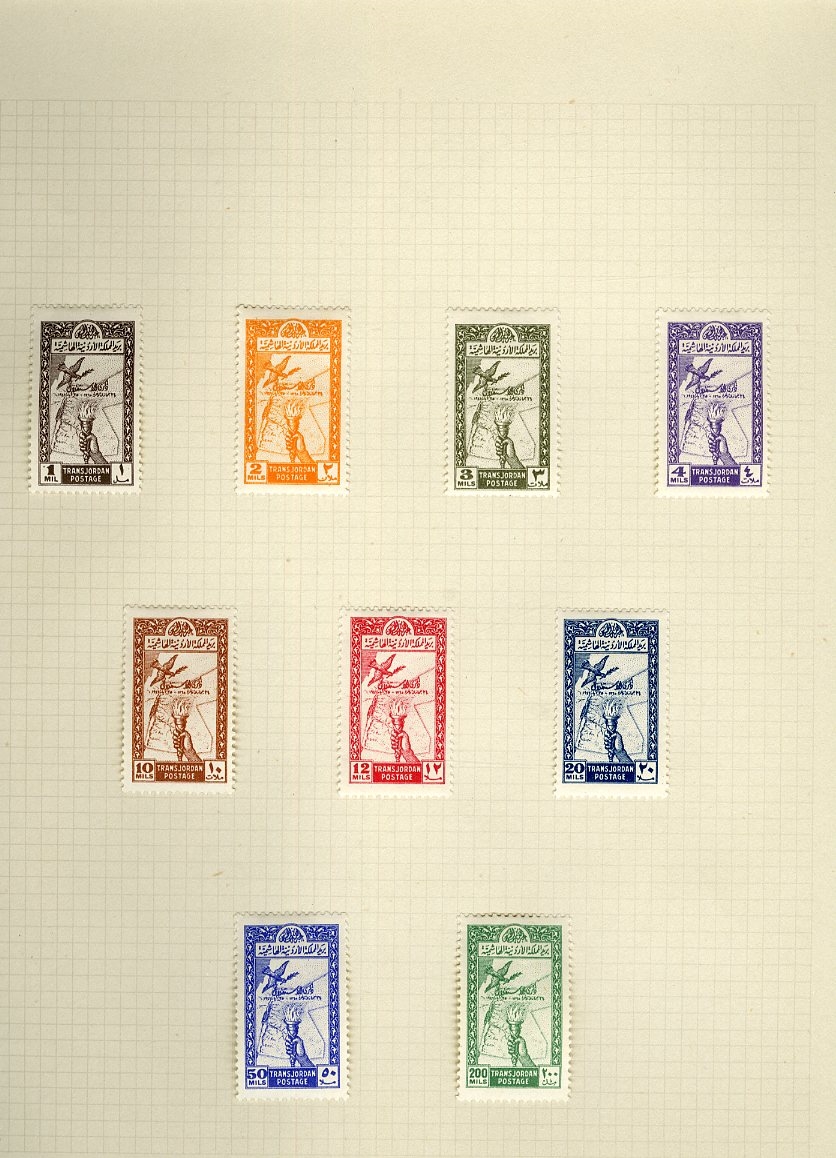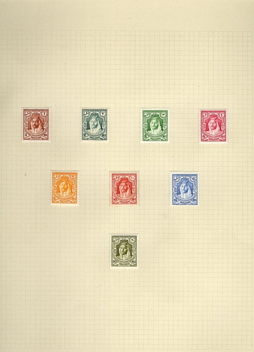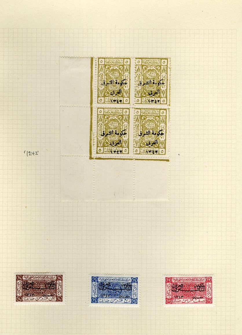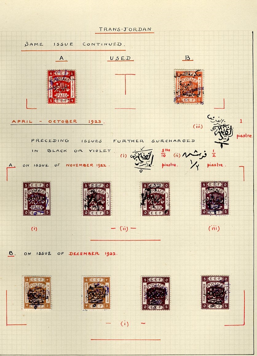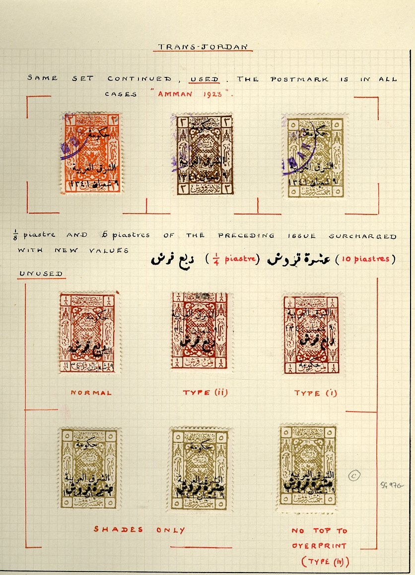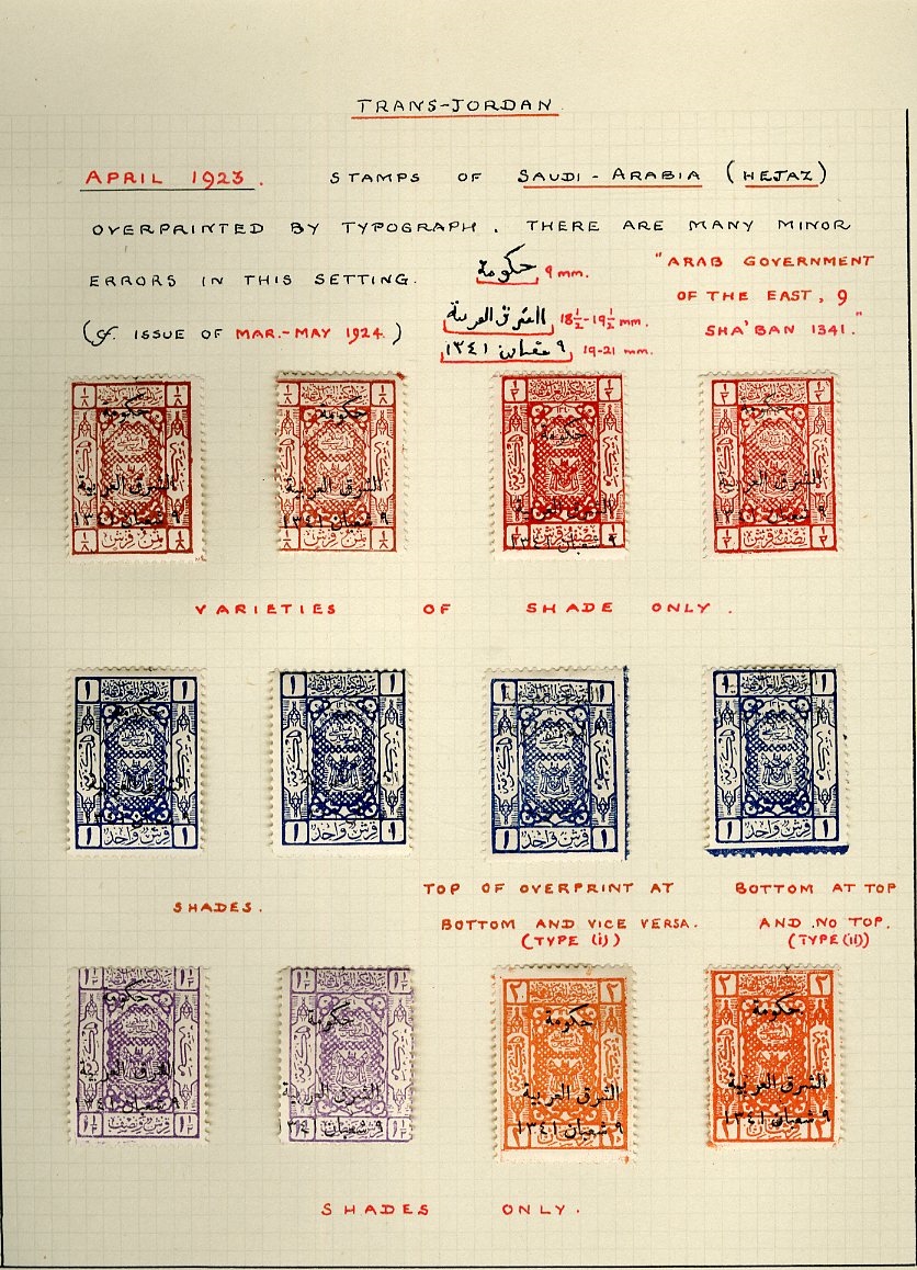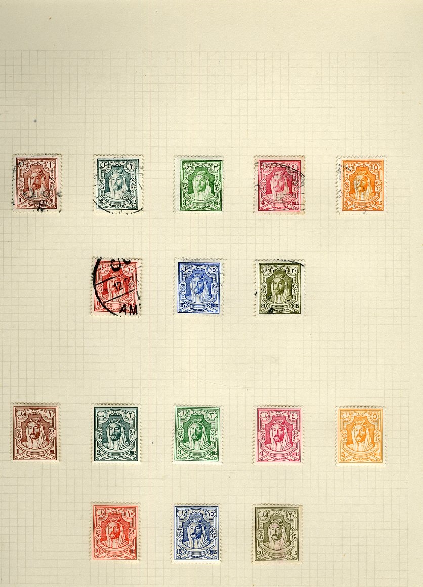 1402 og   imageJORDAN 1920-1950 predominantly unused old-time collection written up on album leaves, wealth of better items commencing with 1920 (Nov.) issue perf. 15x14 to 5p and perf. 14 to 20p (2) including 1m inverted overprint, both perfs, 1922 (Nov) surcharges perf. 15 x14 to 9p, with the scarce 5/10p on 5m (2), 2p on 2p red and black and 9p on 9p "intense black" surcharges, perf. 14 1p surcharge in red (2), 5/10p on 5m and the rare 20p on 20p, 1922 (Dec) "Govt. of Eastern Arabia" perf. 15 x14 to 9p (2) and perf. 14 to 5p, 1923 (Mar) overprints perf. 15 x14 to 5p (incl. the rare 1m with "short "k" variety (of which only one example can exist), the 5p value with inverted overprint, perf. 14 to 20p (2 one with variety), 2m with double surcharge, 20p (2) one with inverted and the other with the triple, one inverted overprint (one of only six probably known to exist), 1923 (Apr-Oct) a good range of surcharges with values to 2p on 20p, Hejaz overprints with varieties including 10p on 5p with top line of overprint omitted, 1923 (May) Independence on Palestine to 20p including two "933" for "923" date errors, 1924 (Sep-Nov) issues with blocks of four with date errors, 1925 to 20p, 1927 New Constitution, 1930 Locust set incl. 15m with inverted overprint, 1930 to £1, 1933 Tourism set to £1, thereafter complete to 1950 with imperfs, Officials and Dues. A fine and seldom offered lot in this degree of completion and a good base for expansion with a substantial catalogue value, accompanied by 20 brand new Abed Najjar certificates (Image) (Image 2) (Image 3) (Image 4) (Image 5) (Image 6) (Image 7) (Image 8) (Image 9) (Image 10) (Image 11) (Image 12) (Image 13) (Image 14) (Image 15) (Image 16) (Image 17) (Image 18) (Image 19) (Image 20) (Image 21) (Image 22) (Image 23) (Image 24) (Image 25) (Image 26) (Image 27) (Image 28) (Image 29) (Image 30) (Image 31) (Image 32) (Image 33) (Image 34) (Image 35) (Image 36) (Image 37) (Image 38) (Image 39) (Image 40) (Image 41) (Image 42) (Image 43) (Image 44) (All Images)