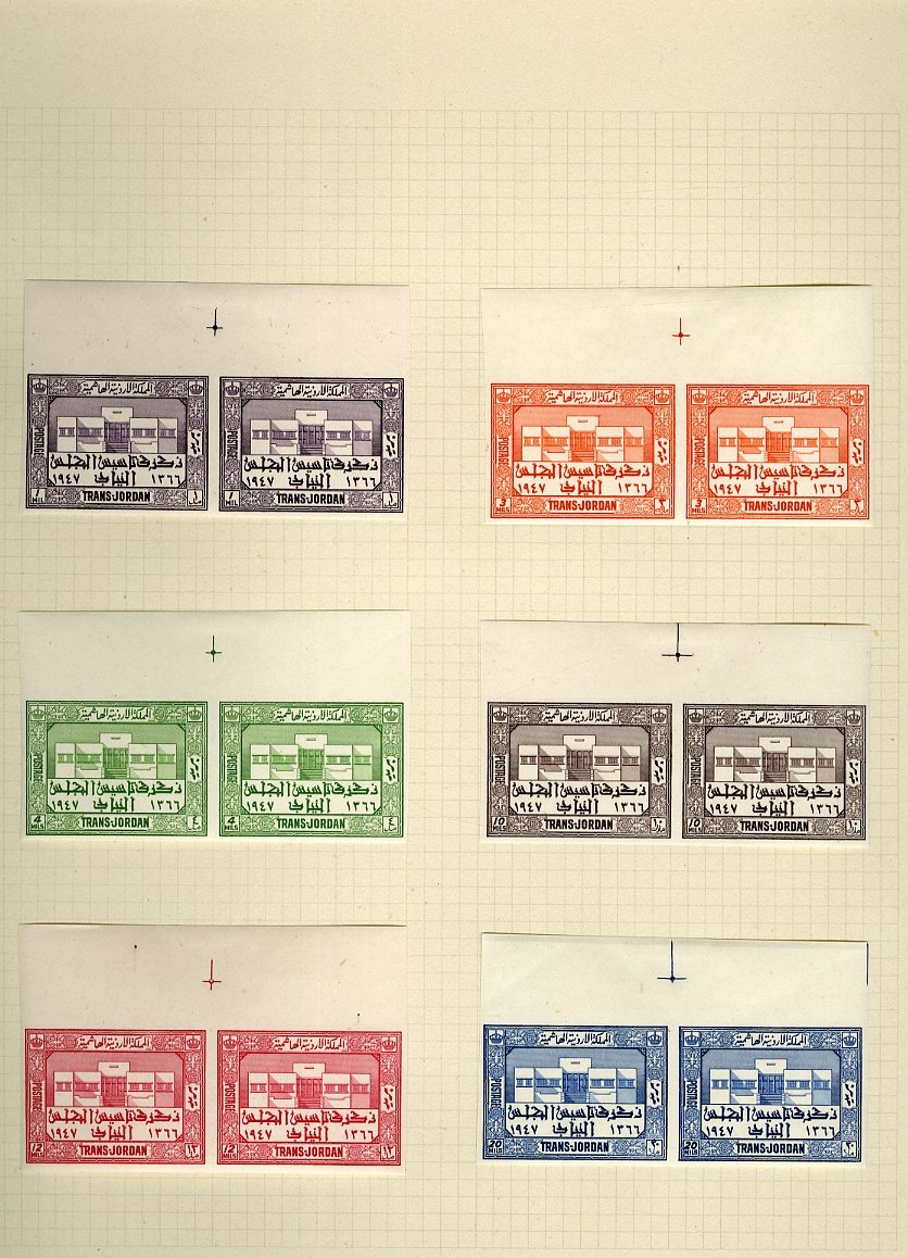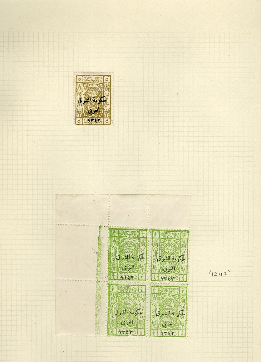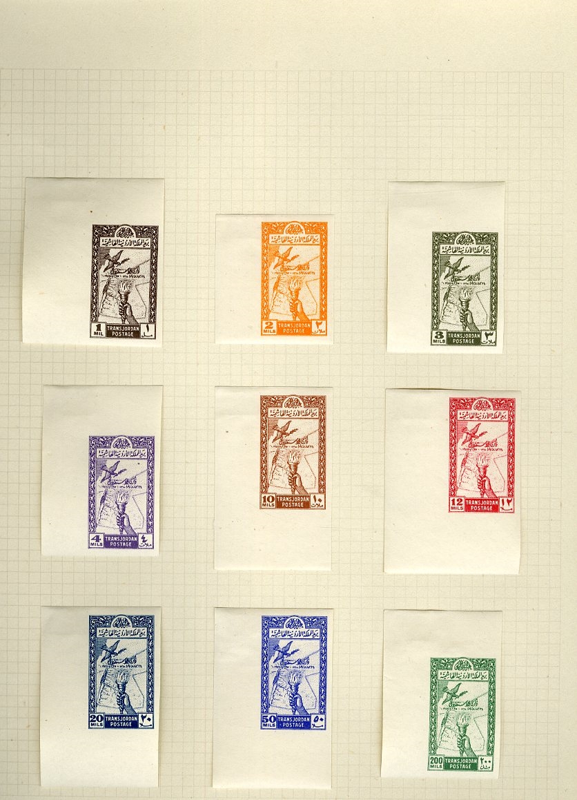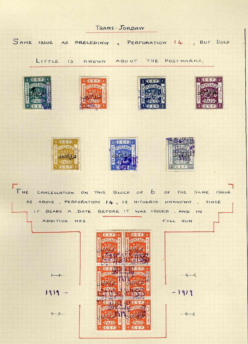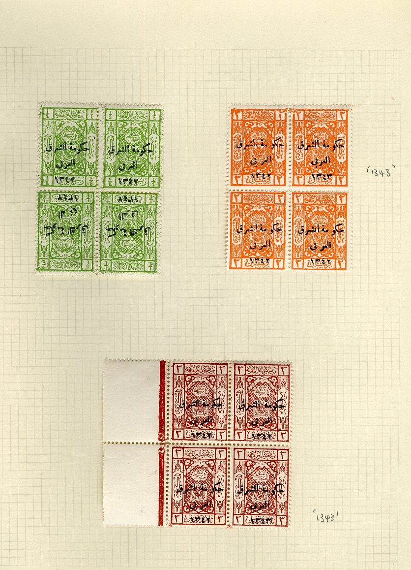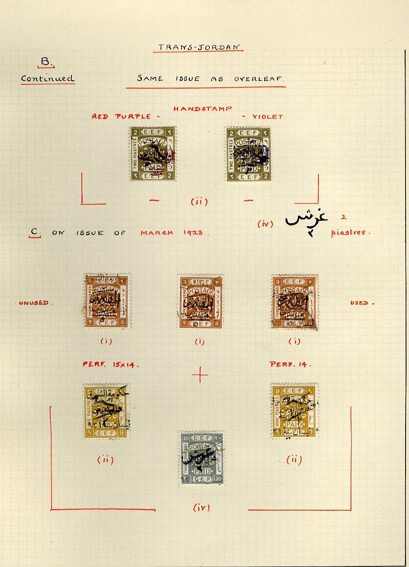 1402 og   imageJORDAN 1920-1950 predominantly unused old-time collection written up on album leaves, wealth of better items commencing with 1920 (Nov.) issue perf. 15x14 to 5p and perf. 14 to 20p (2) including 1m inverted overprint, both perfs, 1922 (Nov) surcharges perf. 15 x14 to 9p, with the scarce 5/10p on 5m (2), 2p on 2p red and black and 9p on 9p "intense black" surcharges, perf. 14 1p surcharge in red (2), 5/10p on 5m and the rare 20p on 20p, 1922 (Dec) "Govt. of Eastern Arabia" perf. 15 x14 to 9p (2) and perf. 14 to 5p, 1923 (Mar) overprints perf. 15 x14 to 5p (incl. the rare 1m with "short "k" variety (of which only one example can exist), the 5p value with inverted overprint, perf. 14 to 20p (2 one with variety), 2m with double surcharge, 20p (2) one with inverted and the other with the triple, one inverted overprint (one of only six probably known to exist), 1923 (Apr-Oct) a good range of surcharges with values to 2p on 20p, Hejaz overprints with varieties including 10p on 5p with top line of overprint omitted, 1923 (May) Independence on Palestine to 20p including two "933" for "923" date errors, 1924 (Sep-Nov) issues with blocks of four with date errors, 1925 to 20p, 1927 New Constitution, 1930 Locust set incl. 15m with inverted overprint, 1930 to £1, 1933 Tourism set to £1, thereafter complete to 1950 with imperfs, Officials and Dues. A fine and seldom offered lot in this degree of completion and a good base for expansion with a substantial catalogue value, accompanied by 20 brand new Abed Najjar certificates (Image) (Image 2) (Image 3) (Image 4) (Image 5) (Image 6) (Image 7) (Image 8) (Image 9) (Image 10) (Image 11) (Image 12) (Image 13) (Image 14) (Image 15) (Image 16) (Image 17) (Image 18) (Image 19) (Image 20) (Image 21) (Image 22) (Image 23) (Image 24) (Image 25) (Image 26) (Image 27) (Image 28) (Image 29) (Image 30) (Image 31) (Image 32) (Image 33) (Image 34) (Image 35) (Image 36) (Image 37) (Image 38) (Image 39) (Image 40) (Image 41) (Image 42) (Image 43) (Image 44) (All Images)