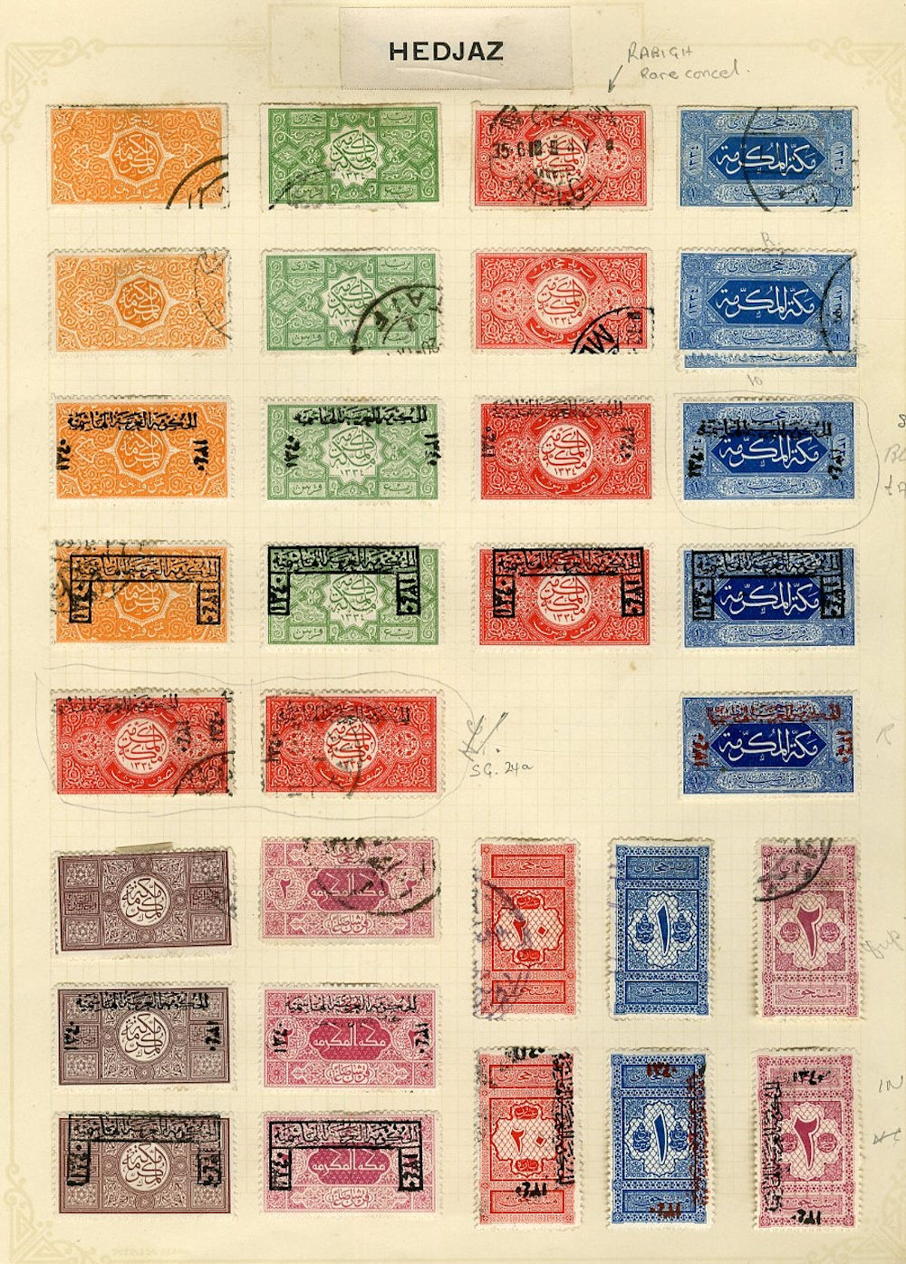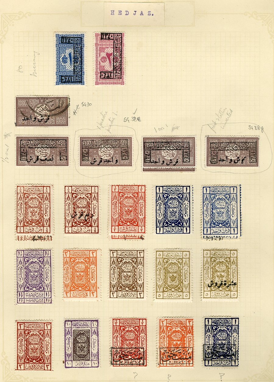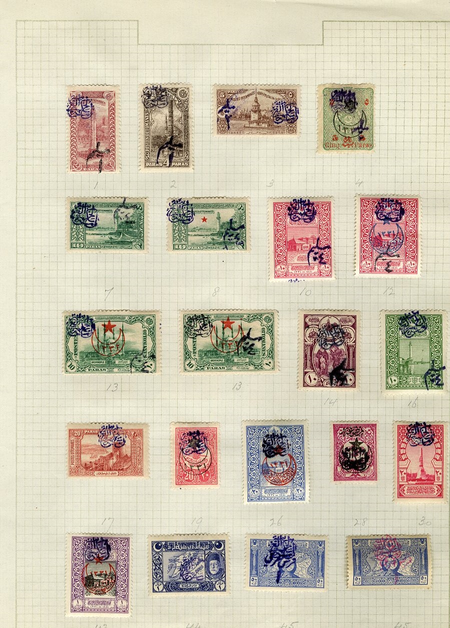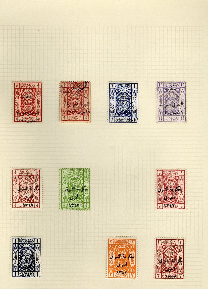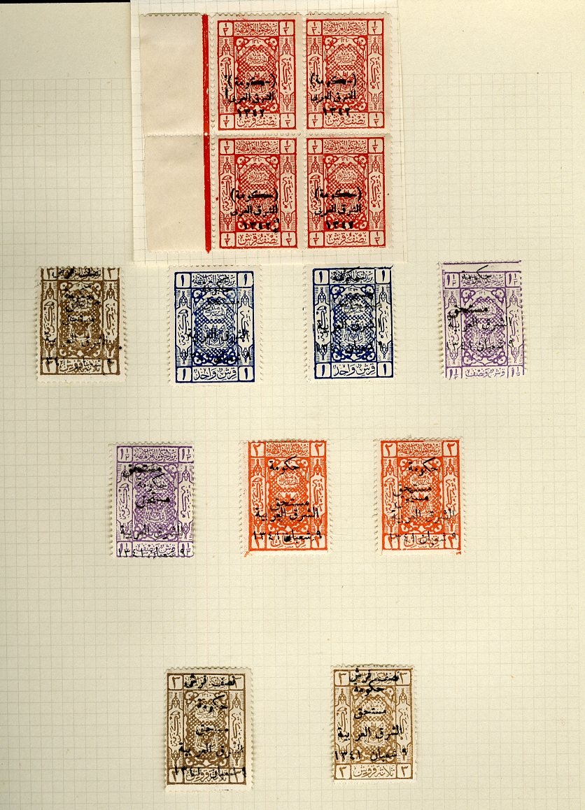 1406 O, og   imageMIDDLE EAST 1920-22 collection on album leaves, used and unused singles and sets, Saudi Arabia Hejaz 1921-22 issues with better values, noted 1921 1pi on 1pa used, 1922 1pi on 1pa with words of surcharge transposed and right hand character of surcharge inverted varieties, Syria T.E.O. overprint on France, 4m, 5m, 1p, 2p and 4p values, on the Levant values including the scarce 20p on 5f, 1920-21 Rosette overprint in black 25c on 1c-25p on 50c and in red 5c on 1c to 25p on 50c, etc. Arab Kingdom handstamps on two pages, Cilicia overprints on three pages, Turkey range, noted 1914 Abolition set 10p unused and others, mixed condition, some some stuck down (Image) (Image 2) (Image 3) (Image 4) (Image 5) (Image 6) (Image 7) (Image 8) (Image 9) (Image 10) (Image 11) (Image 12) (Image 13) (Image 14) (Image 15) (Image 16) (Image 17) (Image 18) (Image 19) (Image 20) (Image 21) (All Images)
