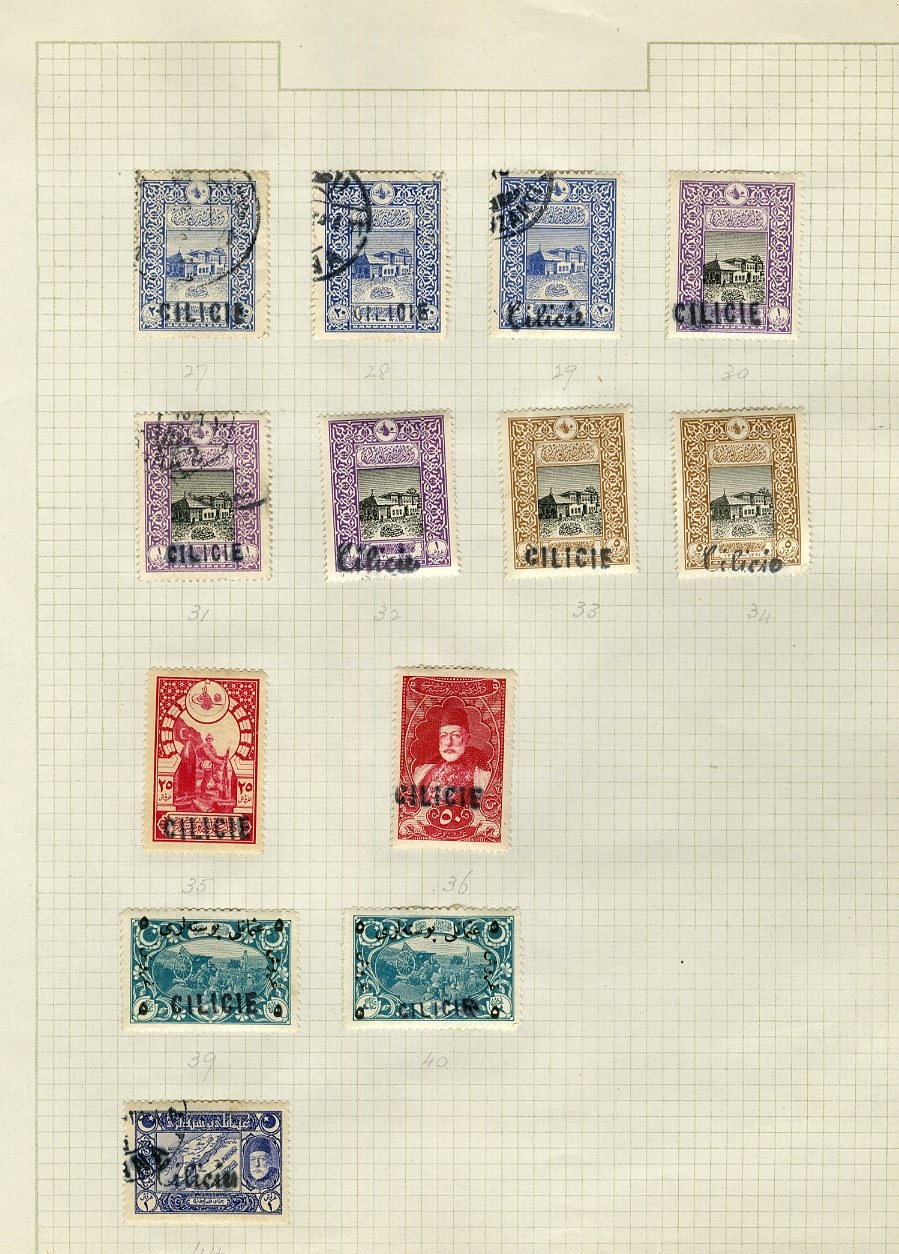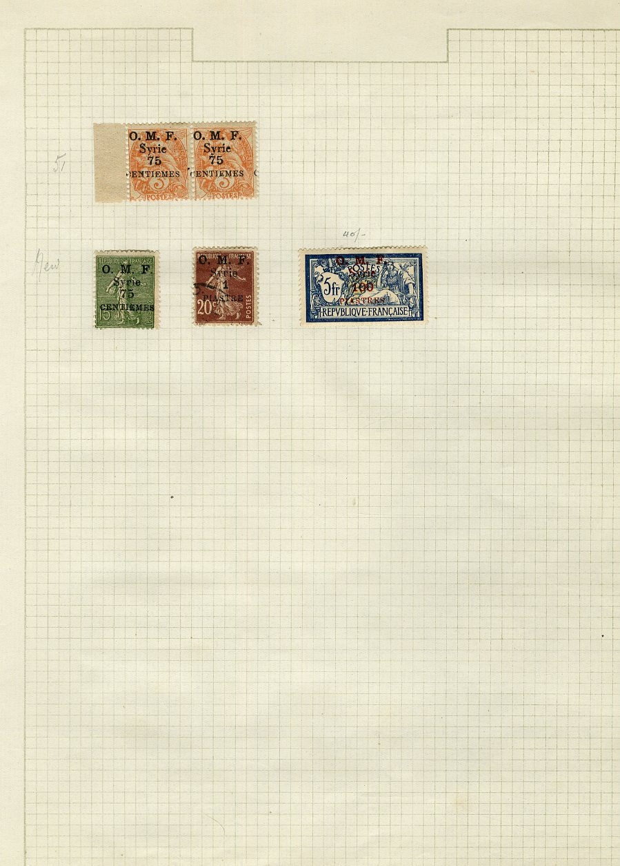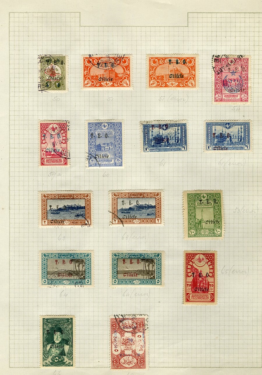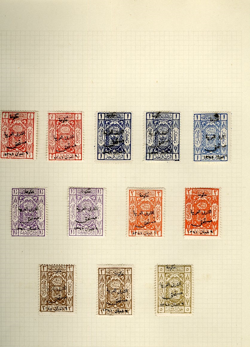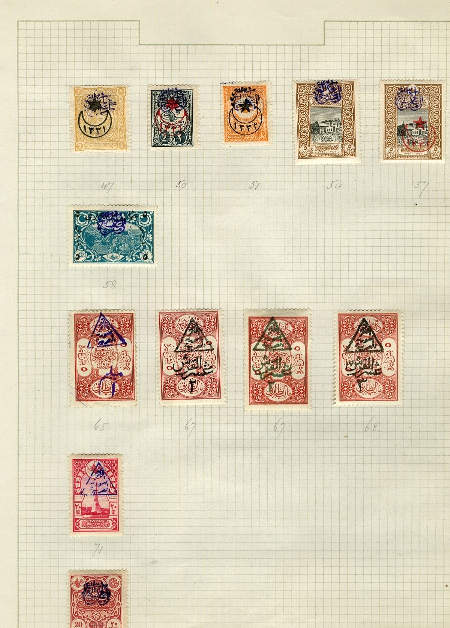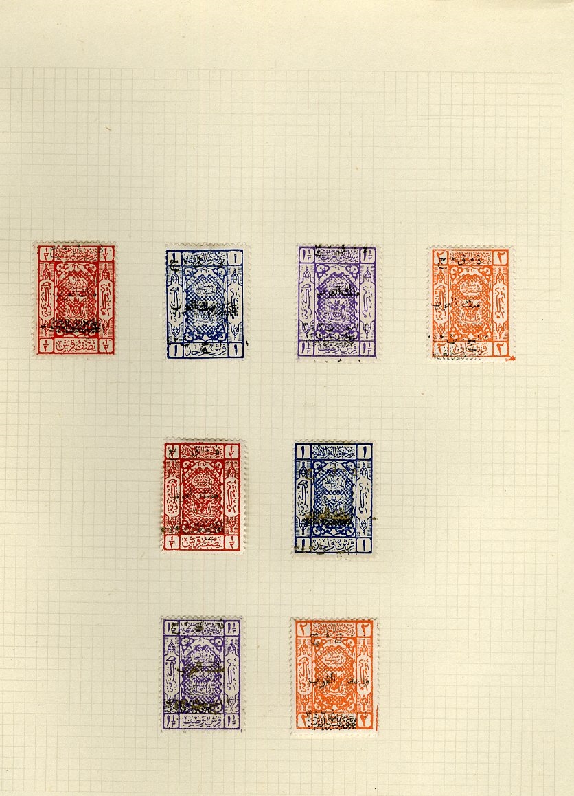 1406 O, og   imageMIDDLE EAST 1920-22 collection on album leaves, used and unused singles and sets, Saudi Arabia Hejaz 1921-22 issues with better values, noted 1921 1pi on 1pa used, 1922 1pi on 1pa with words of surcharge transposed and right hand character of surcharge inverted varieties, Syria T.E.O. overprint on France, 4m, 5m, 1p, 2p and 4p values, on the Levant values including the scarce 20p on 5f, 1920-21 Rosette overprint in black 25c on 1c-25p on 50c and in red 5c on 1c to 25p on 50c, etc. Arab Kingdom handstamps on two pages, Cilicia overprints on three pages, Turkey range, noted 1914 Abolition set 10p unused and others, mixed condition, some some stuck down (Image) (Image 2) (Image 3) (Image 4) (Image 5) (Image 6) (Image 7) (Image 8) (Image 9) (Image 10) (Image 11) (Image 12) (Image 13) (Image 14) (Image 15) (Image 16) (Image 17) (Image 18) (Image 19) (Image 20) (Image 21) (All Images)