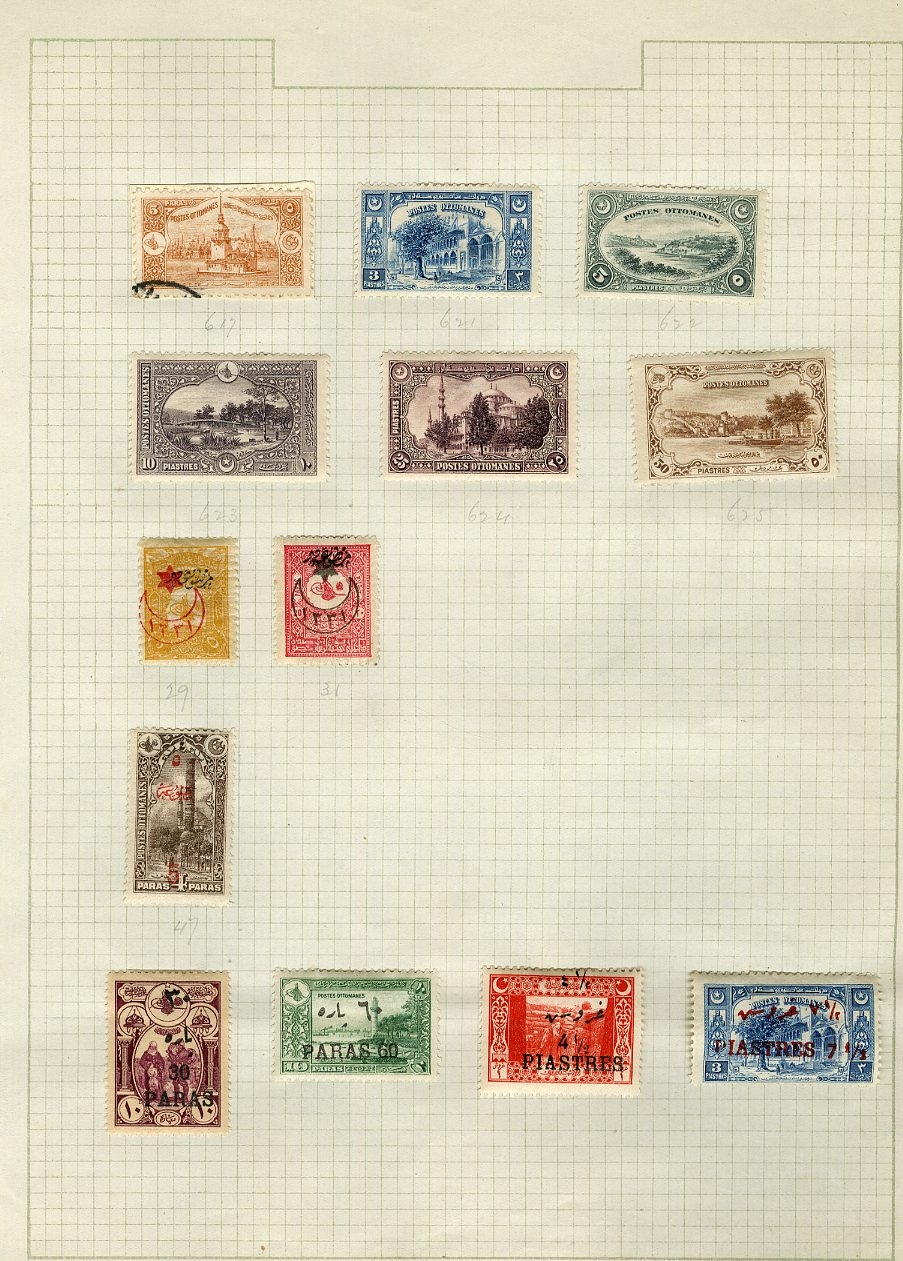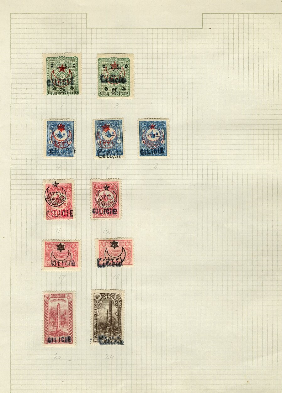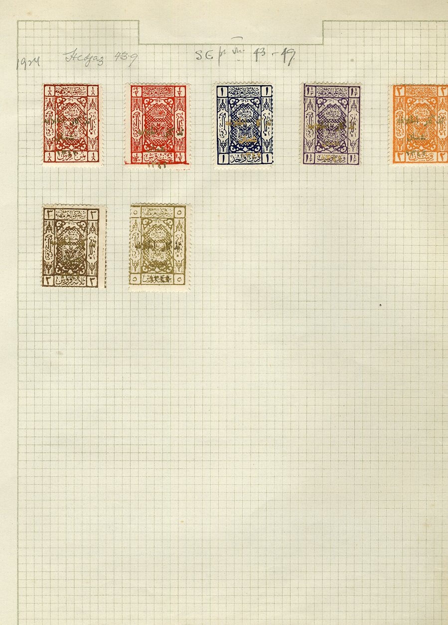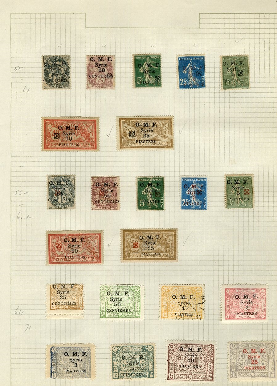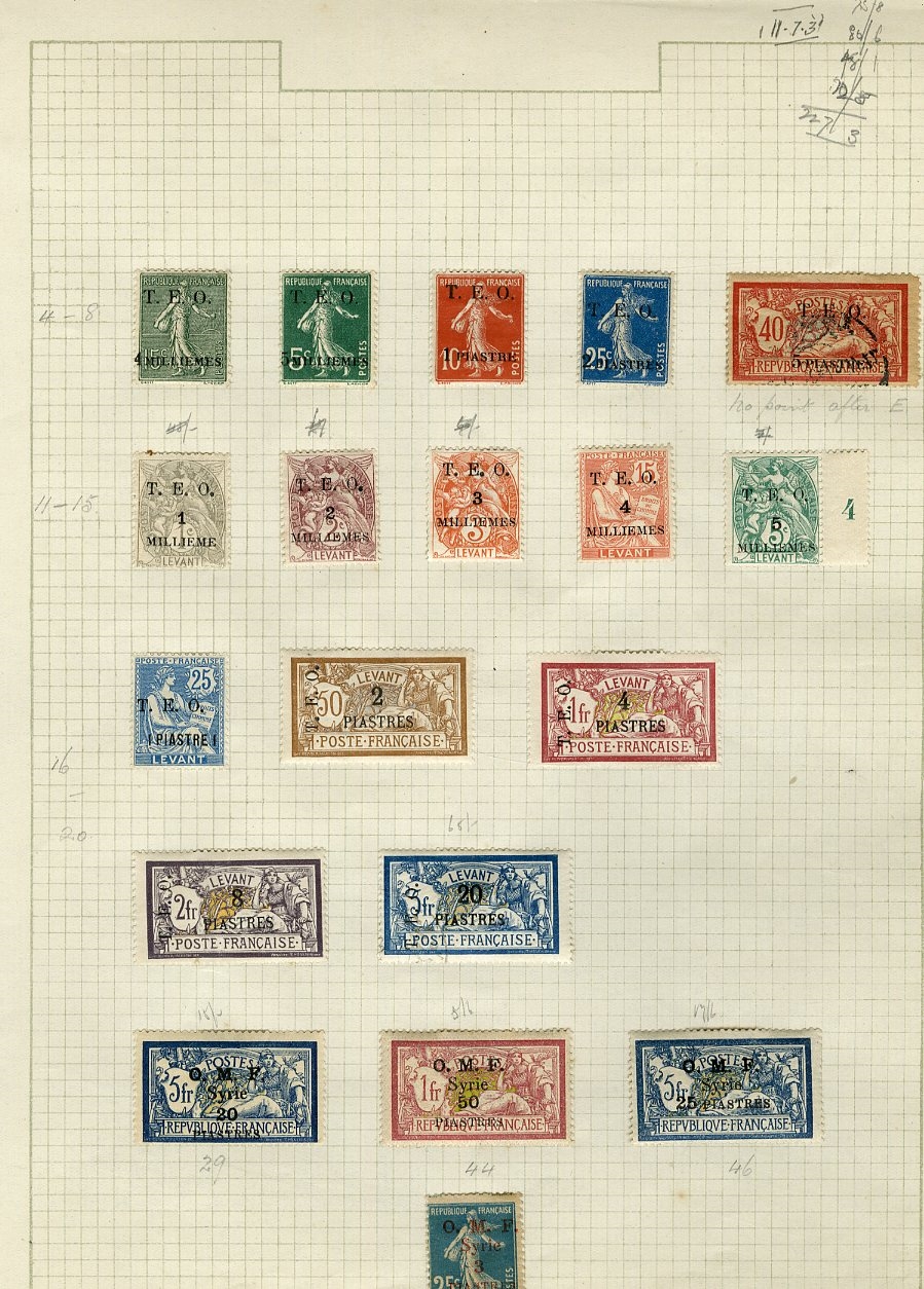 1406 O, og   imageMIDDLE EAST 1920-22 collection on album leaves, used and unused singles and sets, Saudi Arabia Hejaz 1921-22 issues with better values, noted 1921 1pi on 1pa used, 1922 1pi on 1pa with words of surcharge transposed and right hand character of surcharge inverted varieties, Syria T.E.O. overprint on France, 4m, 5m, 1p, 2p and 4p values, on the Levant values including the scarce 20p on 5f, 1920-21 Rosette overprint in black 25c on 1c-25p on 50c and in red 5c on 1c to 25p on 50c, etc. Arab Kingdom handstamps on two pages, Cilicia overprints on three pages, Turkey range, noted 1914 Abolition set 10p unused and others, mixed condition, some some stuck down (Image) (Image 2) (Image 3) (Image 4) (Image 5) (Image 6) (Image 7) (Image 8) (Image 9) (Image 10) (Image 11) (Image 12) (Image 13) (Image 14) (Image 15) (Image 16) (Image 17) (Image 18) (Image 19) (Image 20) (Image 21) (All Images)