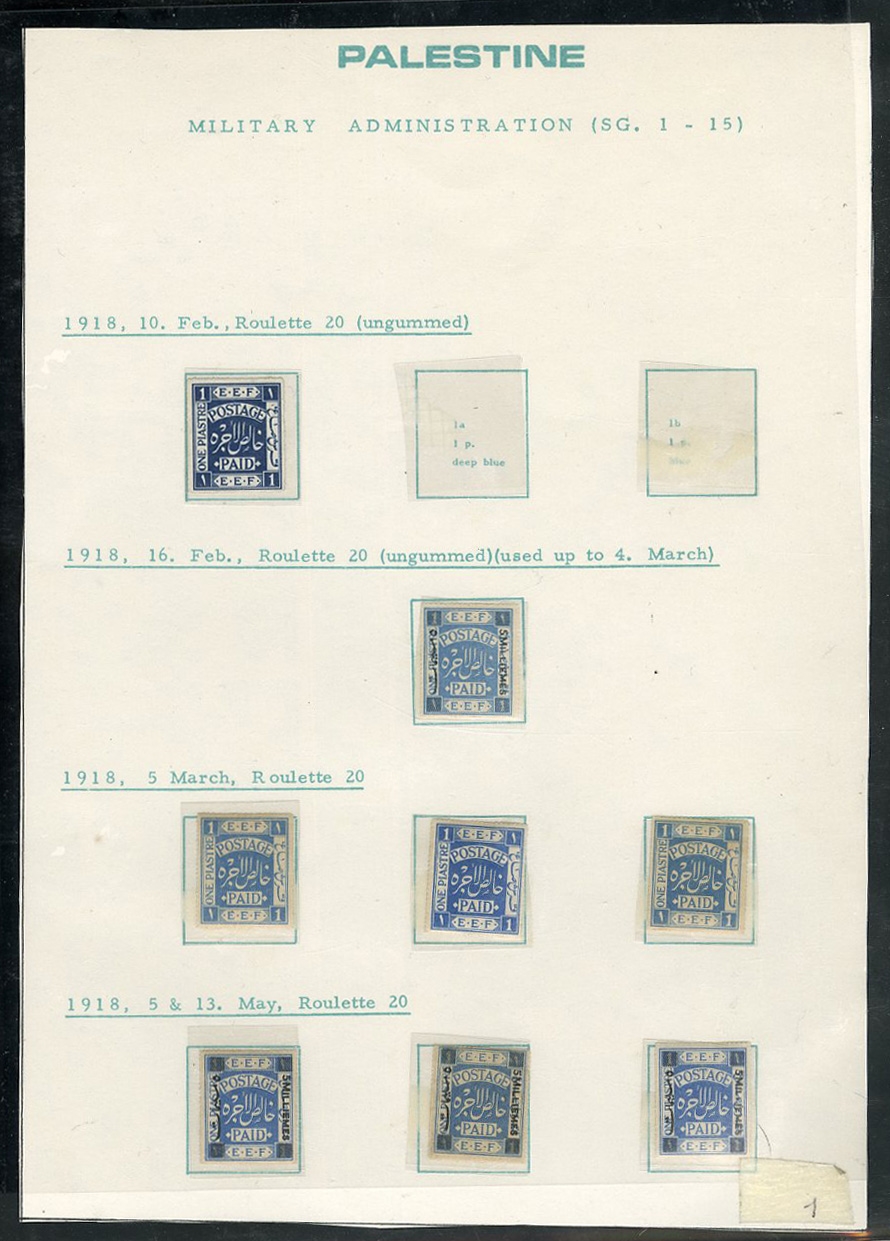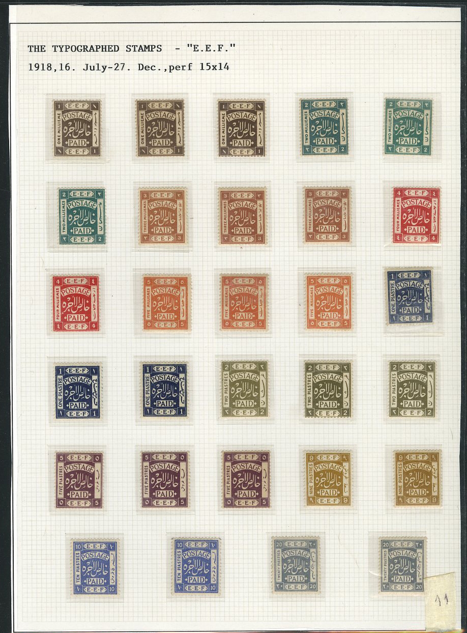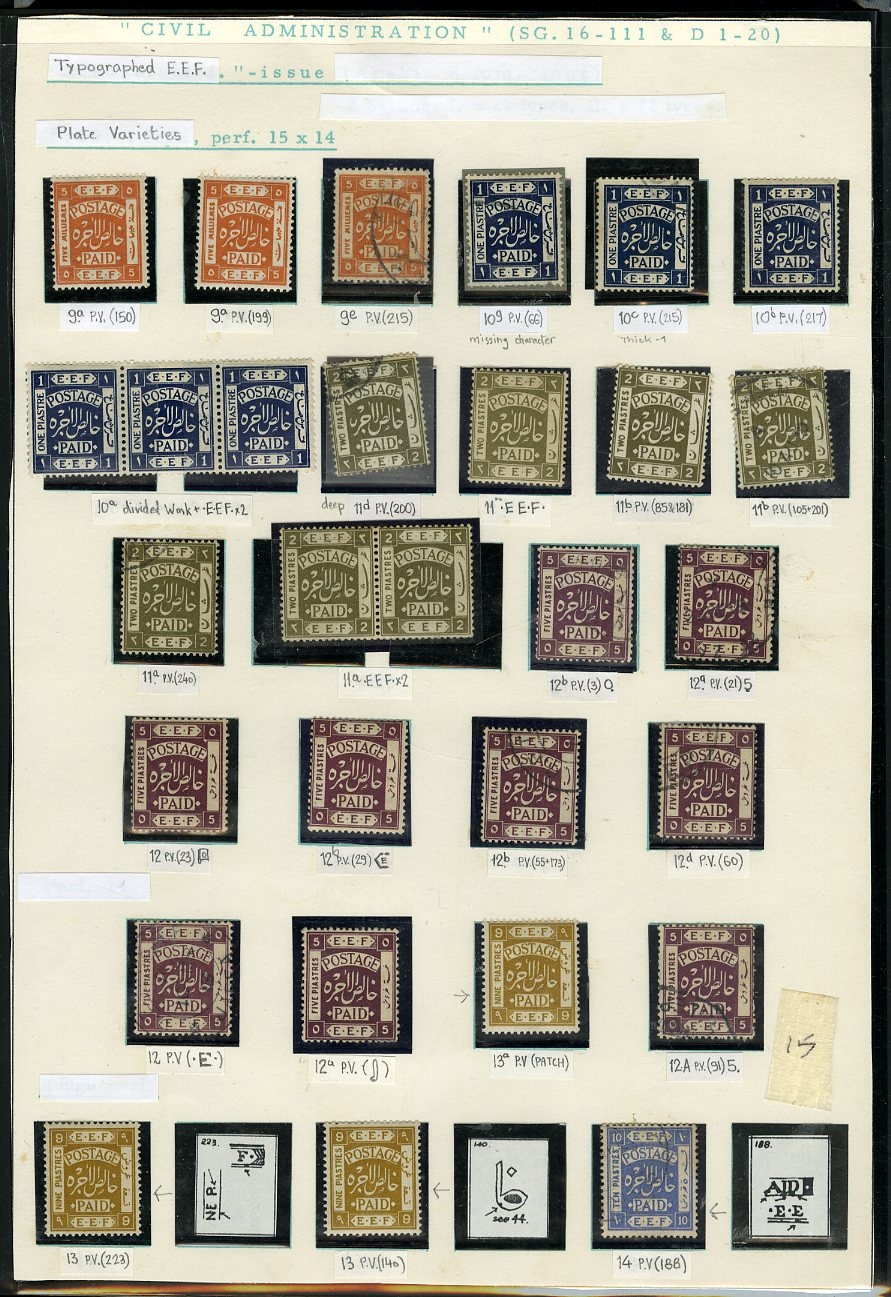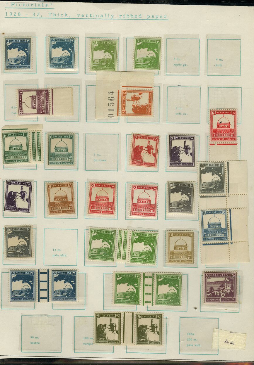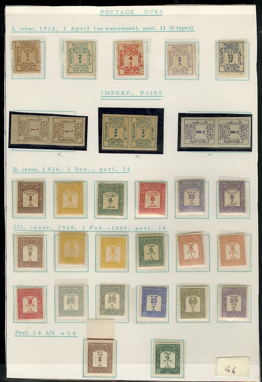 1414 og   imagePALESTINE 1918-45 specialized collection neatly organized on pages, fairly complete, better early items include 1918 1pi deep blue, control block of four, 5m on 1pi cobalt blue (with Muentz certificate), multiple E.E.F., Jerusalem issues and London Issues, with shades and varieties noted (including plate varieties, perforations, etc.), some multiples including 1927-42 issue in gutter pairs, Postage Dues including 1923 1m, 2m and 8m imperf. proof pairs, mostly hinged (some unused and used noted), small flaws possible, generally fine-v.f., an ideal lot for a specialist (Image) (Image 2) (Image 3) (Image 4) (Image 5) (Image 6) (Image 7) (Image 8) (Image 9) (Image 10) (Image 11) (Image 12) (Image 13) (Image 14) (Image 15) (Image 16) (Image 17) (Image 18) (Image 19) (Image 20) (Image 21) (Image 22) (Image 23) (Image 24) (Image 25) (Image 26) (Image 27) (Image 28) (Image 29) (Image 30) (Image 31) (Image 32) (Image 33) (Image 34) (Image 35) (All Images)
