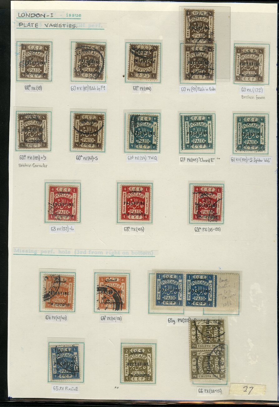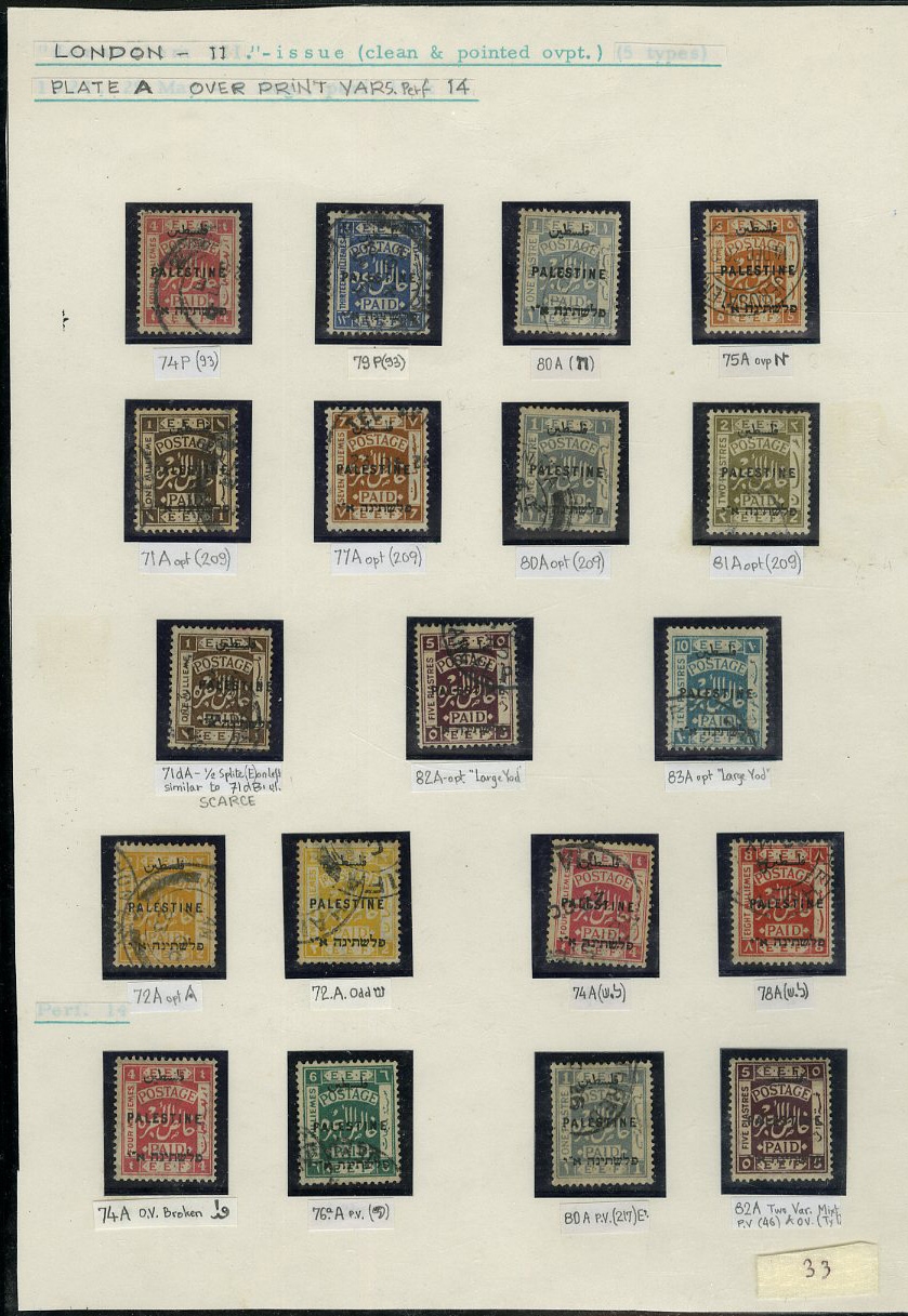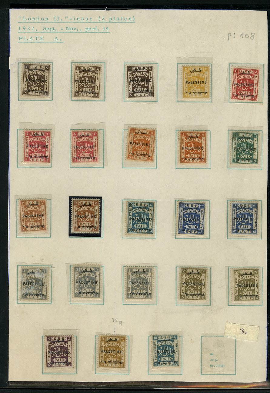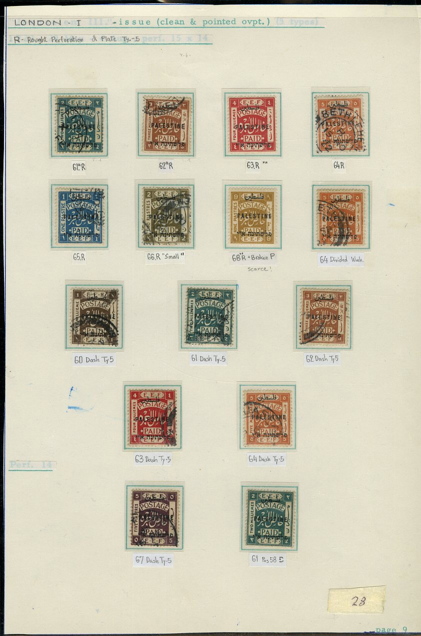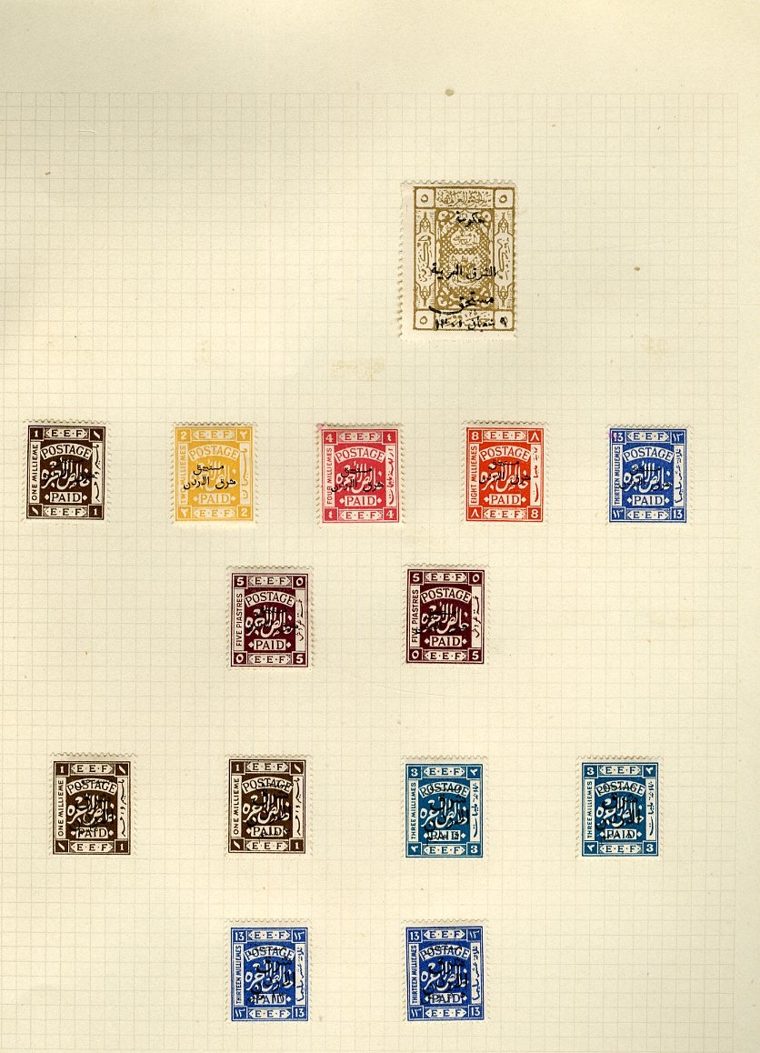 1414 og   imagePALESTINE 1918-45 specialized collection neatly organized on pages, fairly complete, better early items include 1918 1pi deep blue, control block of four, 5m on 1pi cobalt blue (with Muentz certificate), multiple E.E.F., Jerusalem issues and London Issues, with shades and varieties noted (including plate varieties, perforations, etc.), some multiples including 1927-42 issue in gutter pairs, Postage Dues including 1923 1m, 2m and 8m imperf. proof pairs, mostly hinged (some unused and used noted), small flaws possible, generally fine-v.f., an ideal lot for a specialist (Image) (Image 2) (Image 3) (Image 4) (Image 5) (Image 6) (Image 7) (Image 8) (Image 9) (Image 10) (Image 11) (Image 12) (Image 13) (Image 14) (Image 15) (Image 16) (Image 17) (Image 18) (Image 19) (Image 20) (Image 21) (Image 22) (Image 23) (Image 24) (Image 25) (Image 26) (Image 27) (Image 28) (Image 29) (Image 30) (Image 31) (Image 32) (Image 33) (Image 34) (Image 35) (All Images)
