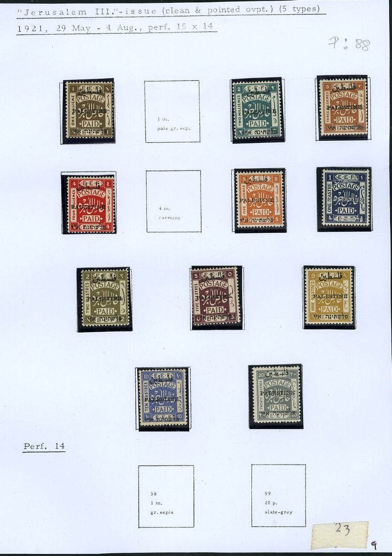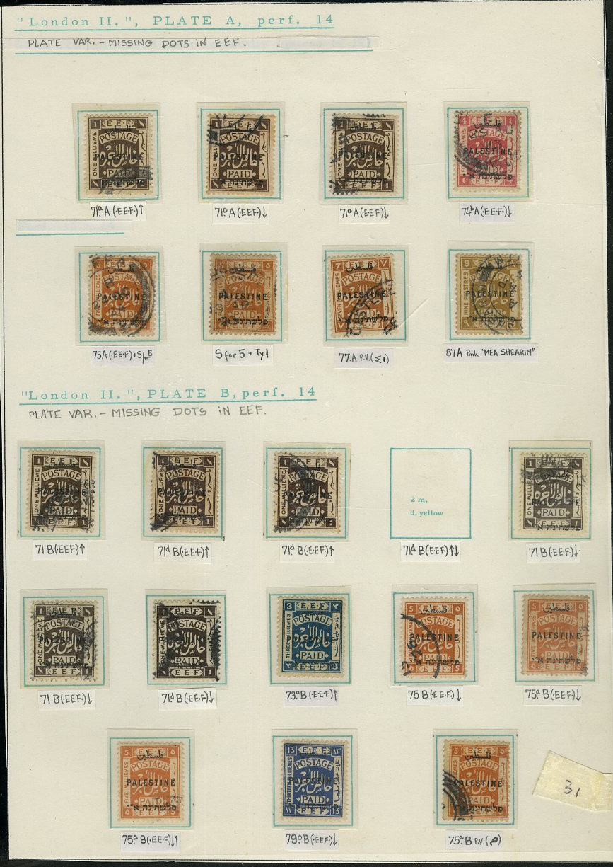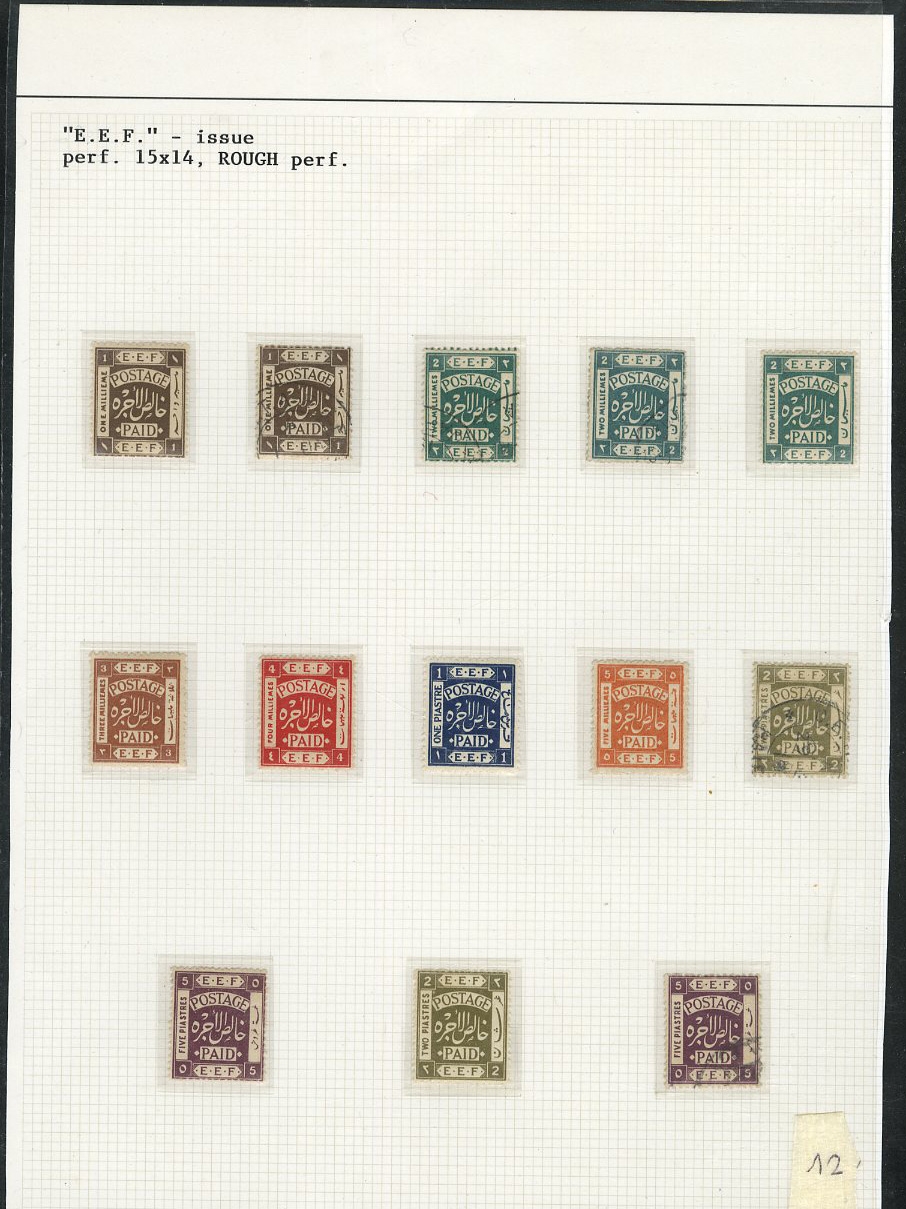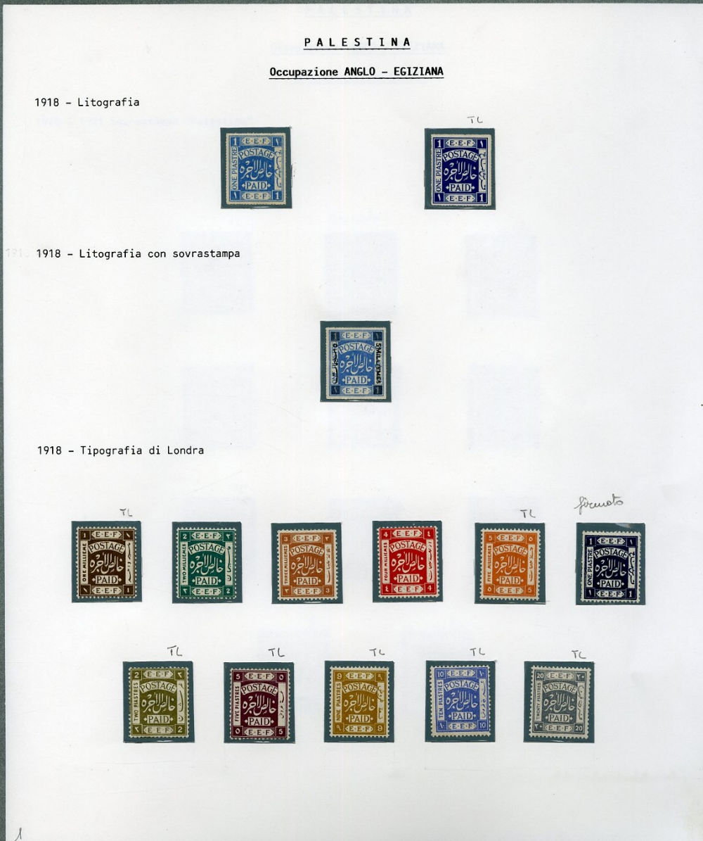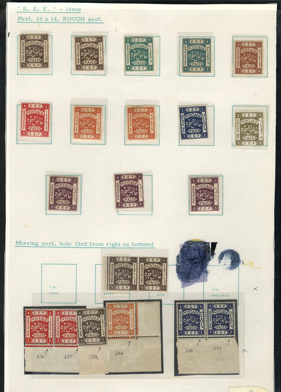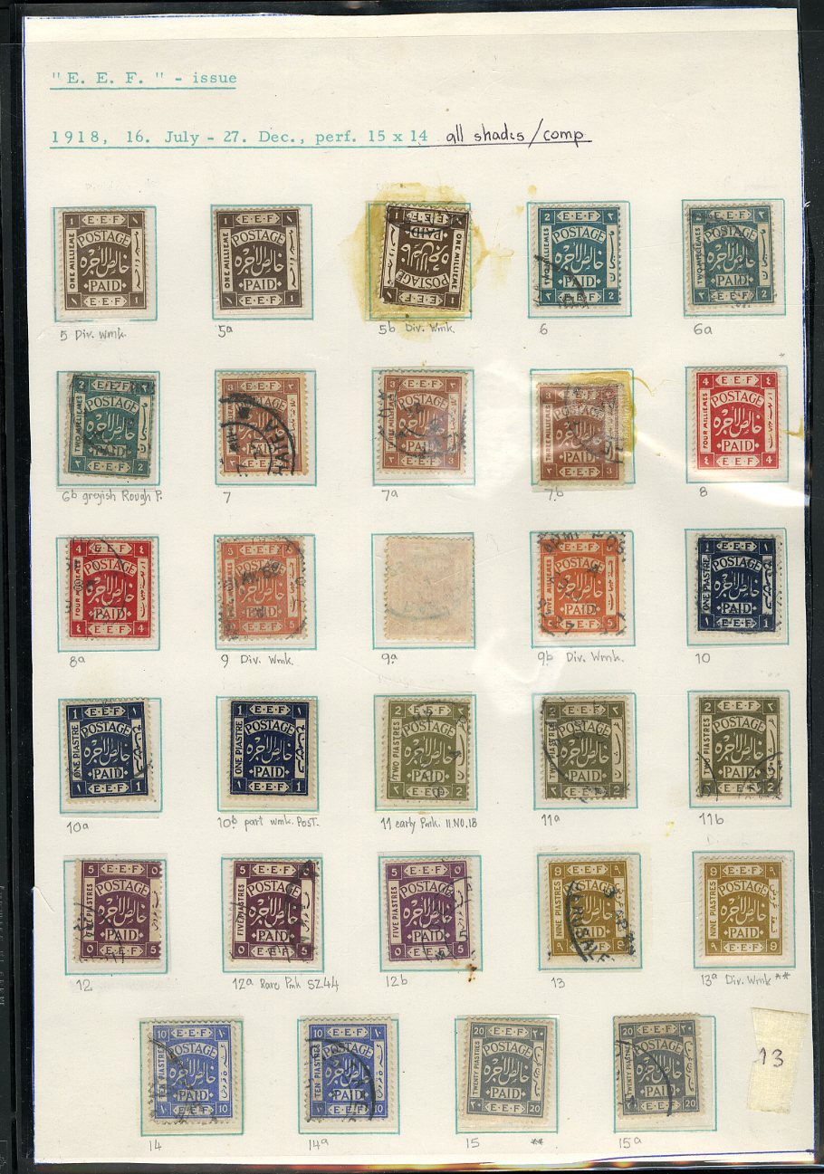 1414 og   imagePALESTINE 1918-45 specialized collection neatly organized on pages, fairly complete, better early items include 1918 1pi deep blue, control block of four, 5m on 1pi cobalt blue (with Muentz certificate), multiple E.E.F., Jerusalem issues and London Issues, with shades and varieties noted (including plate varieties, perforations, etc.), some multiples including 1927-42 issue in gutter pairs, Postage Dues including 1923 1m, 2m and 8m imperf. proof pairs, mostly hinged (some unused and used noted), small flaws possible, generally fine-v.f., an ideal lot for a specialist (Image) (Image 2) (Image 3) (Image 4) (Image 5) (Image 6) (Image 7) (Image 8) (Image 9) (Image 10) (Image 11) (Image 12) (Image 13) (Image 14) (Image 15) (Image 16) (Image 17) (Image 18) (Image 19) (Image 20) (Image 21) (Image 22) (Image 23) (Image 24) (Image 25) (Image 26) (Image 27) (Image 28) (Image 29) (Image 30) (Image 31) (Image 32) (Image 33) (Image 34) (Image 35) (All Images)