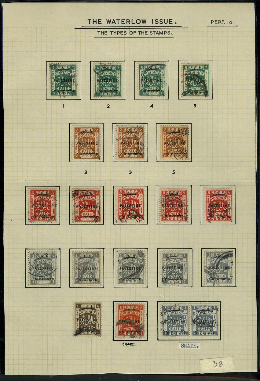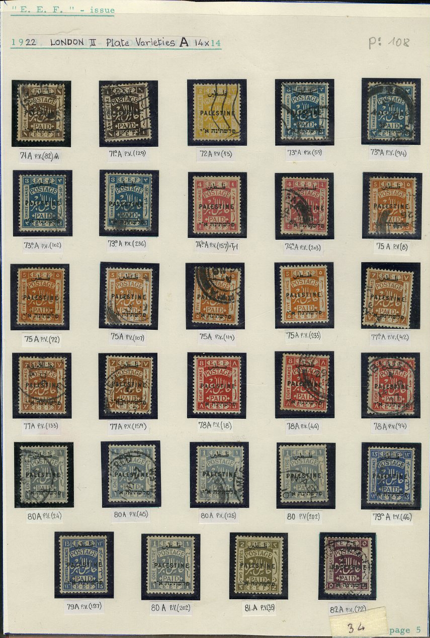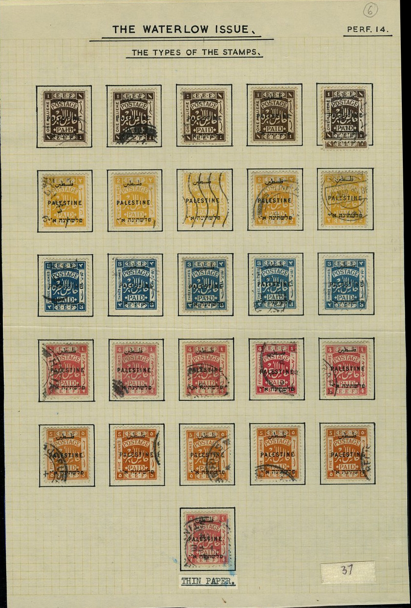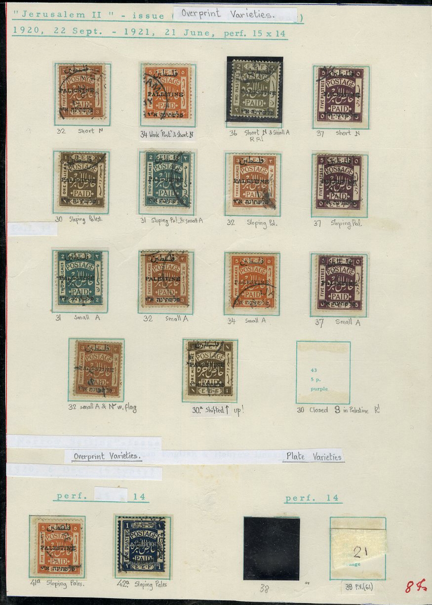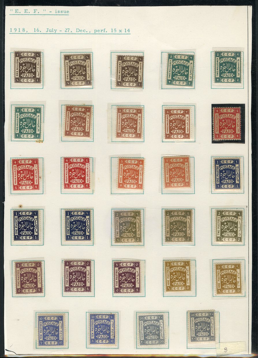 1414 og   imagePALESTINE 1918-45 specialized collection neatly organized on pages, fairly complete, better early items include 1918 1pi deep blue, control block of four, 5m on 1pi cobalt blue (with Muentz certificate), multiple E.E.F., Jerusalem issues and London Issues, with shades and varieties noted (including plate varieties, perforations, etc.), some multiples including 1927-42 issue in gutter pairs, Postage Dues including 1923 1m, 2m and 8m imperf. proof pairs, mostly hinged (some unused and used noted), small flaws possible, generally fine-v.f., an ideal lot for a specialist (Image) (Image 2) (Image 3) (Image 4) (Image 5) (Image 6) (Image 7) (Image 8) (Image 9) (Image 10) (Image 11) (Image 12) (Image 13) (Image 14) (Image 15) (Image 16) (Image 17) (Image 18) (Image 19) (Image 20) (Image 21) (Image 22) (Image 23) (Image 24) (Image 25) (Image 26) (Image 27) (Image 28) (Image 29) (Image 30) (Image 31) (Image 32) (Image 33) (Image 34) (Image 35) (All Images)