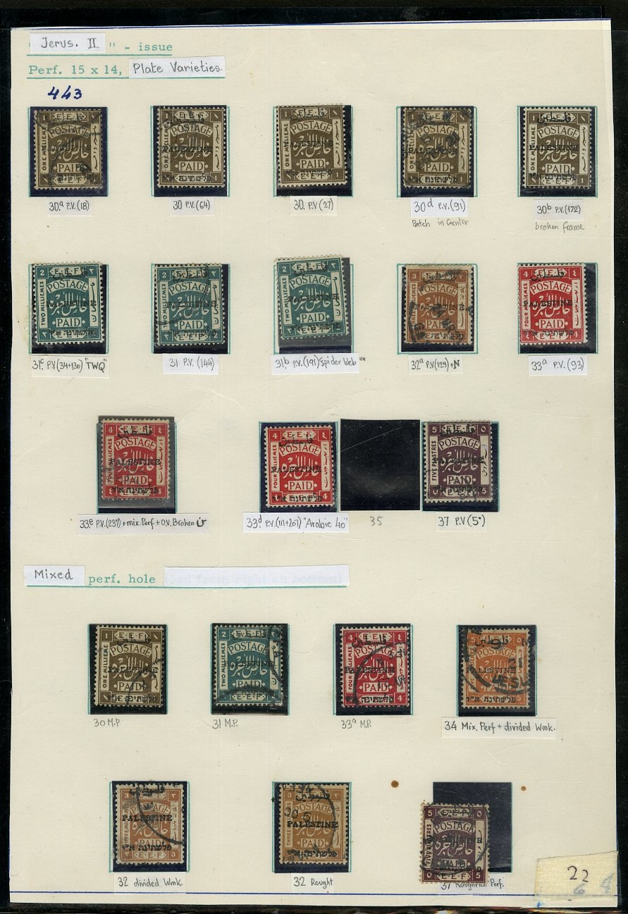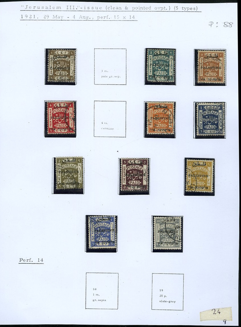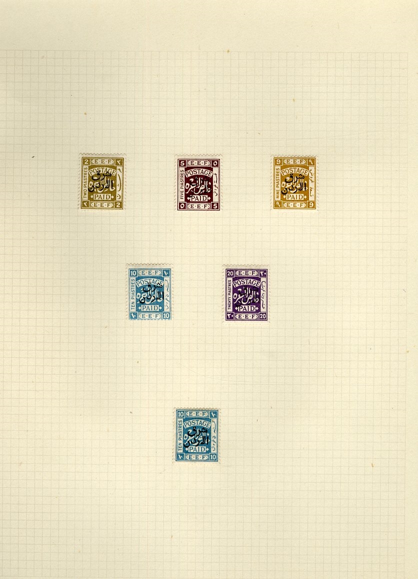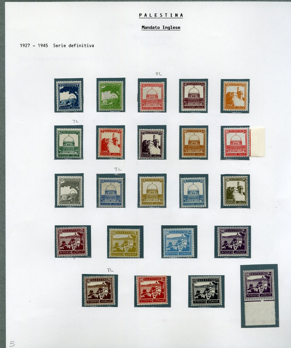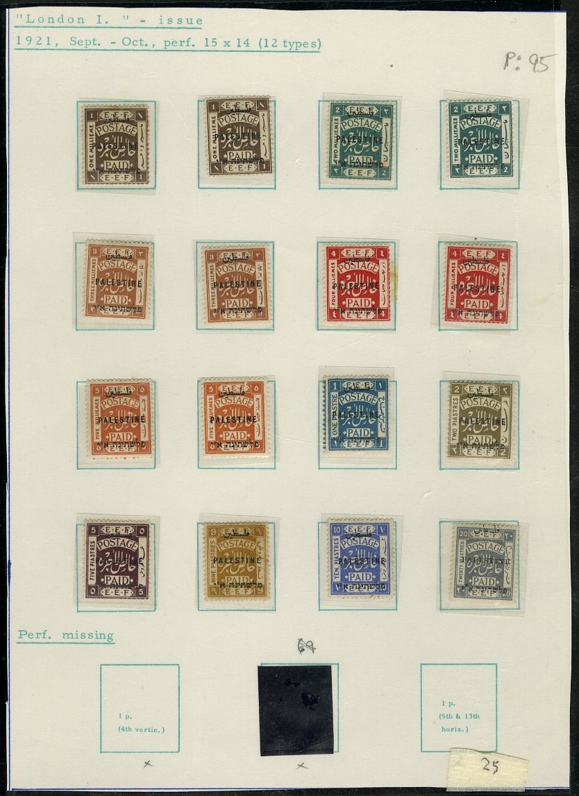 1414 og   imagePALESTINE 1918-45 specialized collection neatly organized on pages, fairly complete, better early items include 1918 1pi deep blue, control block of four, 5m on 1pi cobalt blue (with Muentz certificate), multiple E.E.F., Jerusalem issues and London Issues, with shades and varieties noted (including plate varieties, perforations, etc.), some multiples including 1927-42 issue in gutter pairs, Postage Dues including 1923 1m, 2m and 8m imperf. proof pairs, mostly hinged (some unused and used noted), small flaws possible, generally fine-v.f., an ideal lot for a specialist (Image) (Image 2) (Image 3) (Image 4) (Image 5) (Image 6) (Image 7) (Image 8) (Image 9) (Image 10) (Image 11) (Image 12) (Image 13) (Image 14) (Image 15) (Image 16) (Image 17) (Image 18) (Image 19) (Image 20) (Image 21) (Image 22) (Image 23) (Image 24) (Image 25) (Image 26) (Image 27) (Image 28) (Image 29) (Image 30) (Image 31) (Image 32) (Image 33) (Image 34) (Image 35) (All Images)