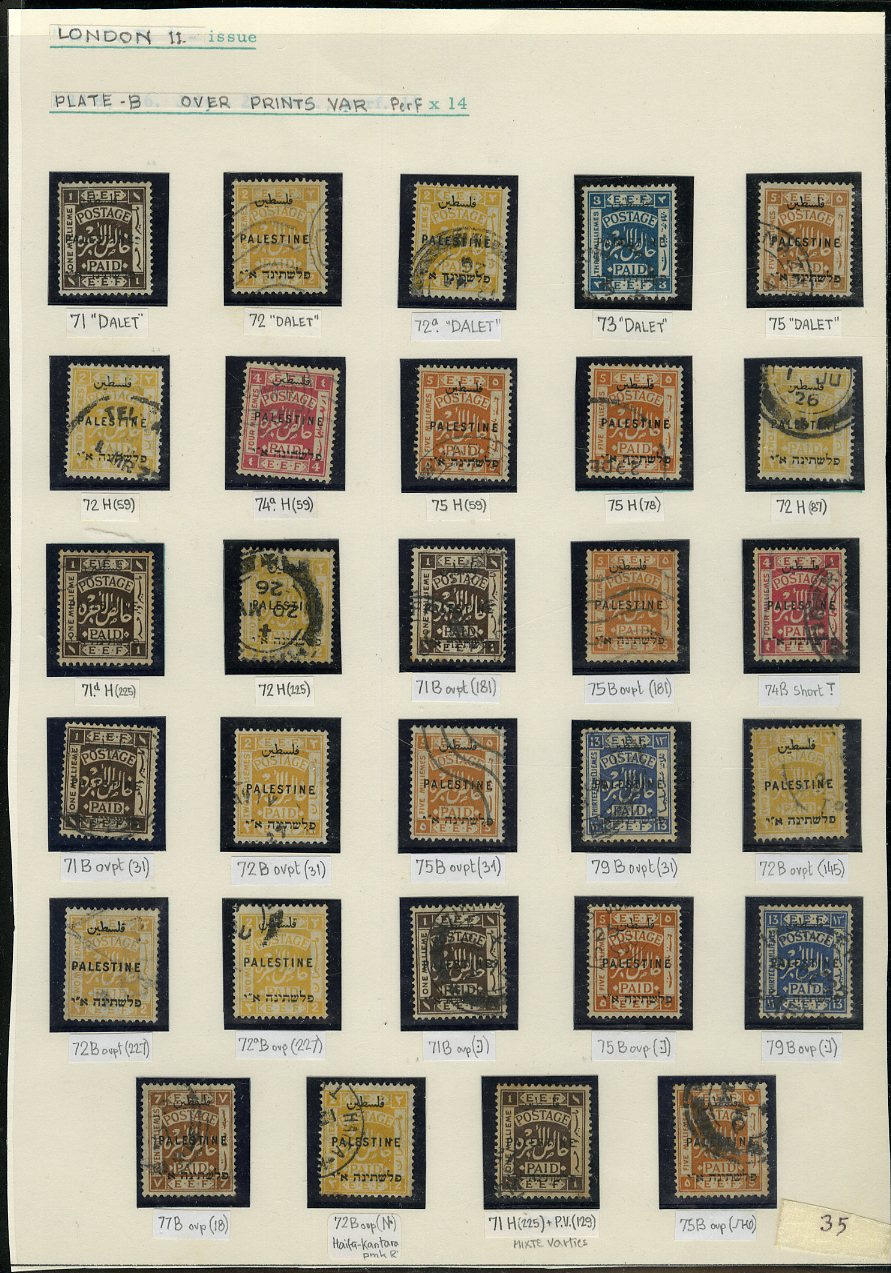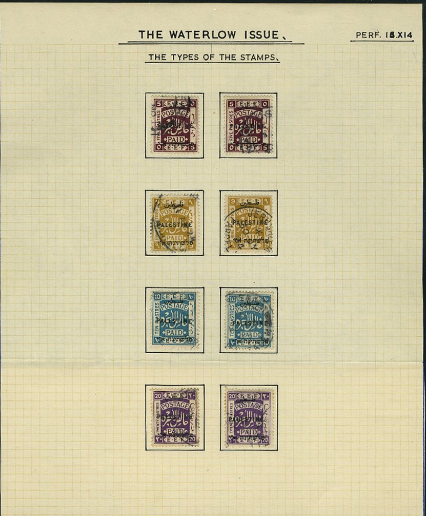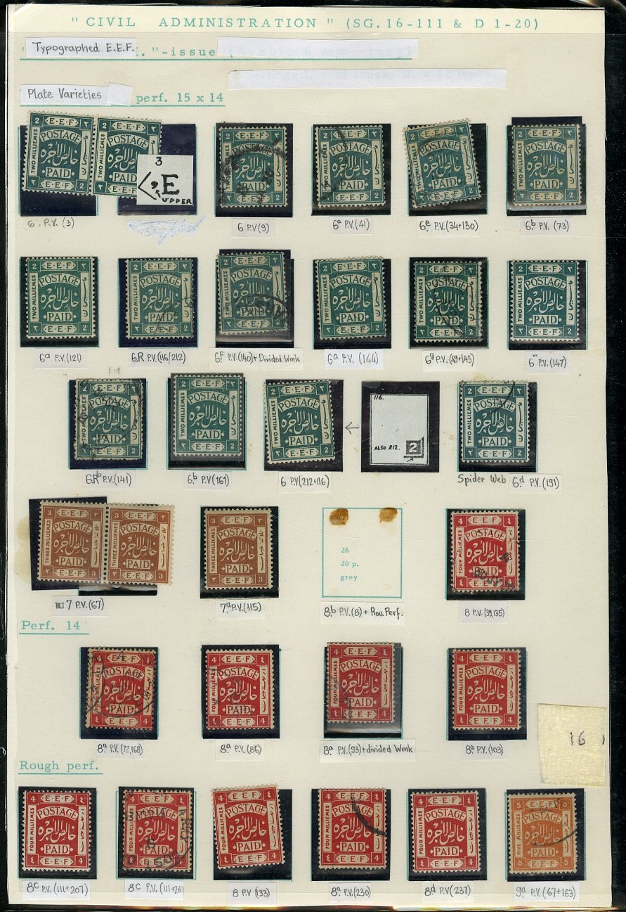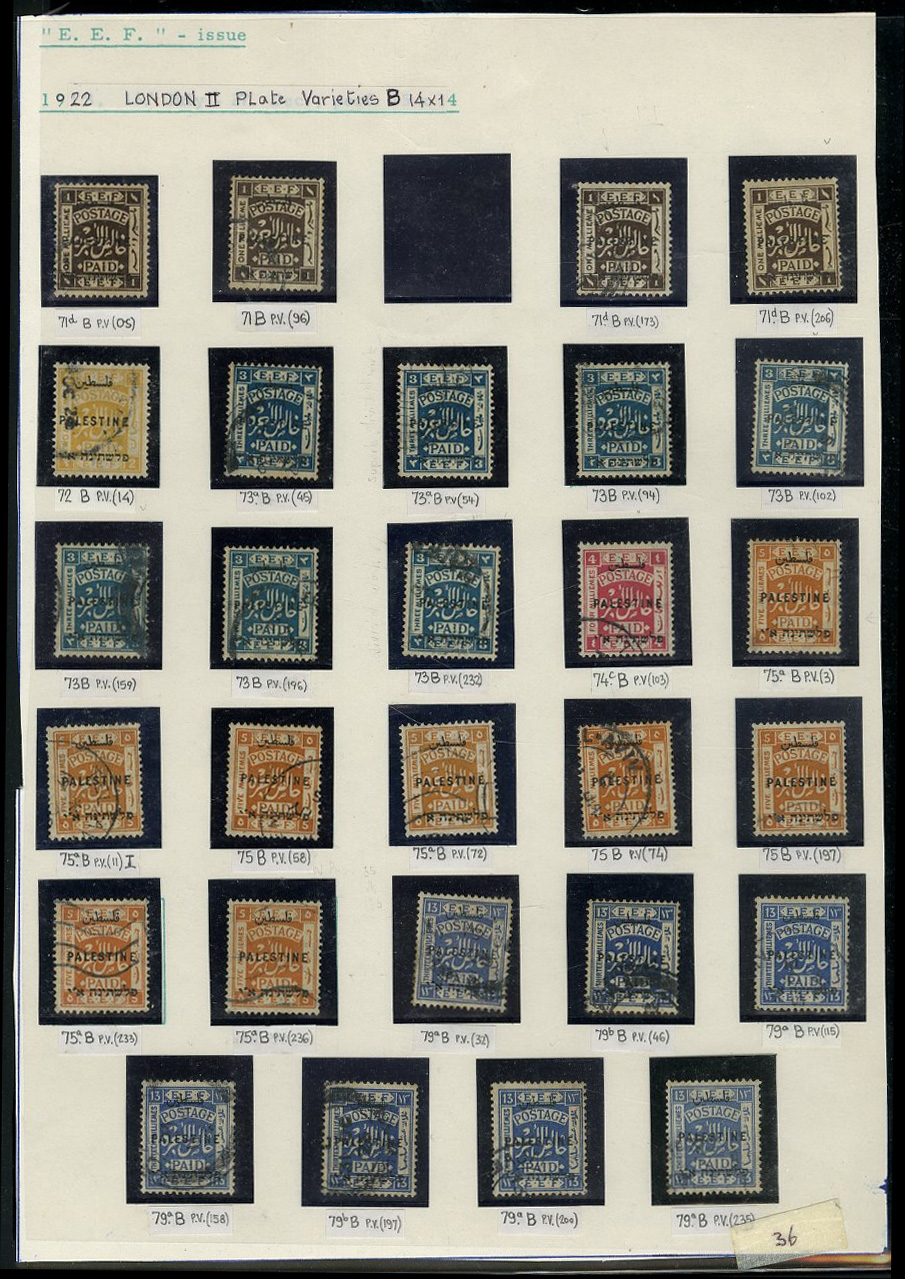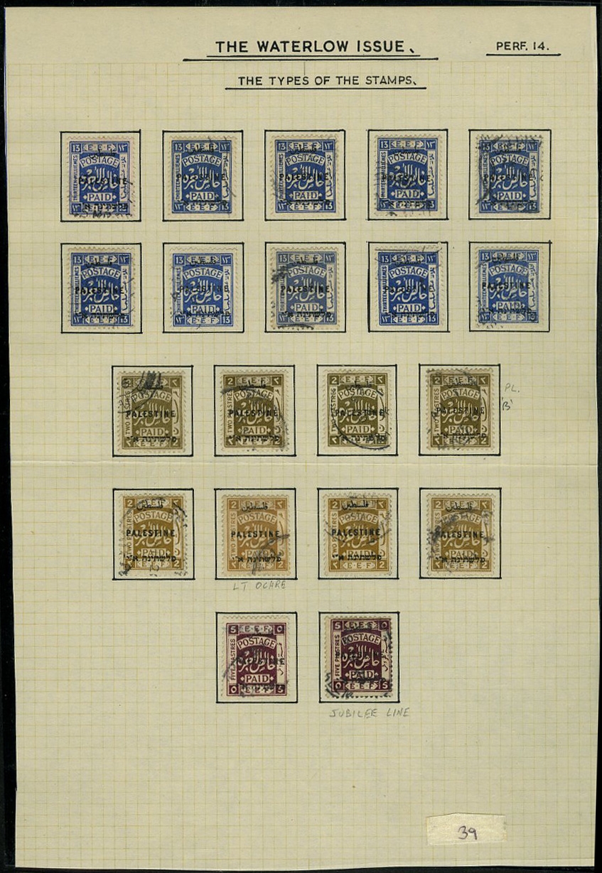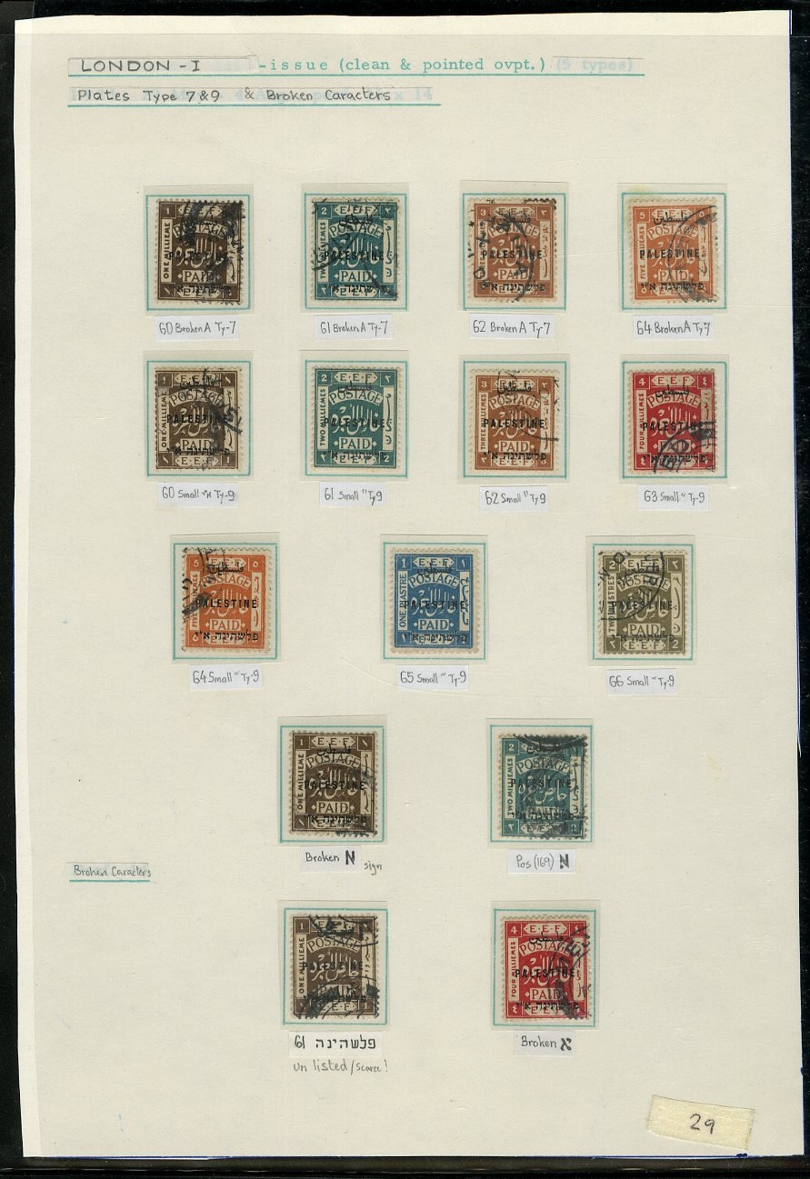 1414 og   imagePALESTINE 1918-45 specialized collection neatly organized on pages, fairly complete, better early items include 1918 1pi deep blue, control block of four, 5m on 1pi cobalt blue (with Muentz certificate), multiple E.E.F., Jerusalem issues and London Issues, with shades and varieties noted (including plate varieties, perforations, etc.), some multiples including 1927-42 issue in gutter pairs, Postage Dues including 1923 1m, 2m and 8m imperf. proof pairs, mostly hinged (some unused and used noted), small flaws possible, generally fine-v.f., an ideal lot for a specialist (Image) (Image 2) (Image 3) (Image 4) (Image 5) (Image 6) (Image 7) (Image 8) (Image 9) (Image 10) (Image 11) (Image 12) (Image 13) (Image 14) (Image 15) (Image 16) (Image 17) (Image 18) (Image 19) (Image 20) (Image 21) (Image 22) (Image 23) (Image 24) (Image 25) (Image 26) (Image 27) (Image 28) (Image 29) (Image 30) (Image 31) (Image 32) (Image 33) (Image 34) (Image 35) (All Images)