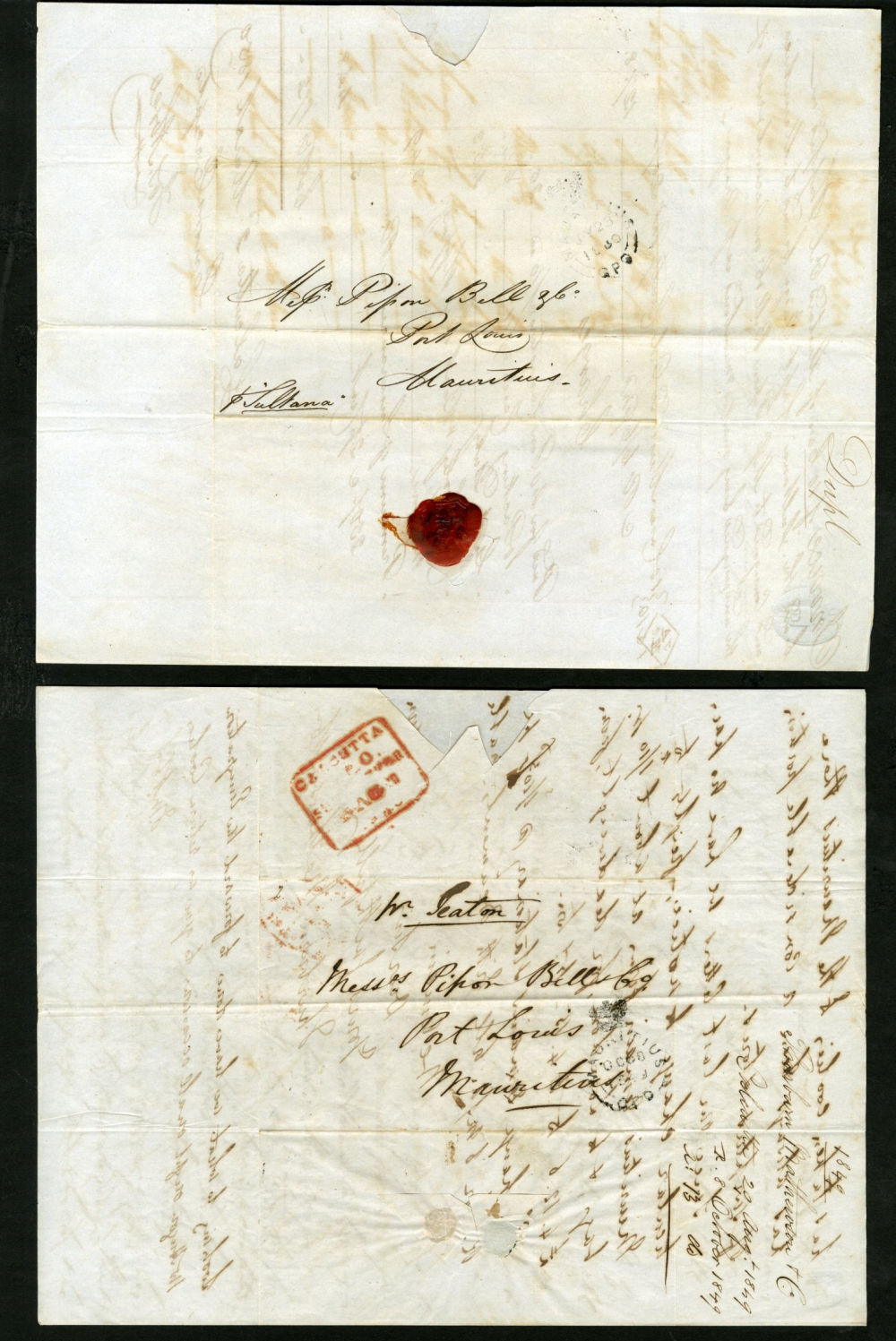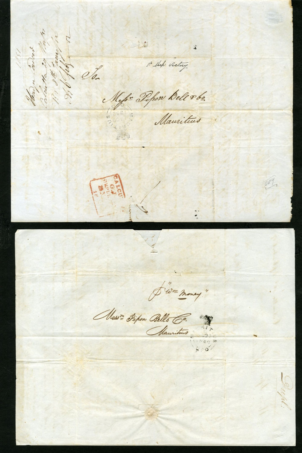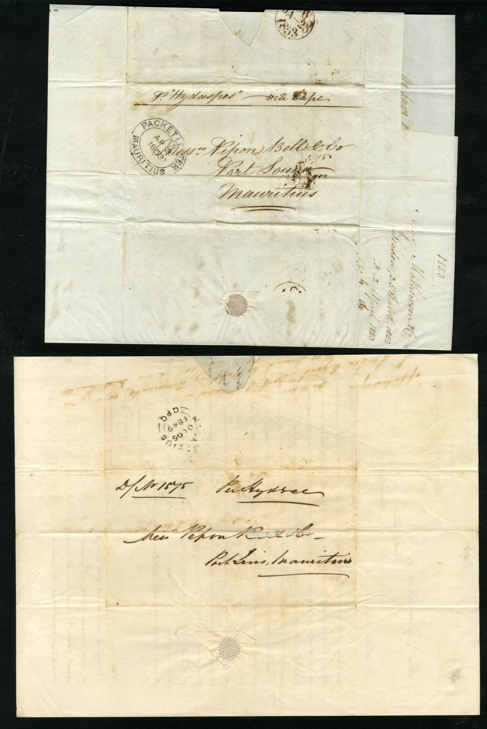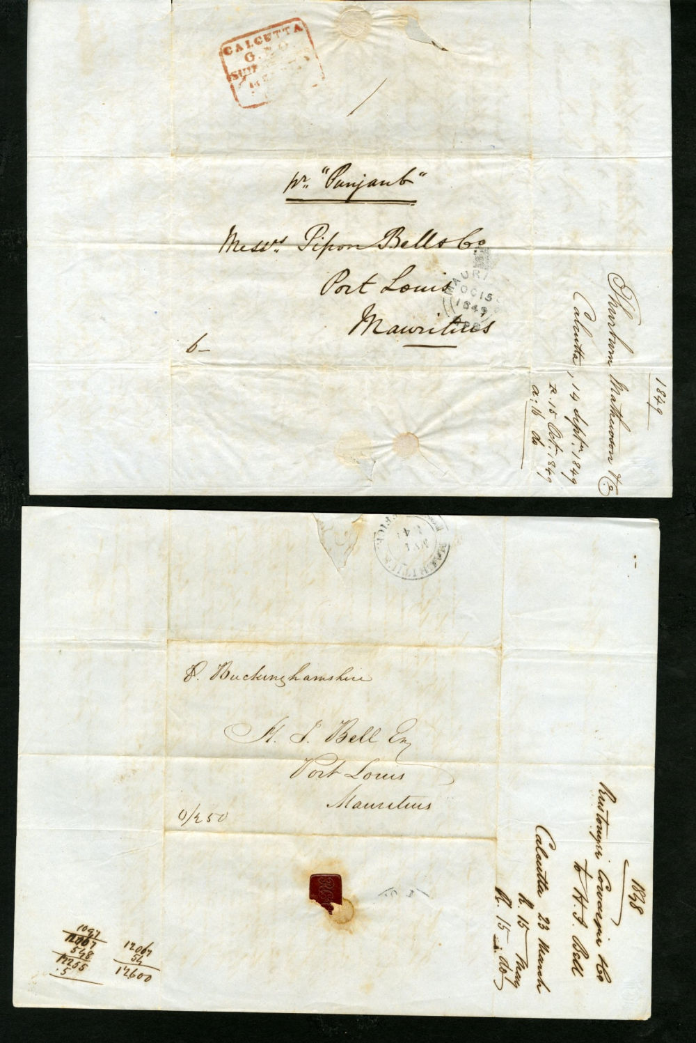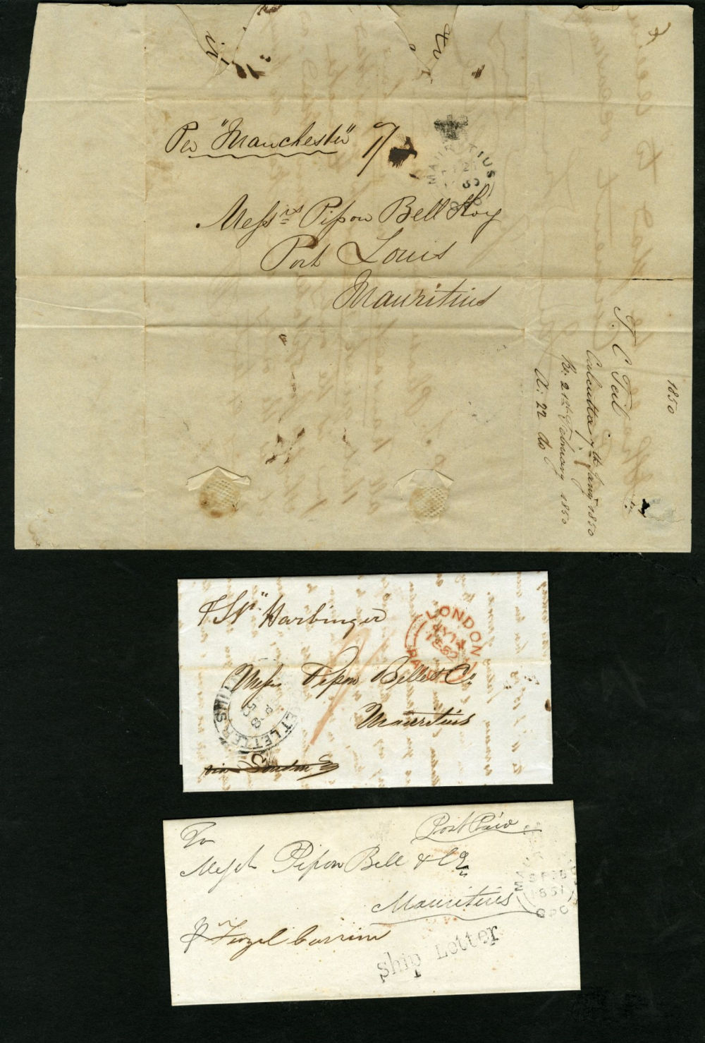 1404 COVER   imageMAURITIUS 1849-62 original correspondence of 93 FLs, all incoming mail to "Pippon Bell & Co" in Port Louis, Mauritius, mostly from London, Liverpool, Calcutta, etc., variety of markings including "Packet Letter Mauritius", Crowned Circle "Mauritius GPO", "Ship Letter", different ship endorsements, departure markings, etc., some toning, filing creases and ageing, mostly fine. An interesting archive and a useful insight into the study of Mauritius postal history (Image) (Image 2) (Image 3) (Image 4) (Image 5) (All Images)