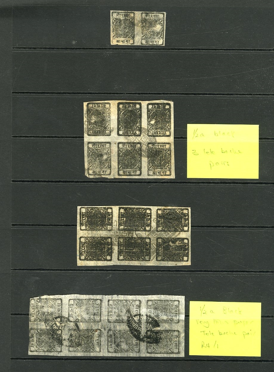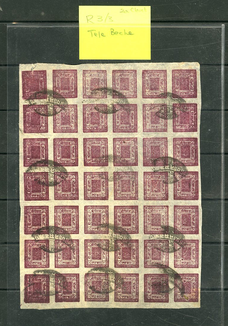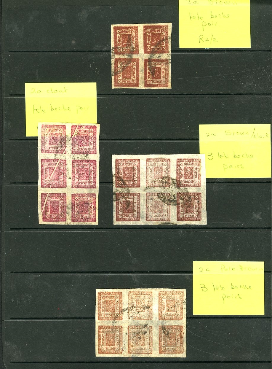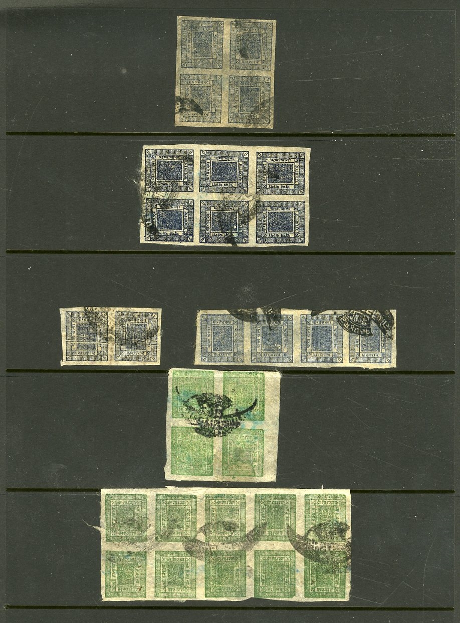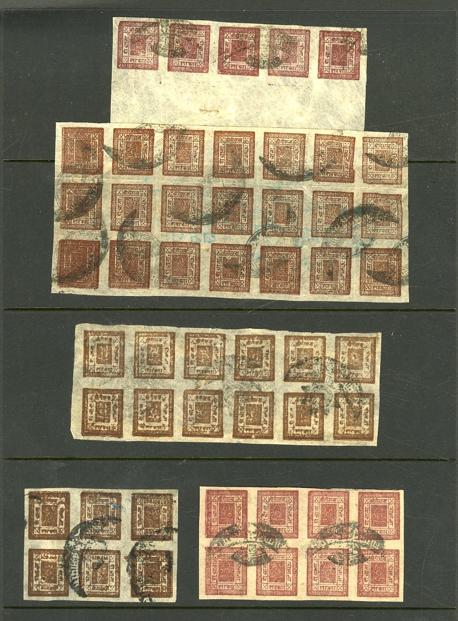 1408 O   imageNEPAL 1898-1917 group of used Sripech issue in multiples, with paper and shade varieties, 1a blue in blocks of 4 and 6, strip of 4 and a pair, 2a claret and 2a brown with 5 blocks of 6, 8, 12, 21, a strip of 5 and a pane of 42, with a number of tete beche pairs, paper fold and flaw varieties, 4a green blocks of 4 and 10, and 1899-1917 Siva''s Bow 1/2a black, blocks of 6 (2) and 8 and a pair with tete-beche varieties, mixed condition, interesting lot, with a specialist appeal (Image) (Image 2) (Image 3) (Image 4) (Image 5) (All Images)