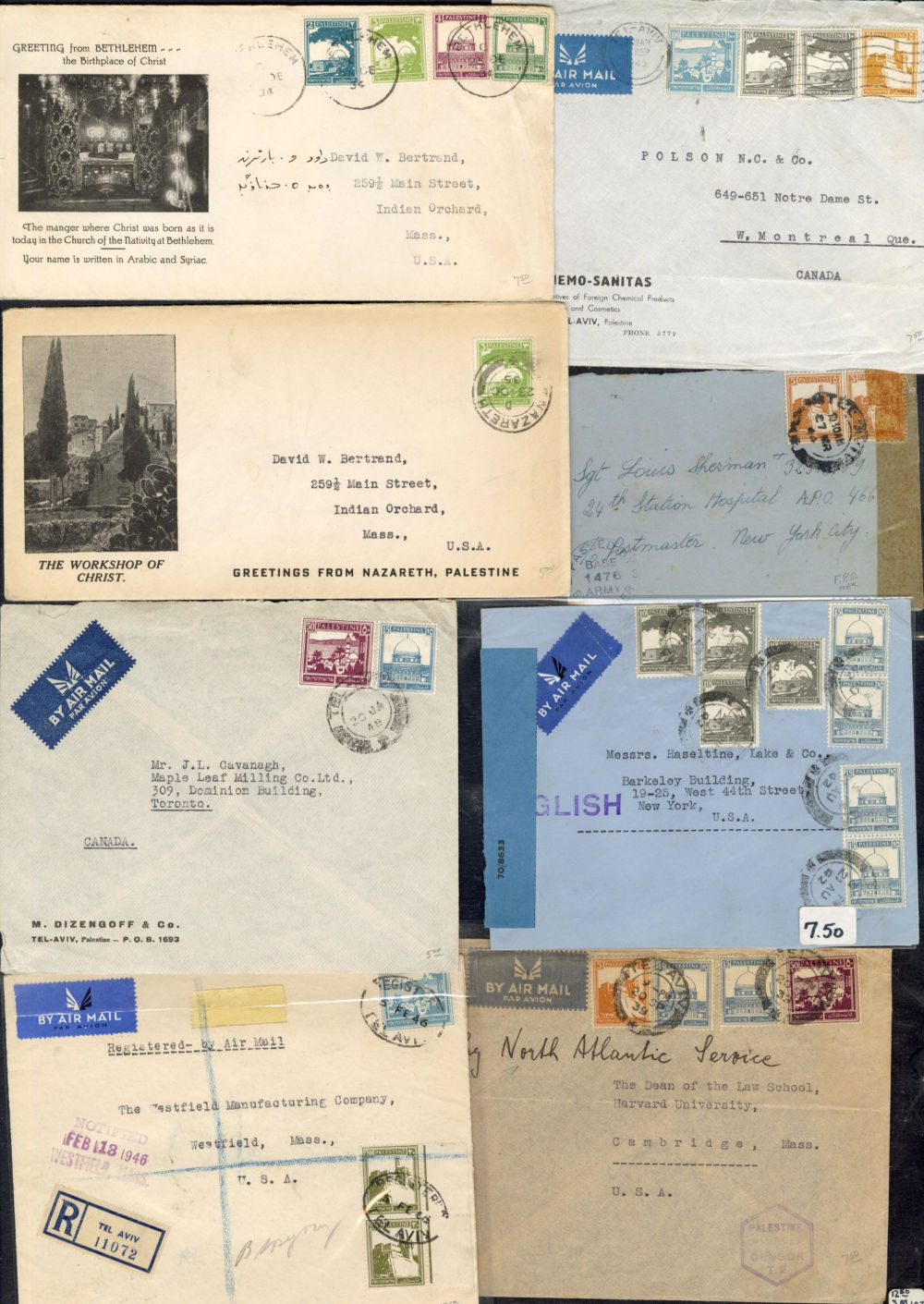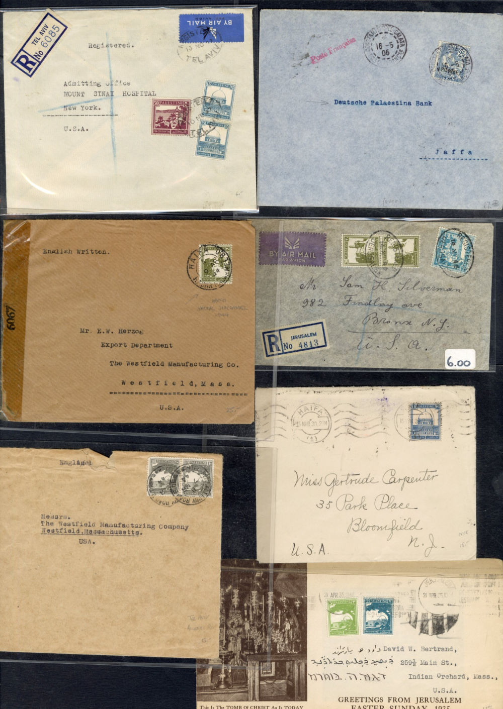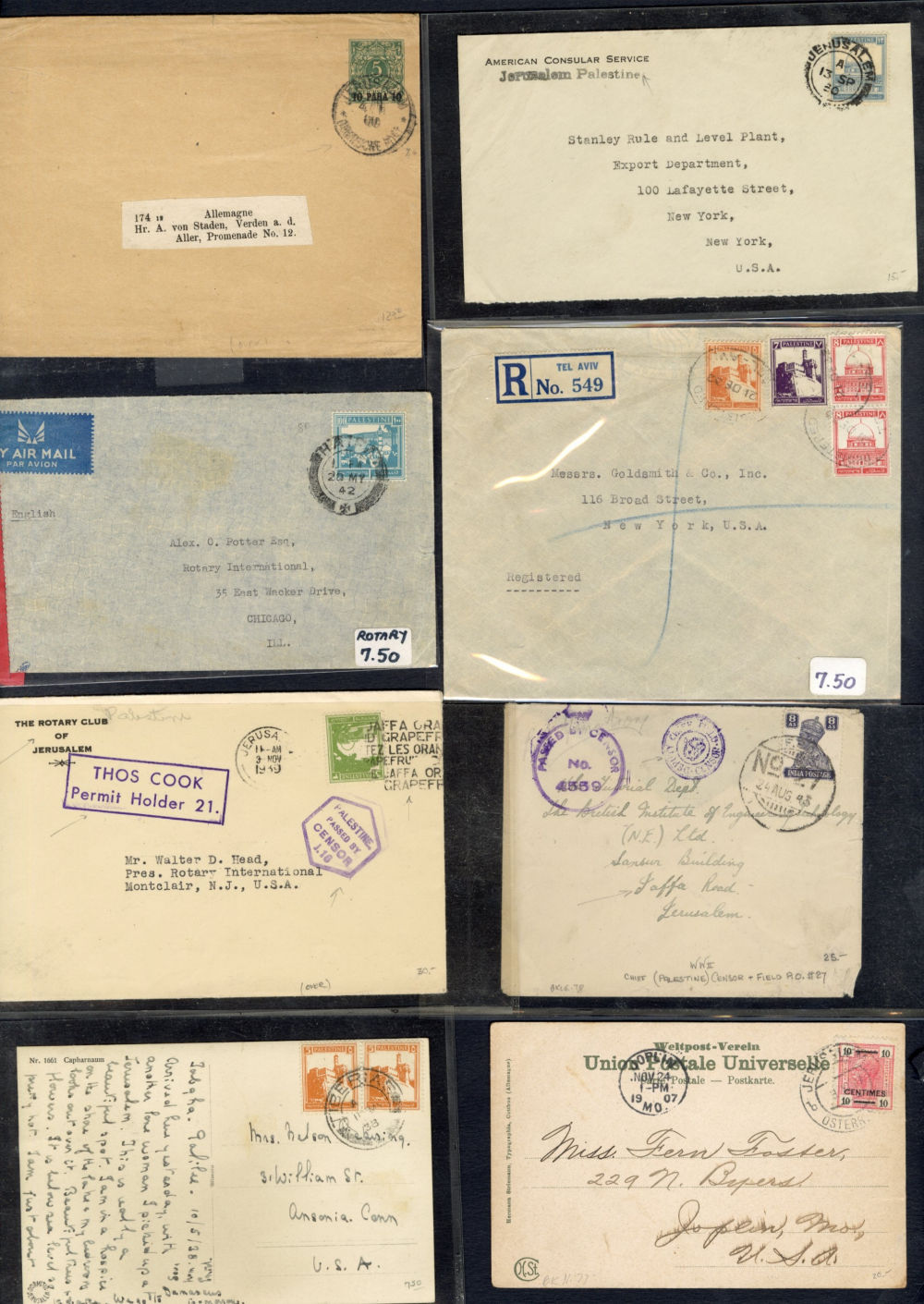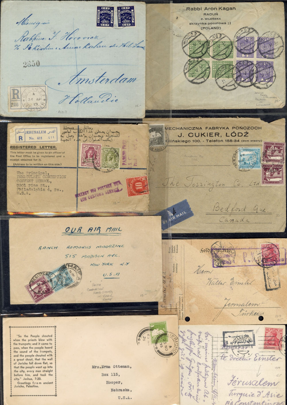1411 COVER   imagePALESTINE 1900-40s selection of 60+ covers or cards, mostly British Mandate franking, some Registered mail, flights, censored, variety of destinations, some German and French Forerunner covers, few miscellaneous items, mostly fine or better (Image) (Image 2) (Image 3) (Image 4) (Image 5) (Image 6) (Image 7) (Image 8) (Image 9) (Image 10) (All Images)